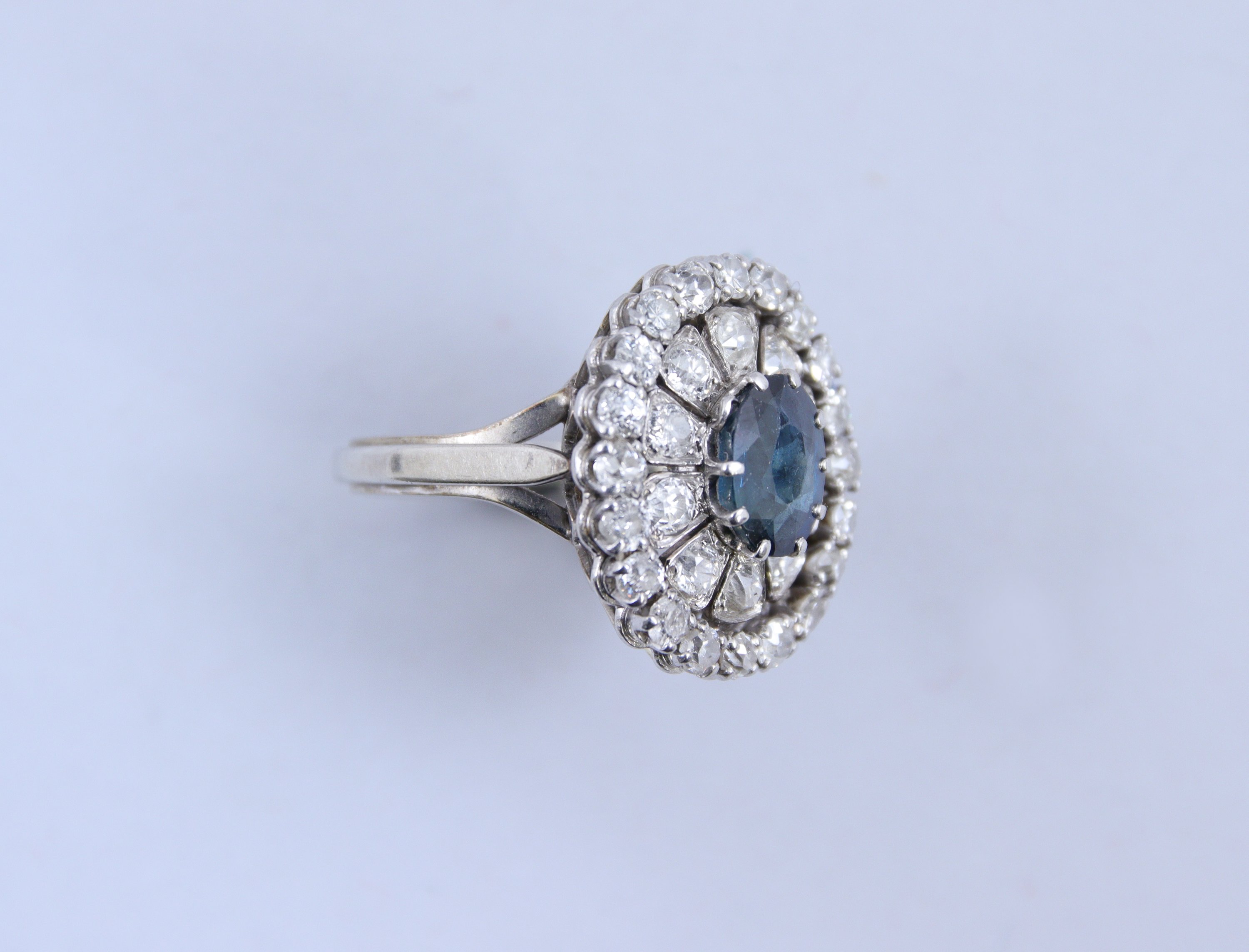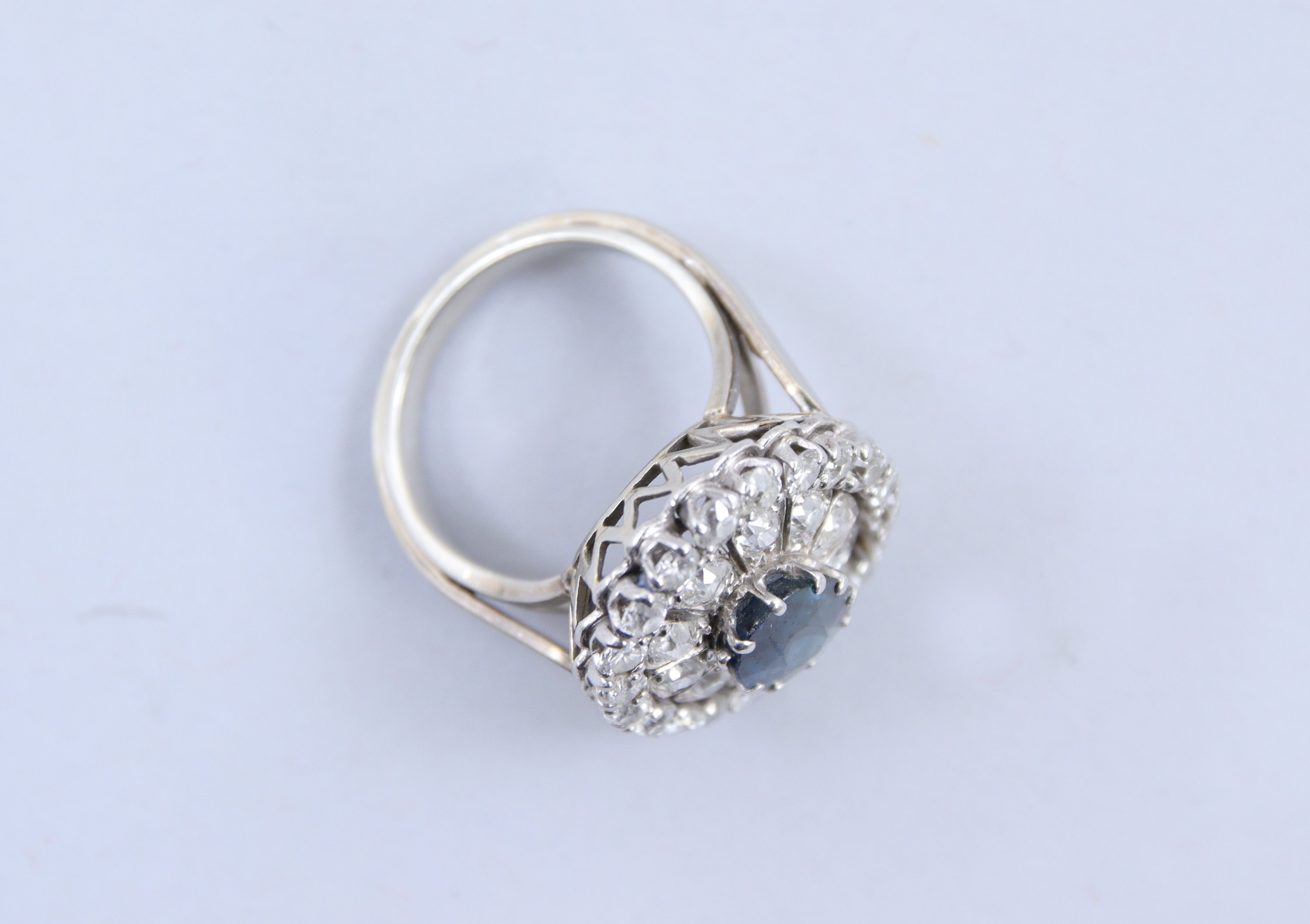 en or gris 750 millièmes et platine, ornée d'un saphir bleu de taille ovale dans un entourage rayonnant à double couronne de 10 et 20 diamants de taille brillant (poids total: environ 0,8 carat).