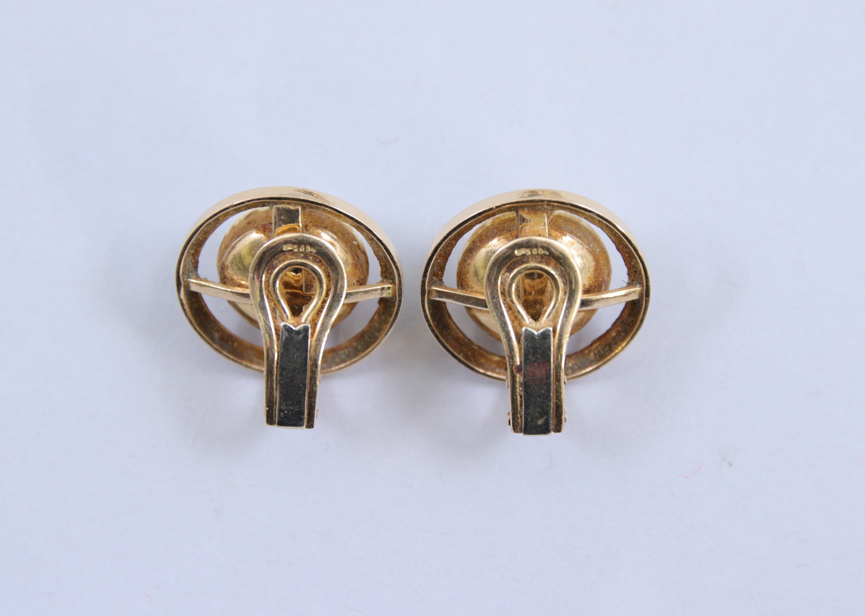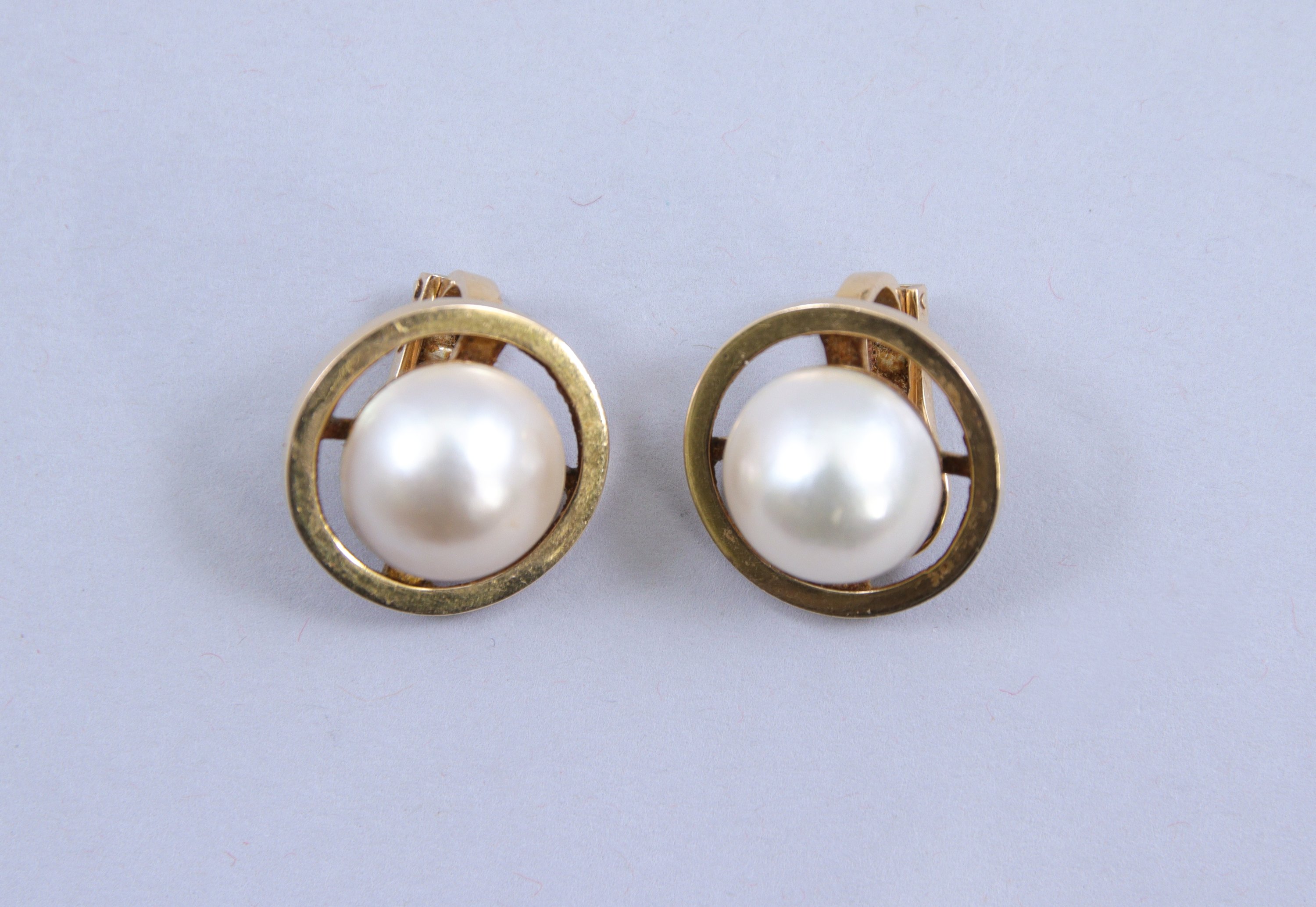 - Travail italien. Paire de clips d'oreilles en or jaune 500 millièmes de forme circulaire ornés chacun d'une demi perle. Numéroé "695"? Diam. 20 mm.