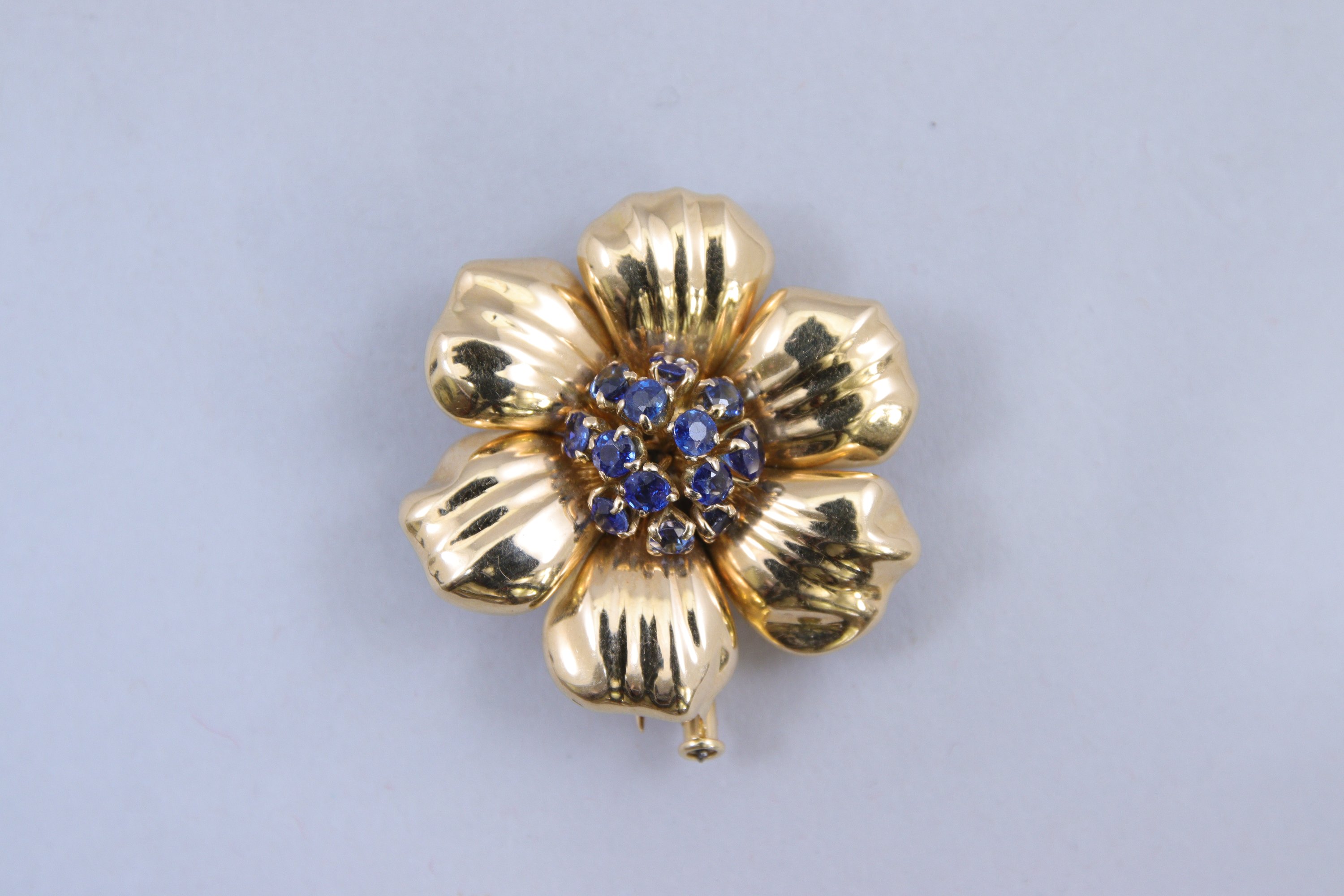 en or jaune 750 millièmes, en forme de fleurs à six pétales et le centre orné de 12 saphirs bleus (env. 0,10 ct)?.
