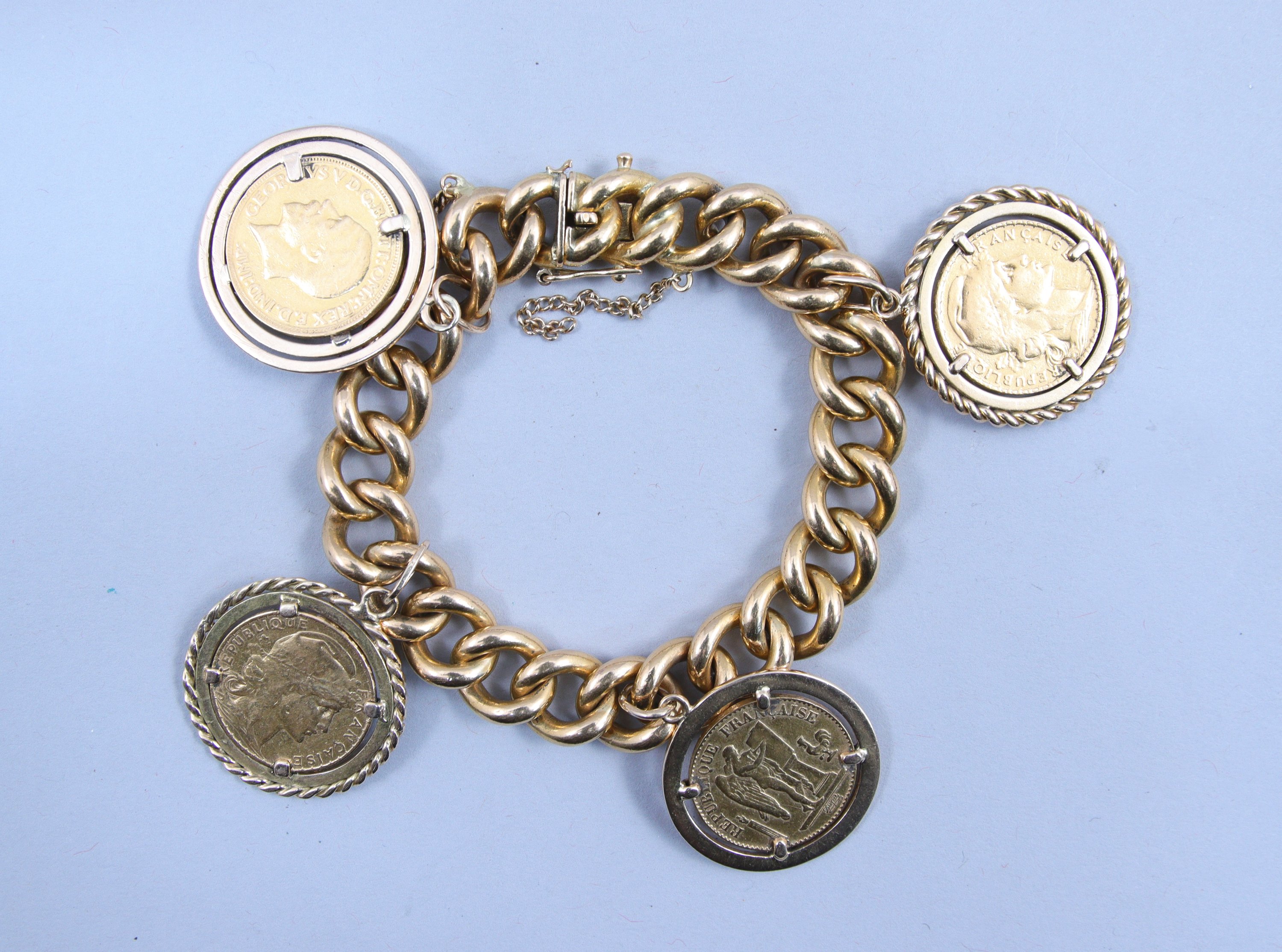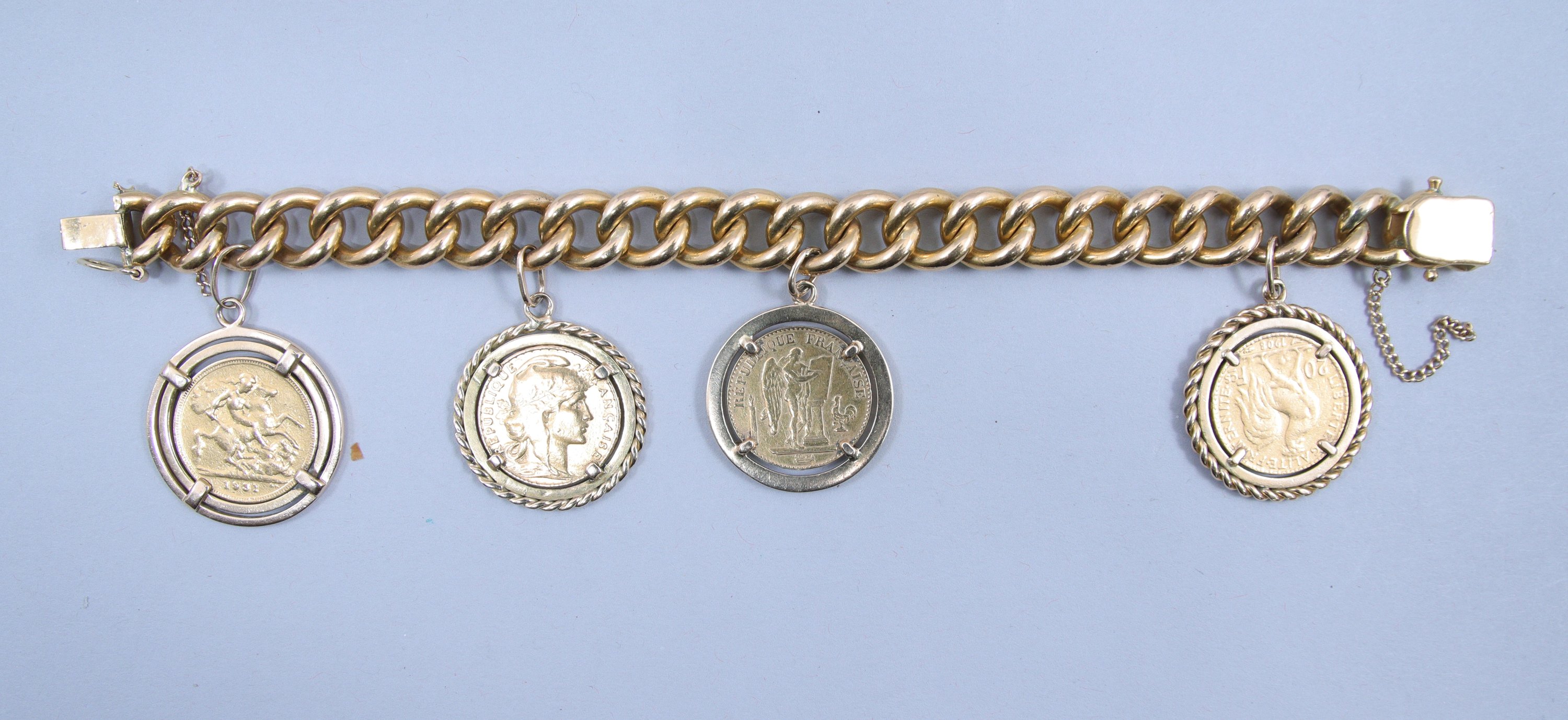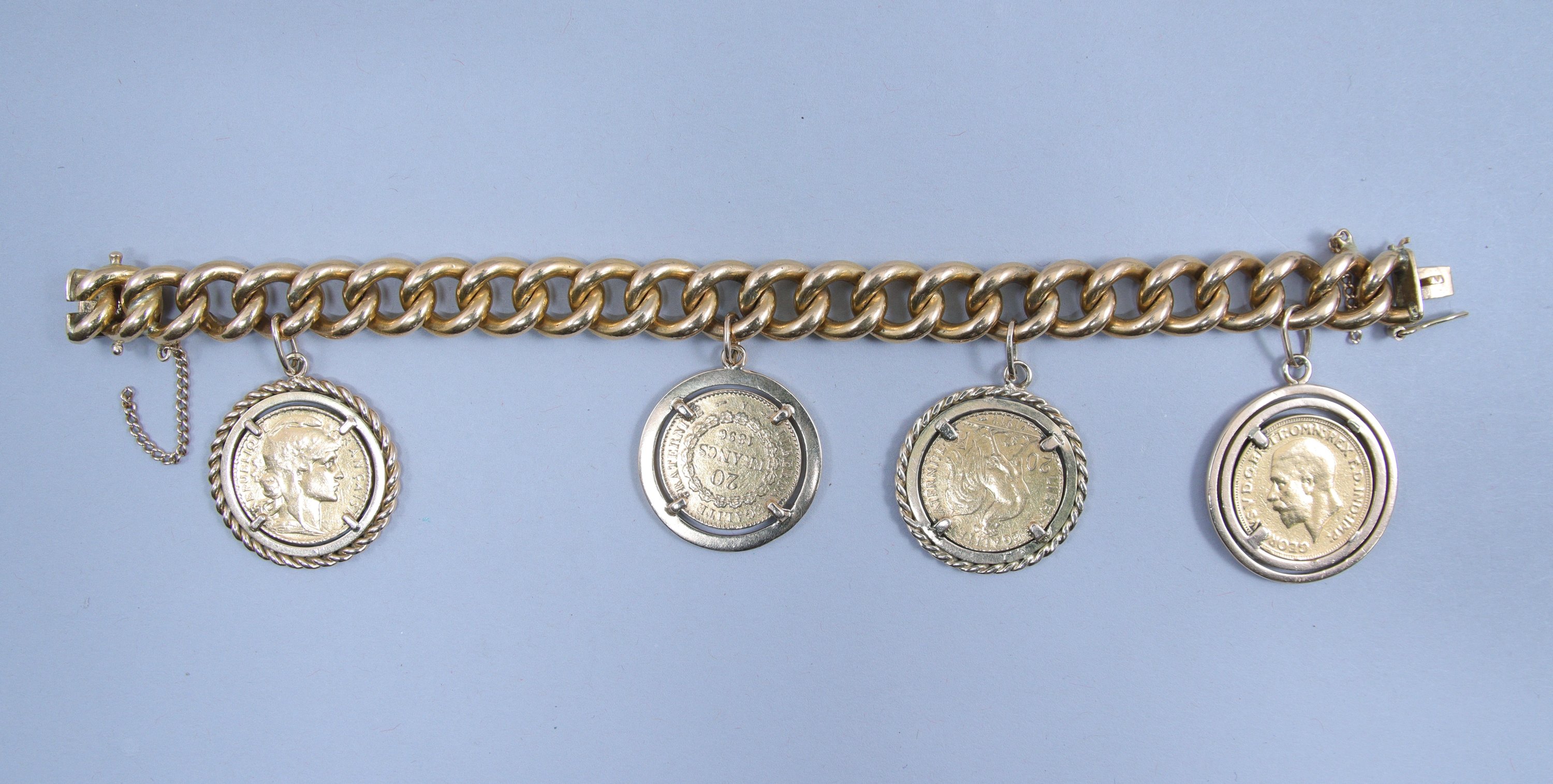 en or jaune 750 millièmes. Il est orné de trois monnaies françaises (2 x Marianne 1908, Génie 1896) et une monnaie anglaise (Georges V 1931).