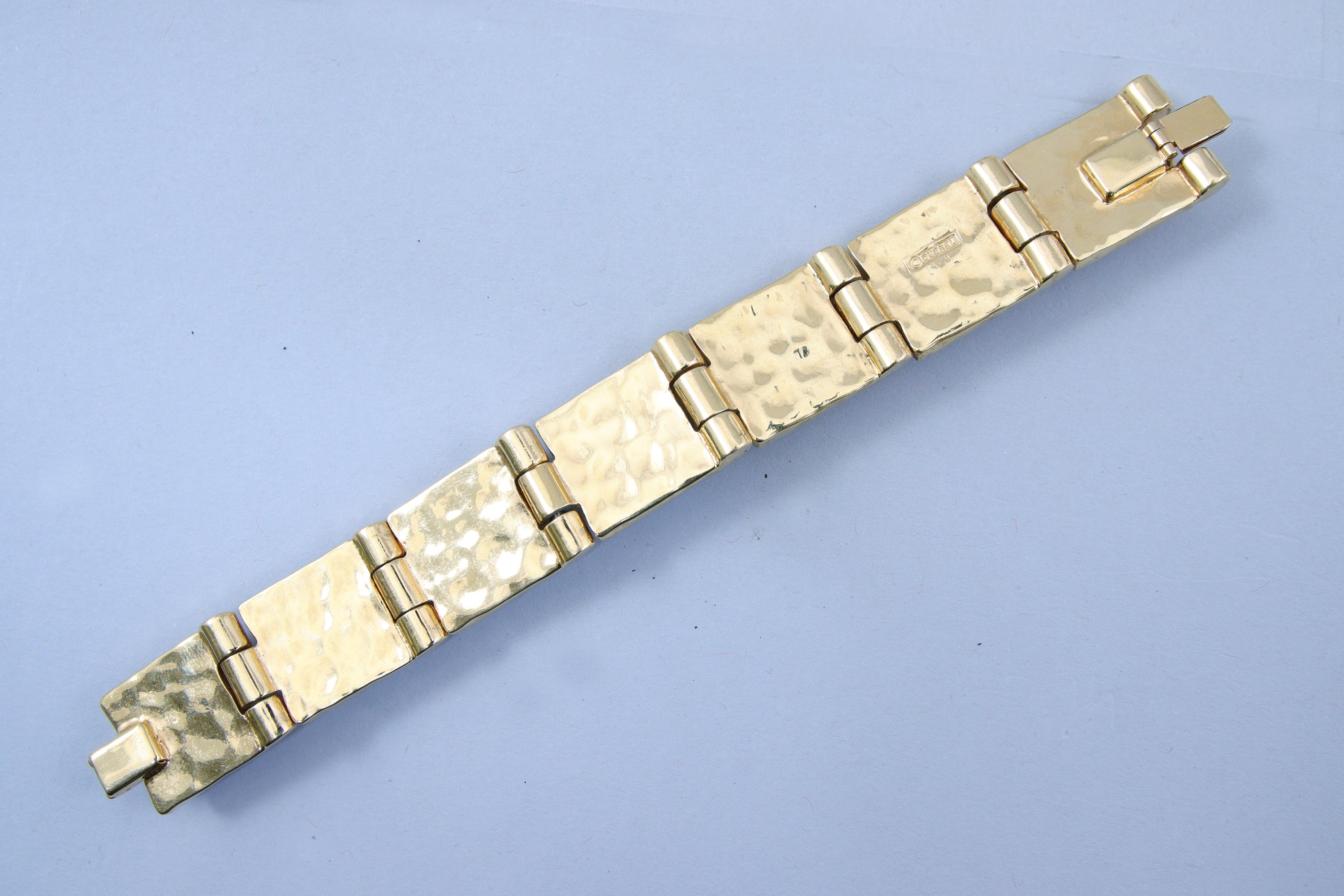 en métal doré, composé de sept maillons quadrangulaires ornés de cabochons en résine noire.