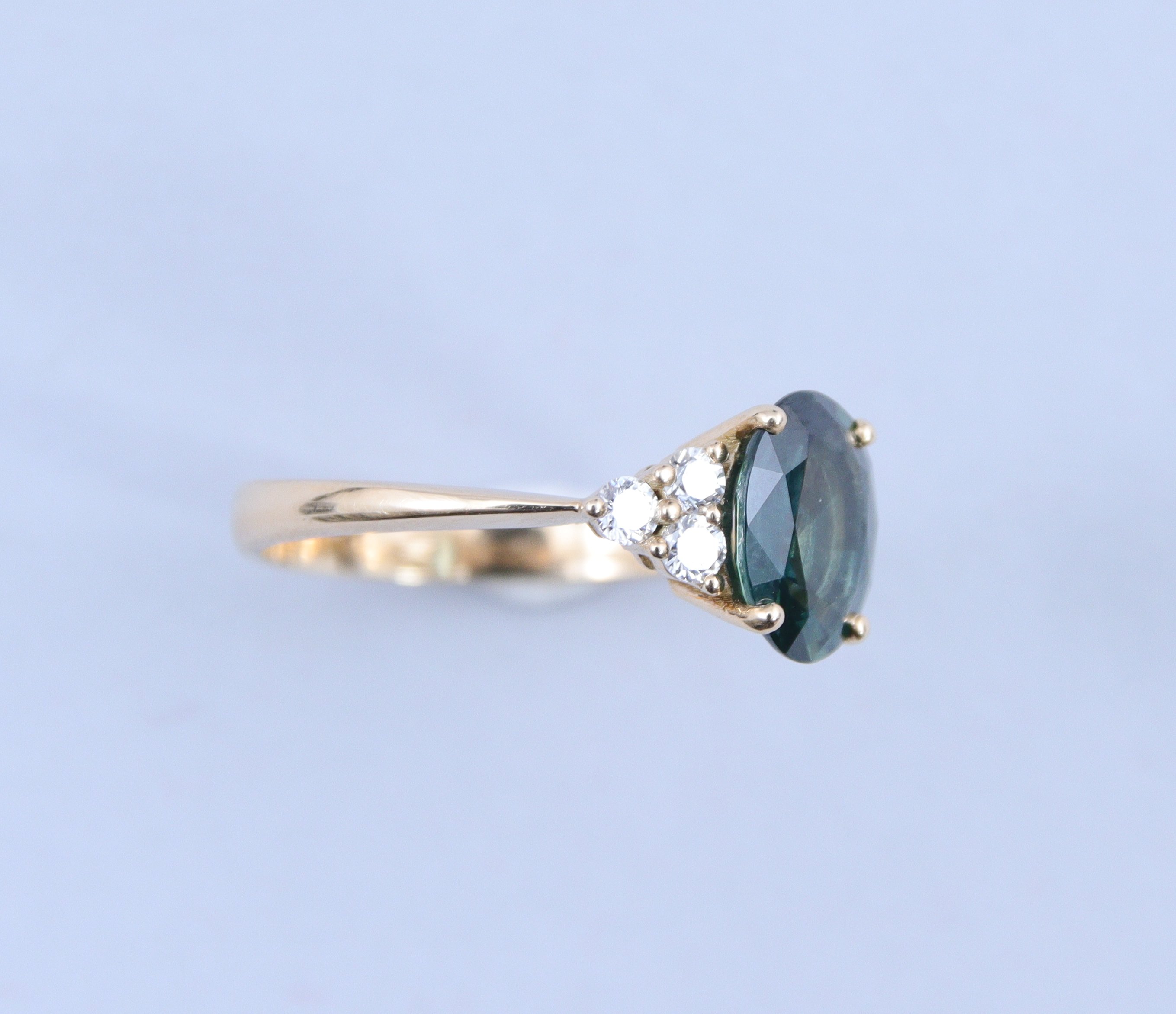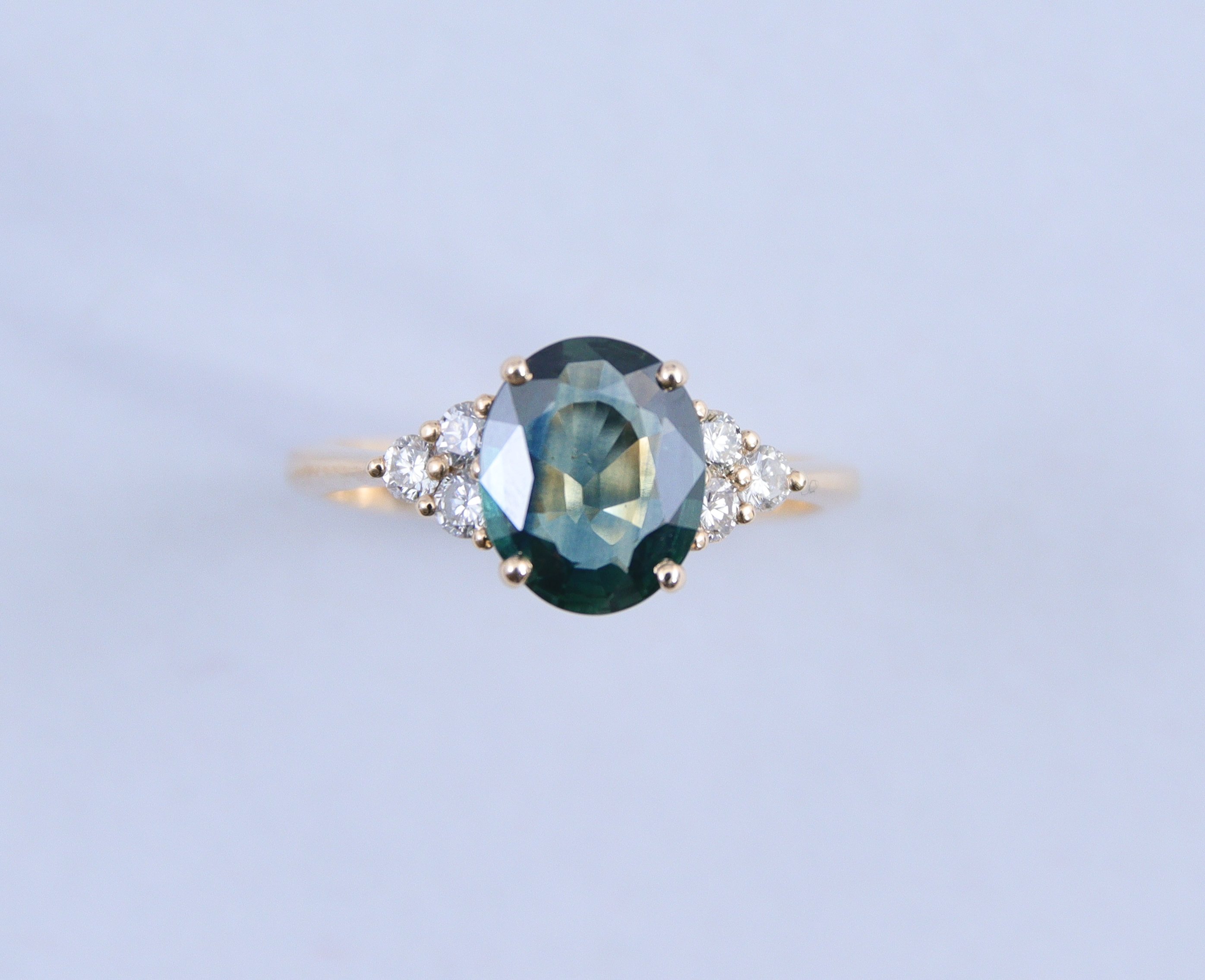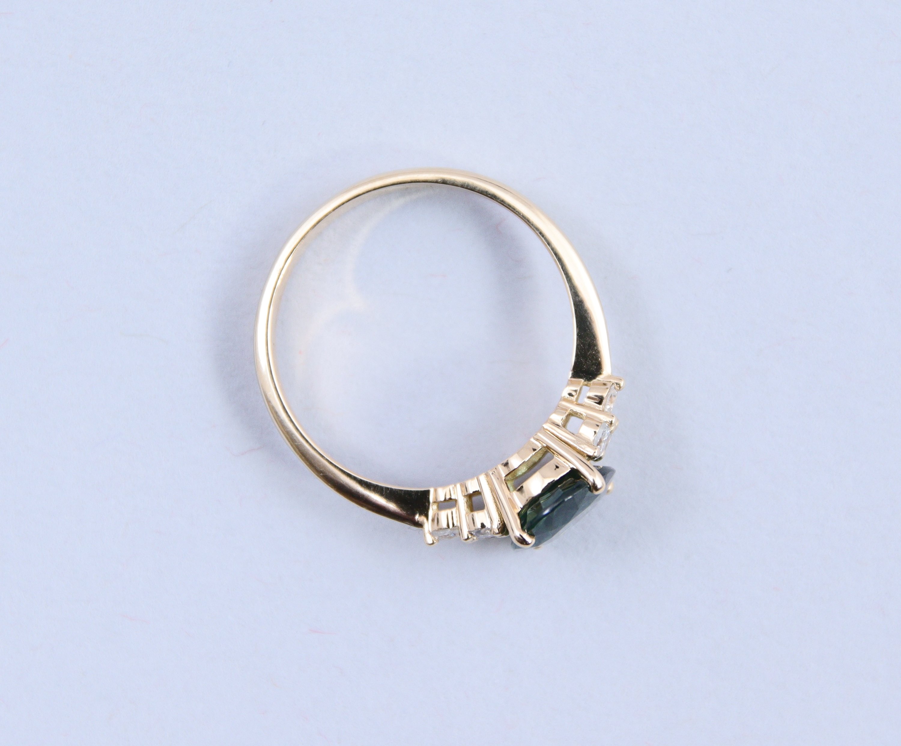 en or jaune 750 millièmes, le chaton serti d'un saphir vert épaulé de six brillants.