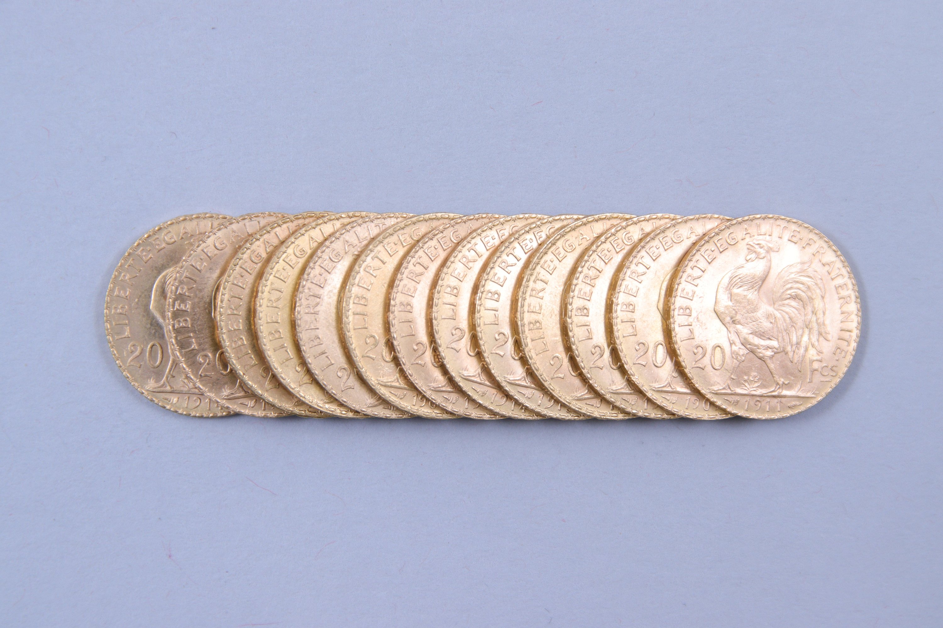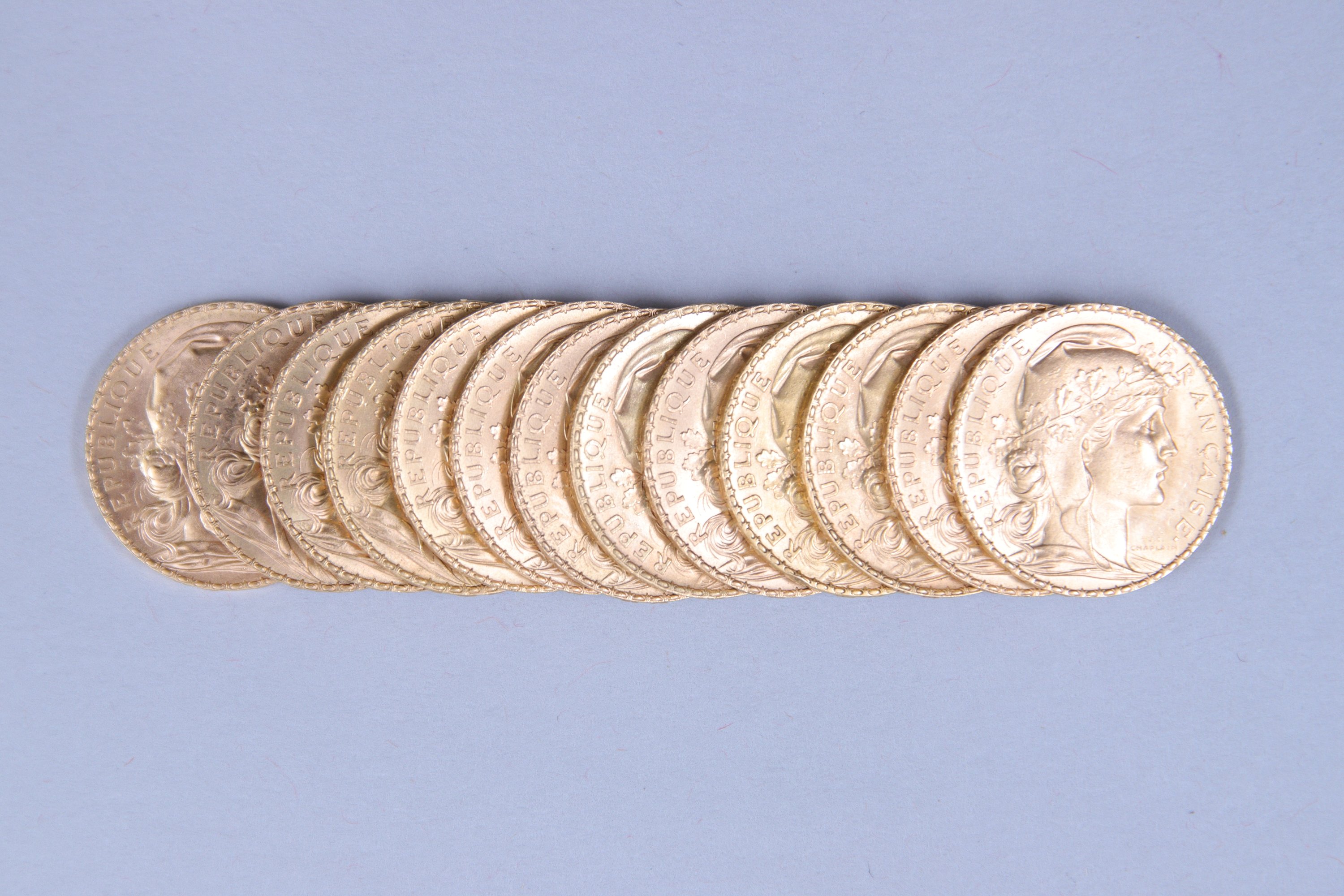 FRANCE. 13 PIÈCES de 20 FRANCS OR, Coq Marianne 1905, 1906, 1907, 1909, 1910 (3), 1911 (2), 1912, 1913, 1916 (2).