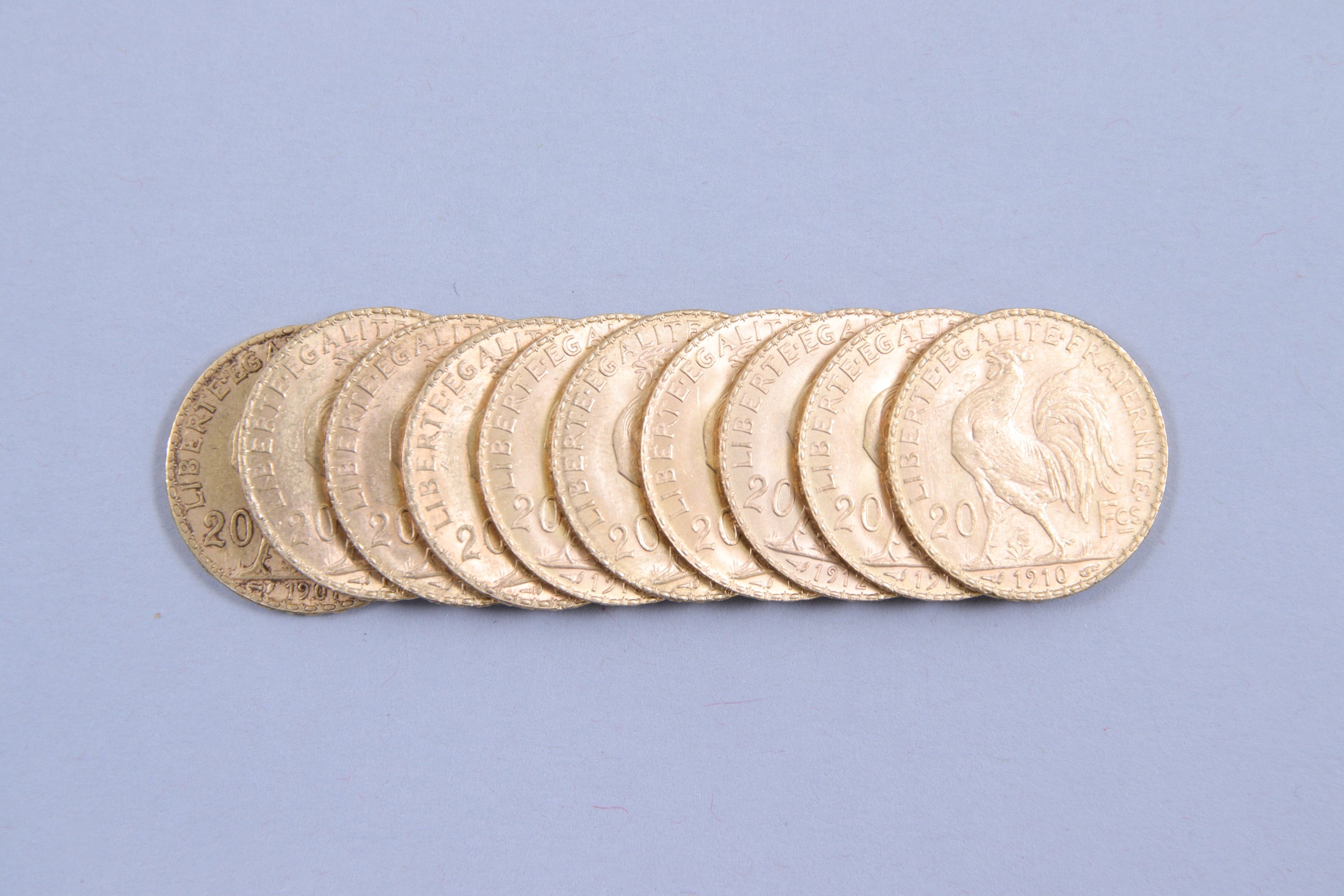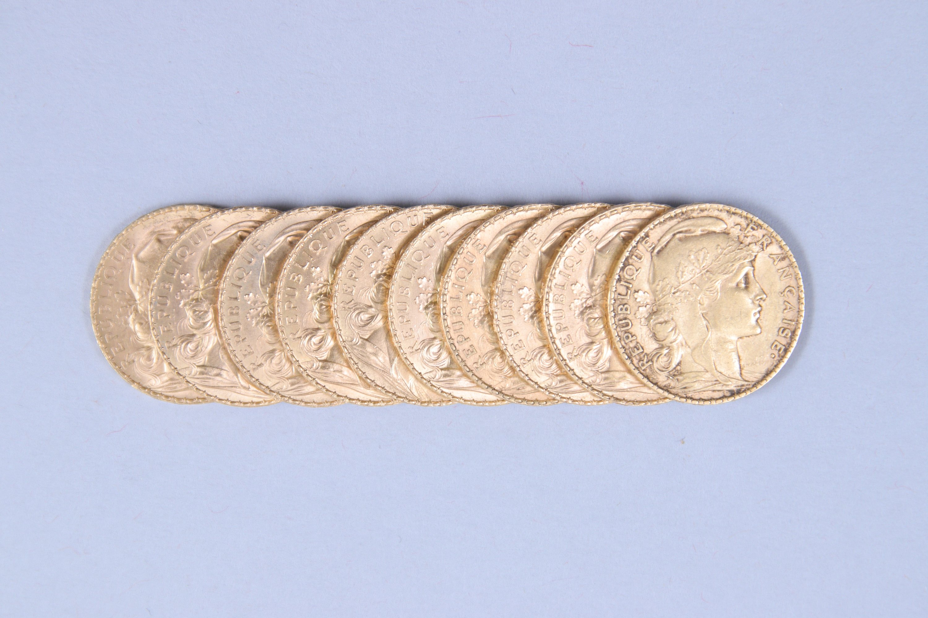 FRANCE. 10 PIÈCES de 20 FRANCS OR, Coq Marianne, 1907, 1909, 1910, 1911, 1912 (3), 1913 (3).