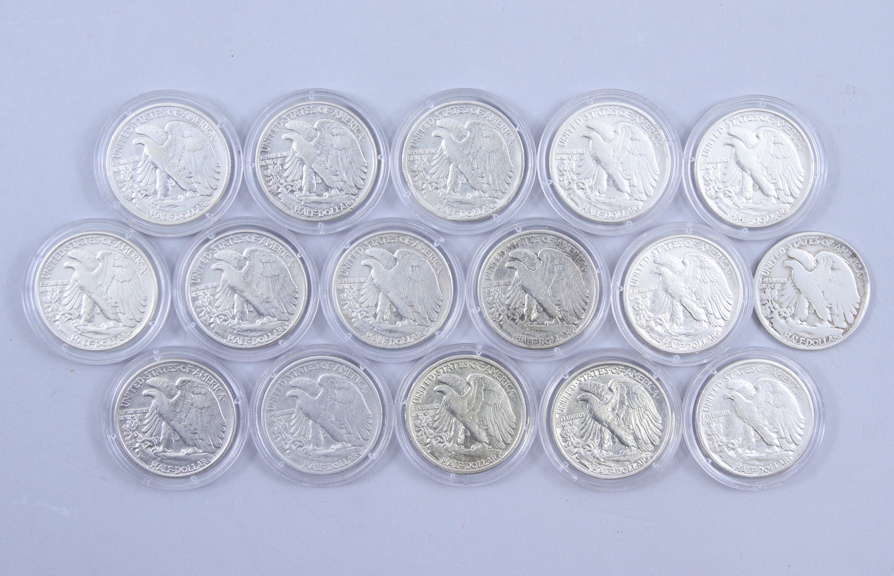 ÉTATS-UNIS. 16 MONNAIES d'UN DEMI DOLLAR en ARGENT, 1943-1944.