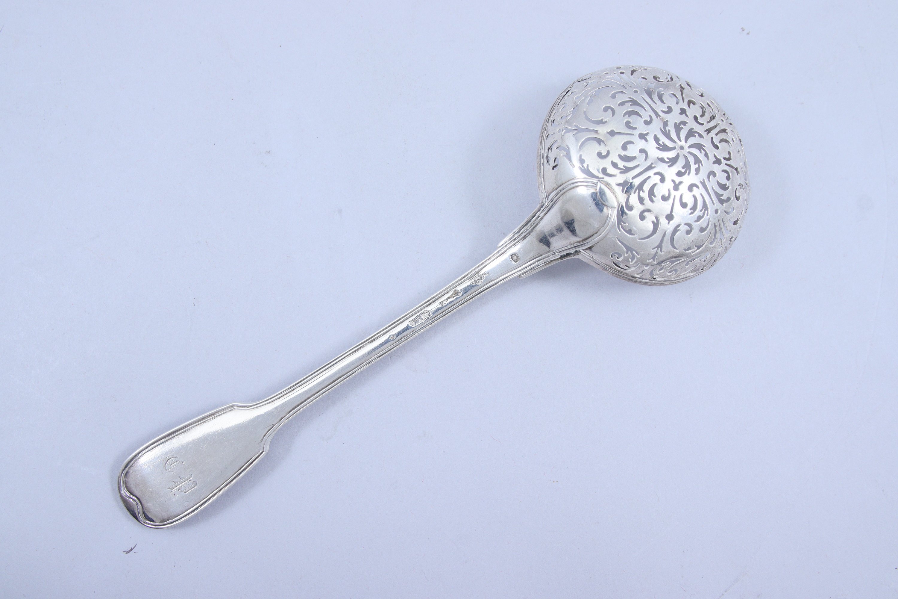 en argent, modèle à filet contour. Le cuilleron percé de motifs de feuilles d'acanthe et rinceaux entourant une spirale. Monogrammée "C.P".