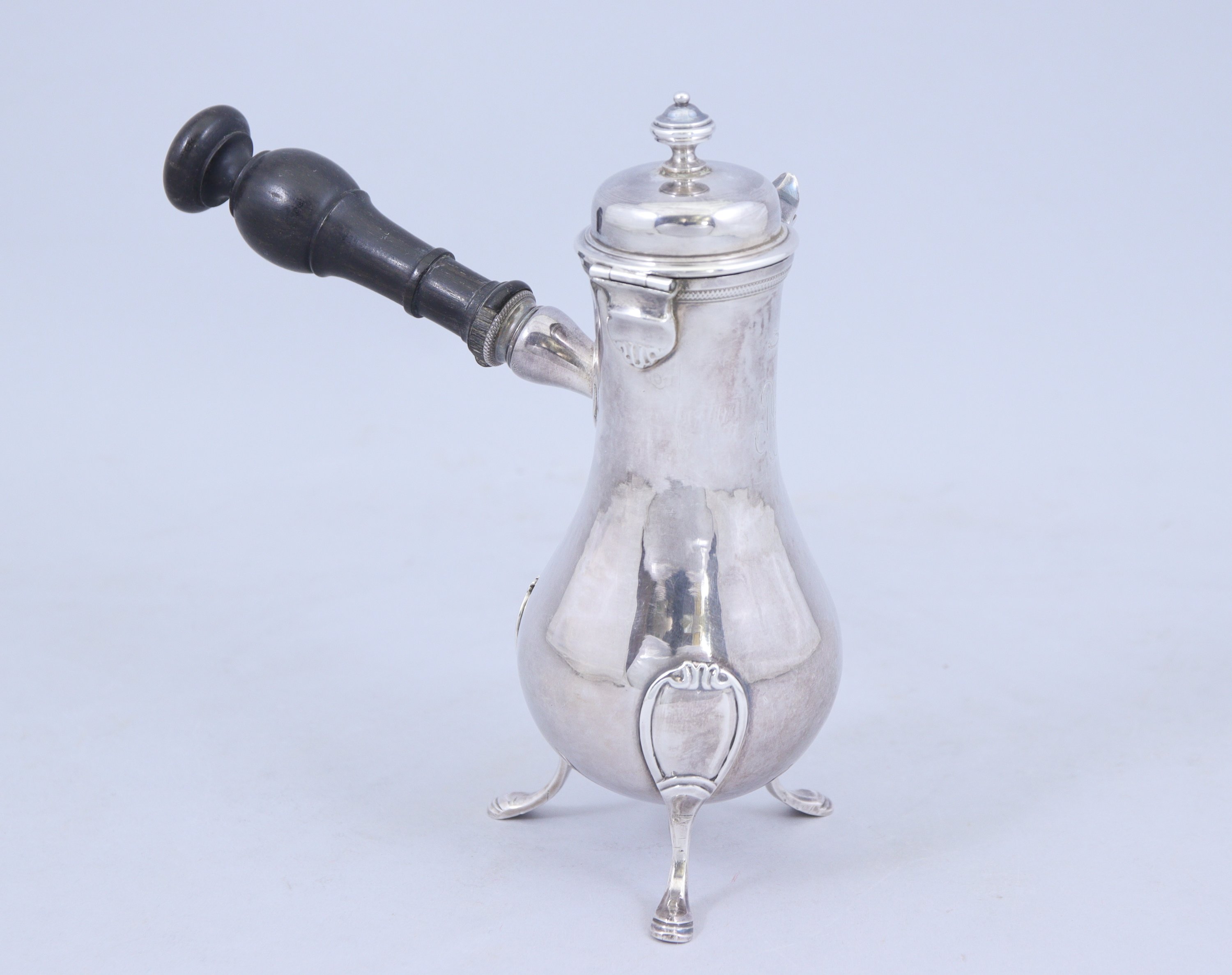 en argent. Le fretel en forme de toupie, le bec verseur mouluré, le col monogrammé. Elle repose sur un piétement tripode. Le manche en bois tourné.