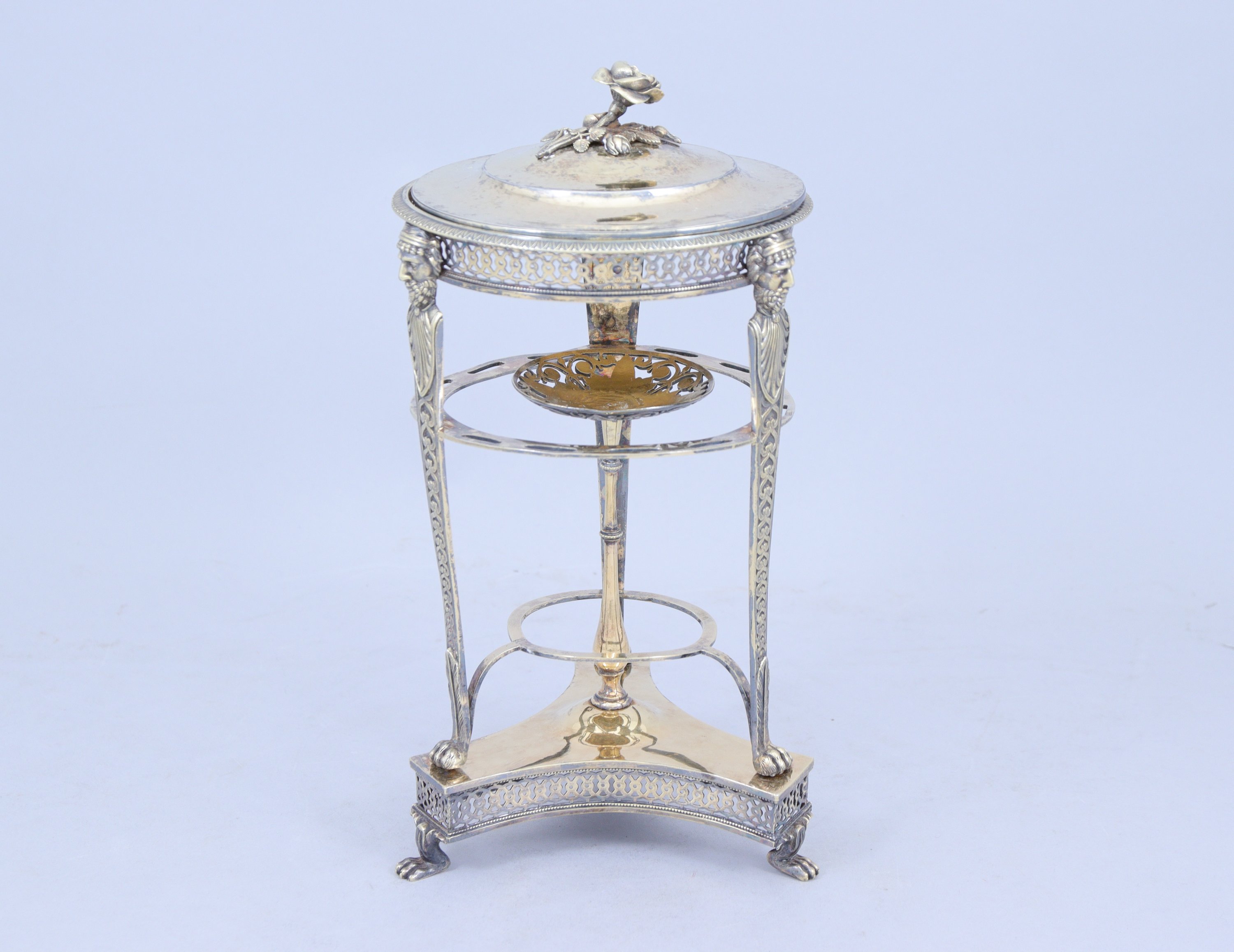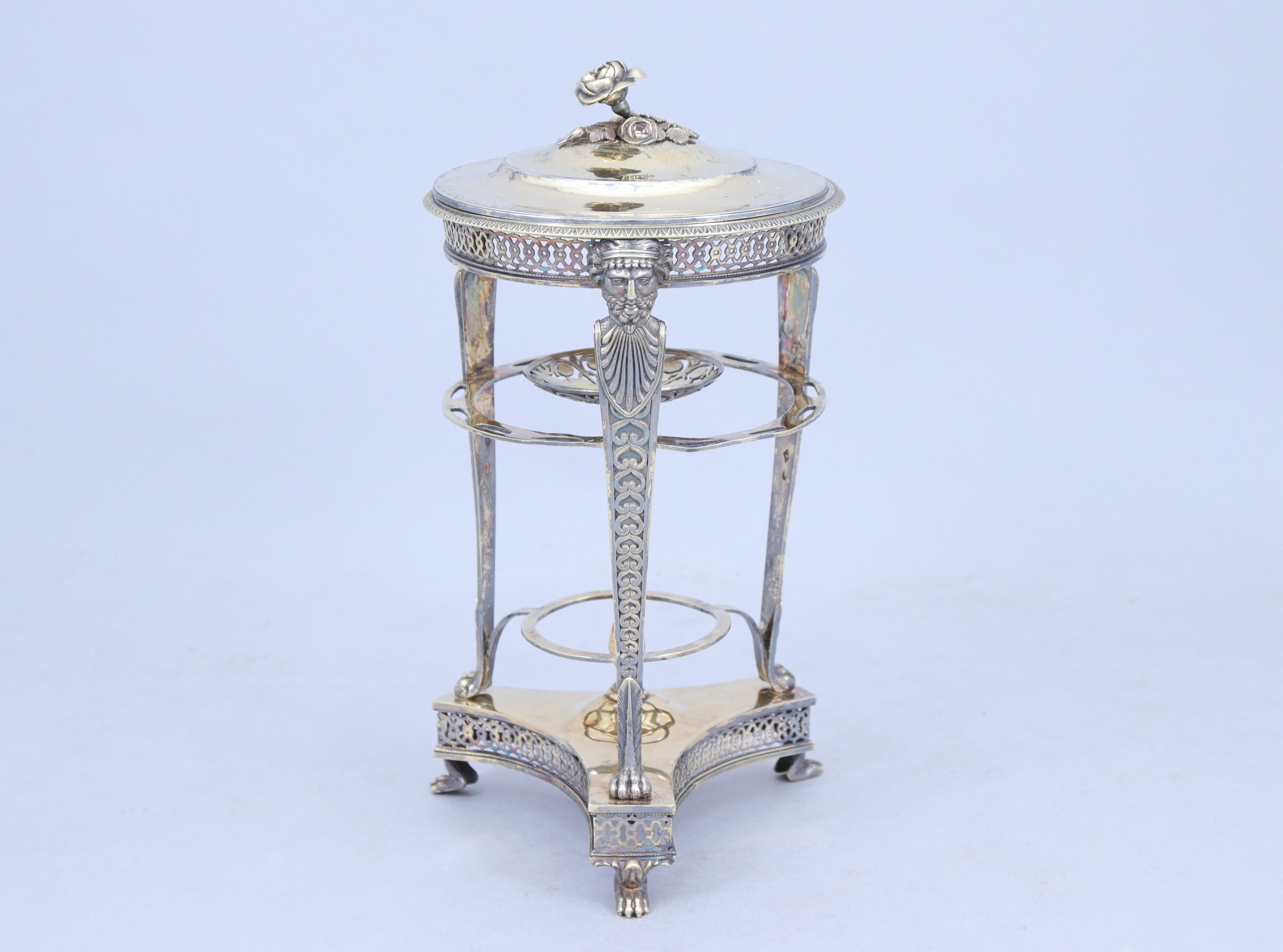 en vermeil. Le couvercle à fretel en forme de rose épanouie sur une terrasse de branches feuillagées. L'ensemble repose sur trois pilastres anthropomorphes terminés par des griffes. Le socle triangulaire est orné de motifs de cercles entrecroisés et ajourés. Trois pieds griffes.