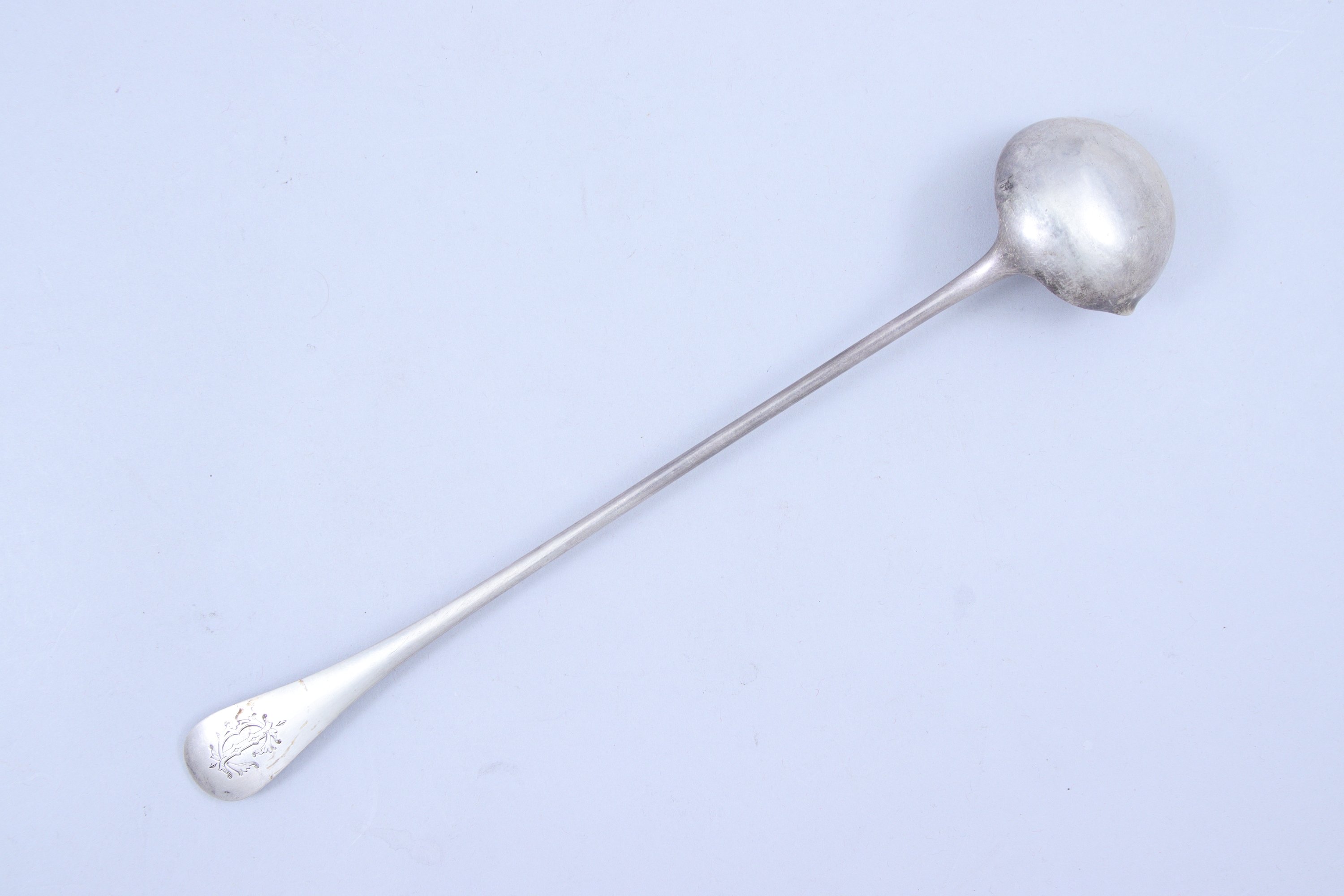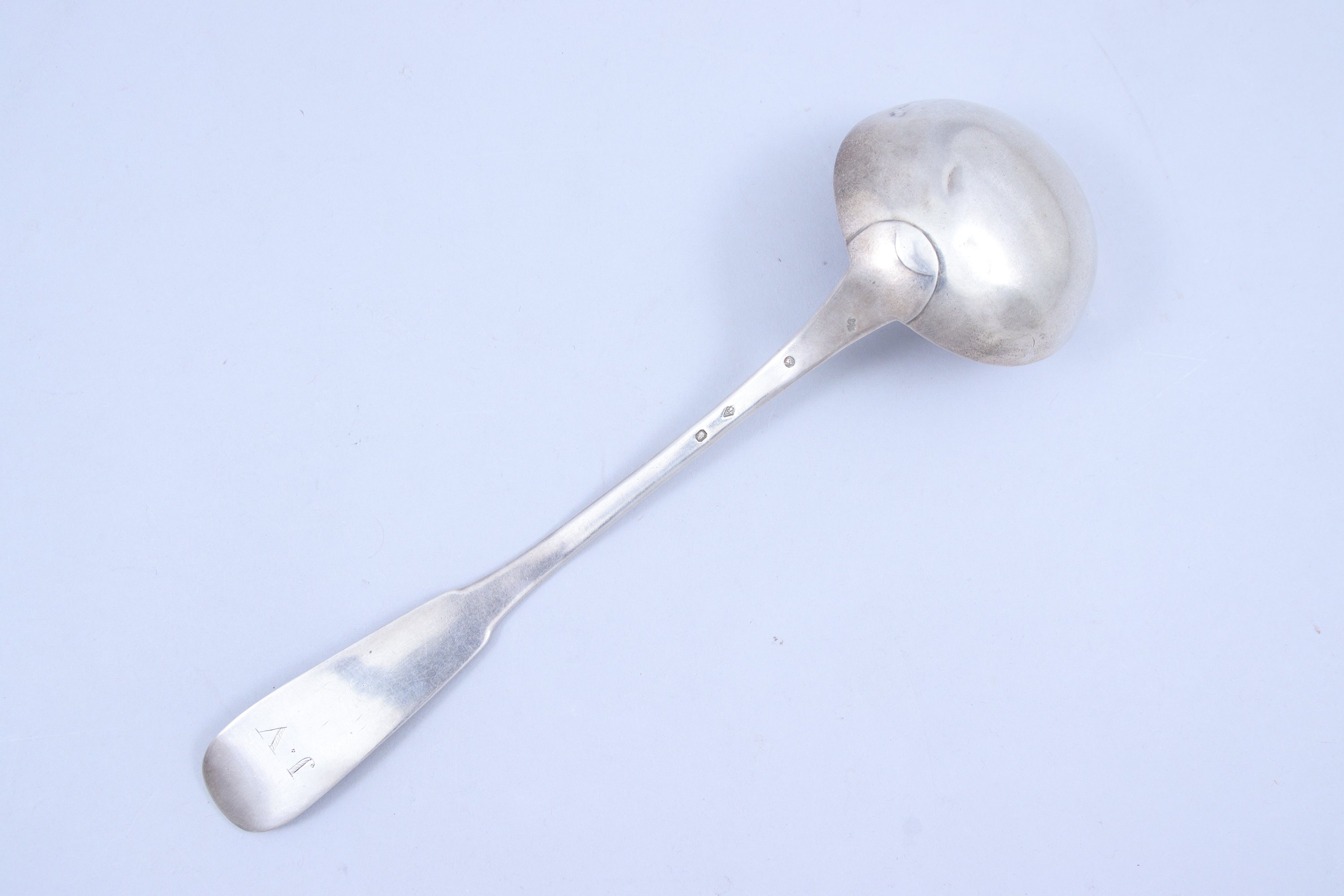 Joint: Louche à punch en argent, modèle uniplat, monogrammée « CI ». Minerve 1er titre. Orfèvre Eugène Queillé ou son fils Elvire Queillé. Long. 27,5 cm. Poids: 92 gr. Poids total: 212 gr.