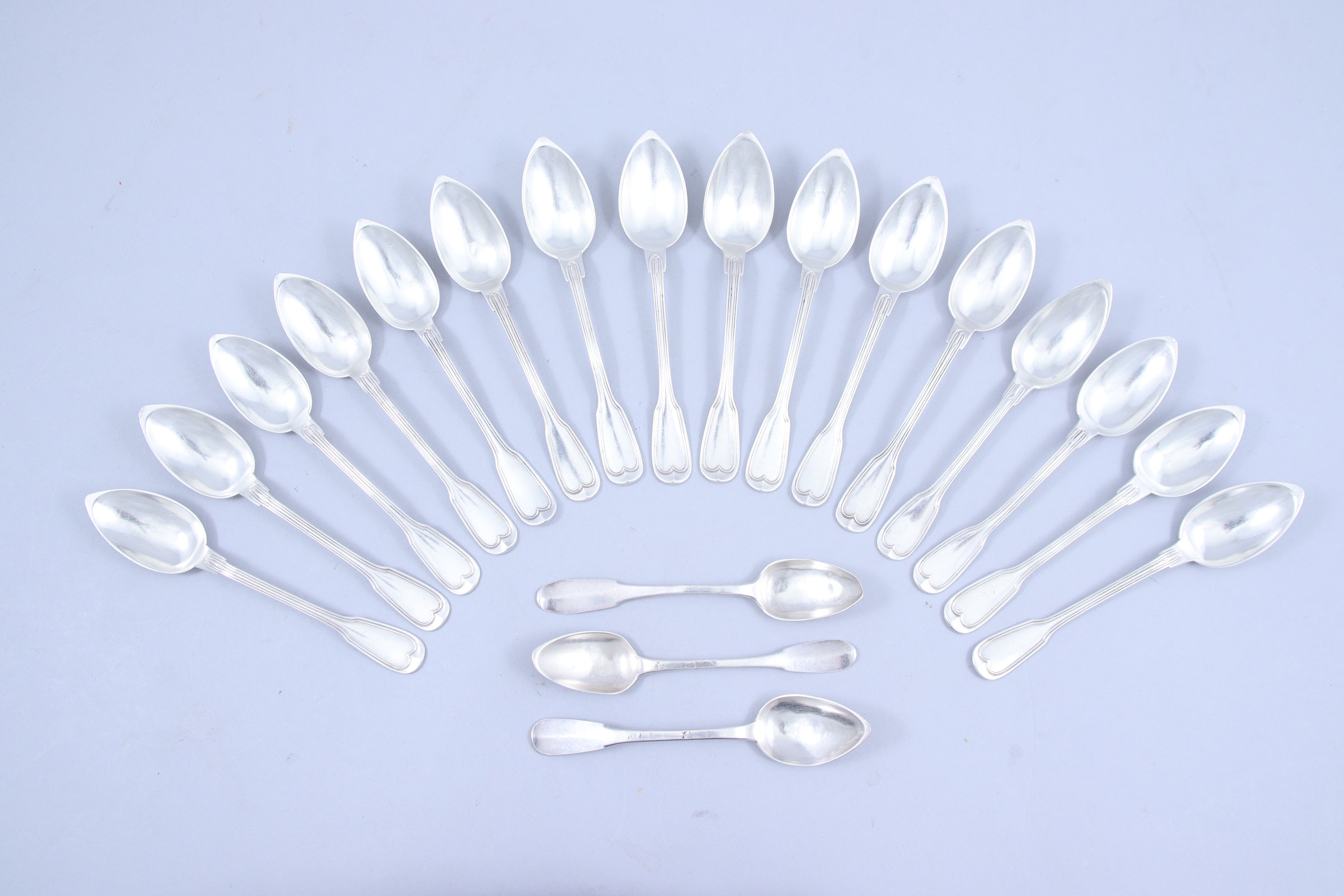 - Seize petites cuillers, modèle à filet. Monogrammées "BM". Minerve 1er titre. Orfèvre Ernest Comperé. Poids: 360 gr.