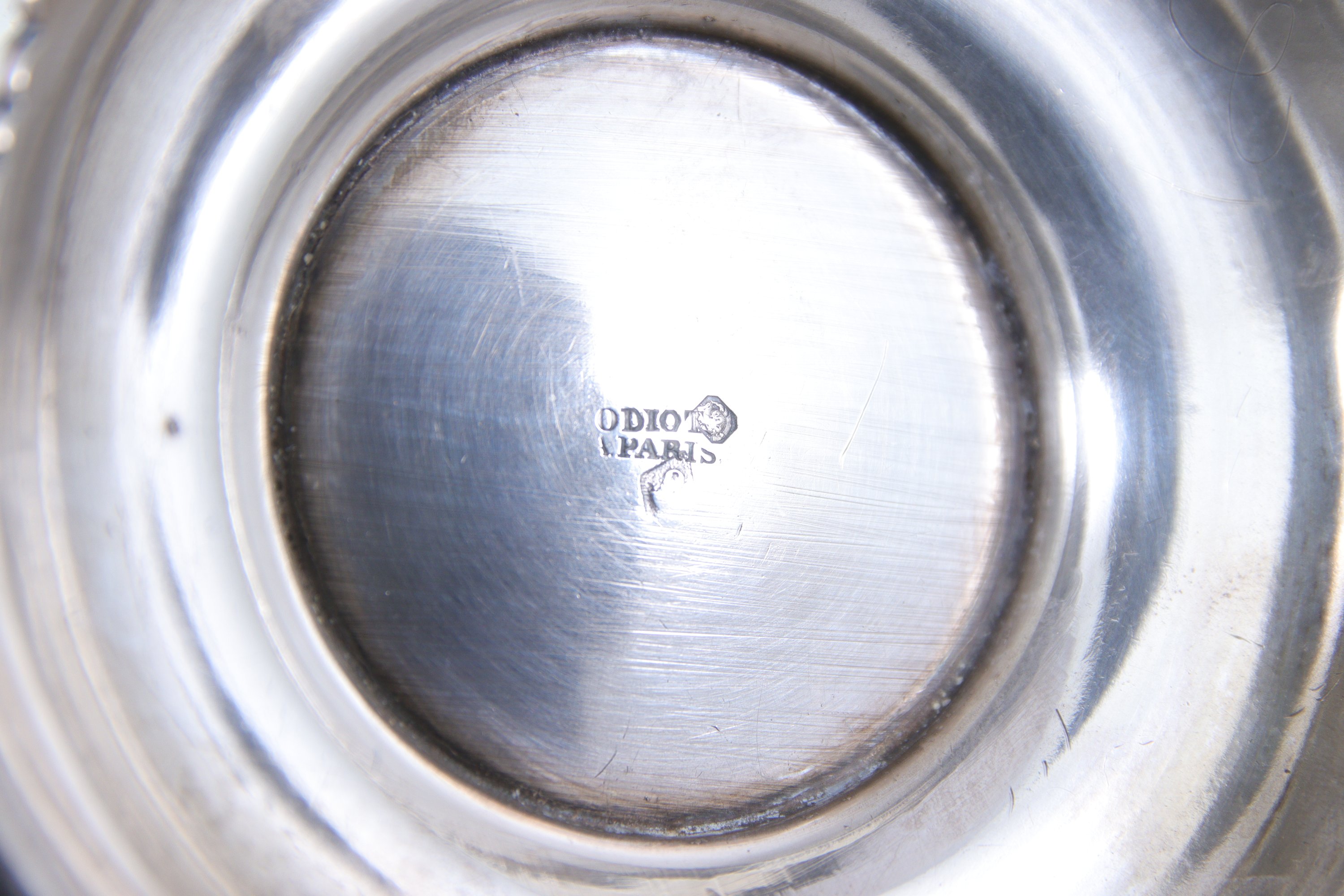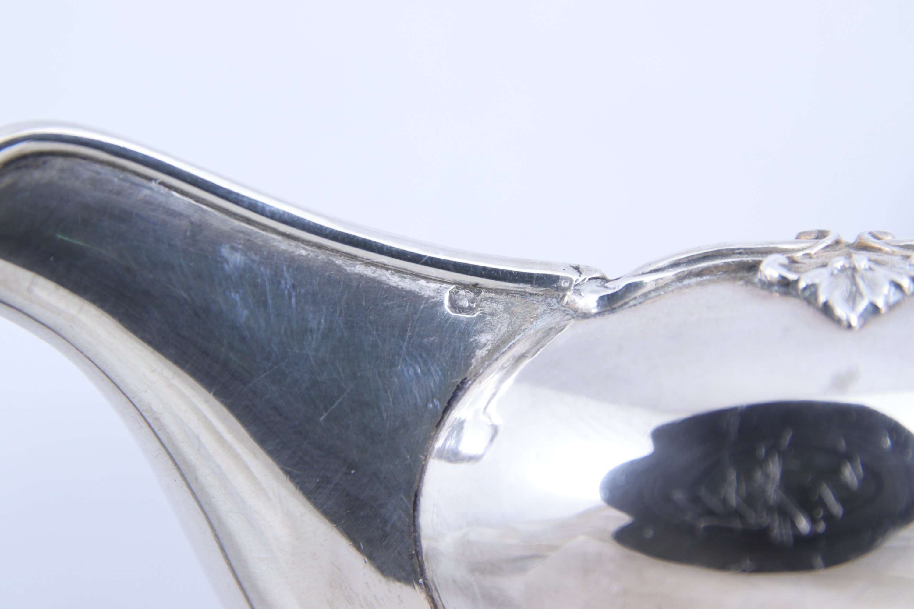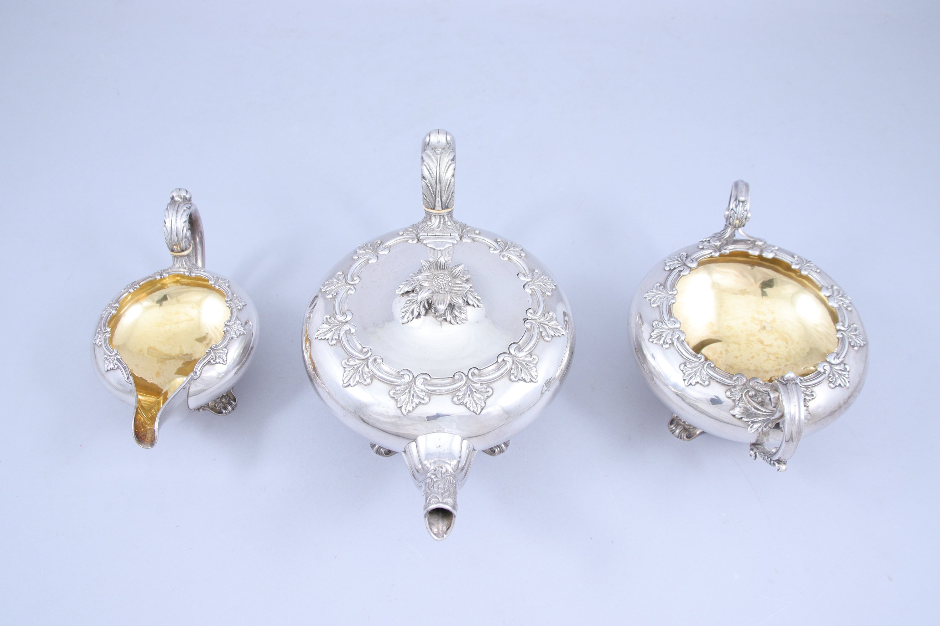 en argent, comprenant une théière, un pot à sucre et un pot à lait. Chaque pièce décorée d'une frise de feuilles d'acanthe et piétement en enroulement à décor de fleurs épanouies. La cafetière présente un fretel en forme de fleur épanouie sur une terrasse de feuilles, le bec verseur godronné. L'intérieur en vermeil.