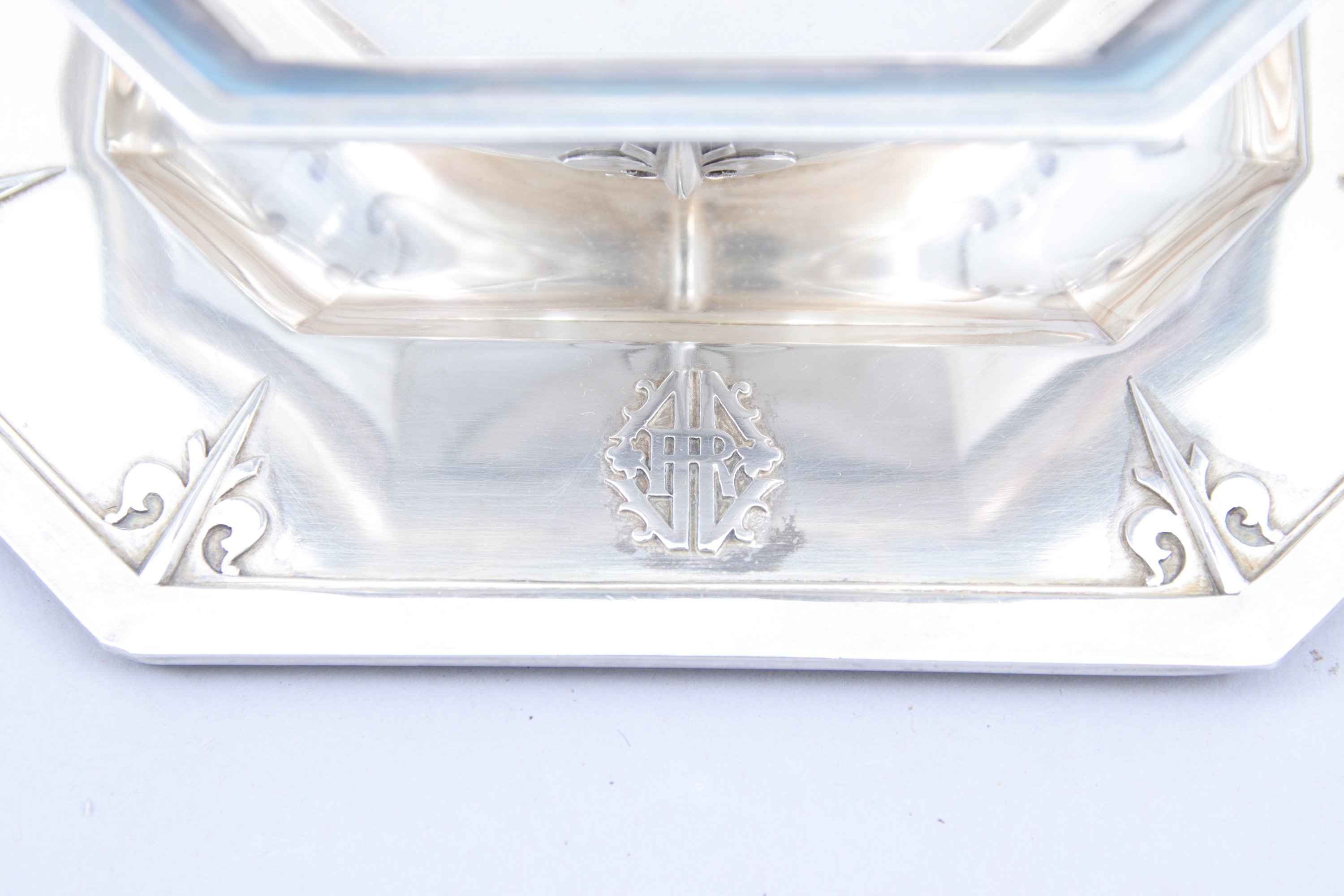 en argent, à décor en applique de fer et visage d'enfant dans un trilobe. Comprend deux plats ronds en deux tailles, deux plats à pans coupés en deux tailles et une saucière et son plateau fixe. Chiffré en relief "HR" (?).