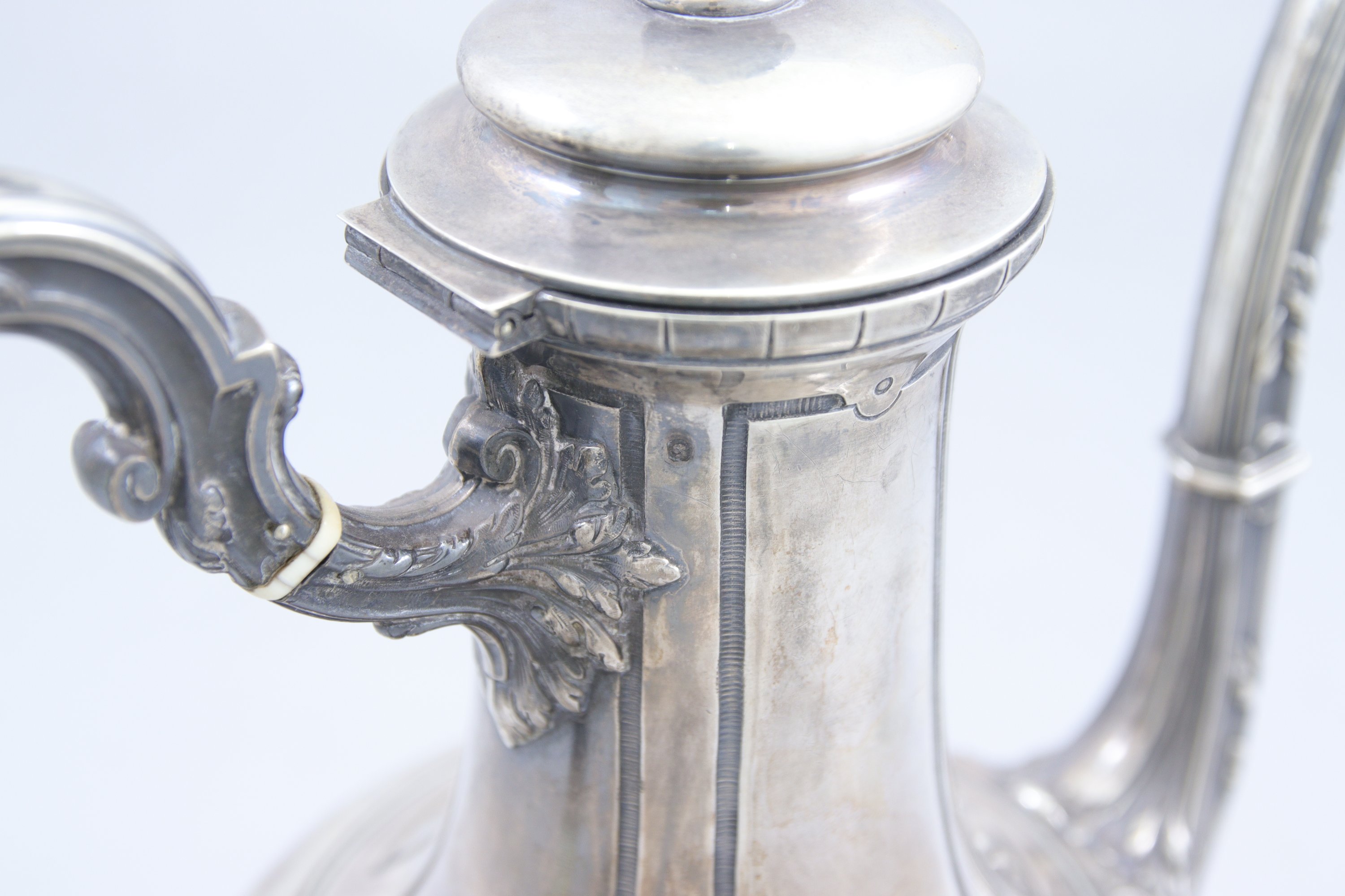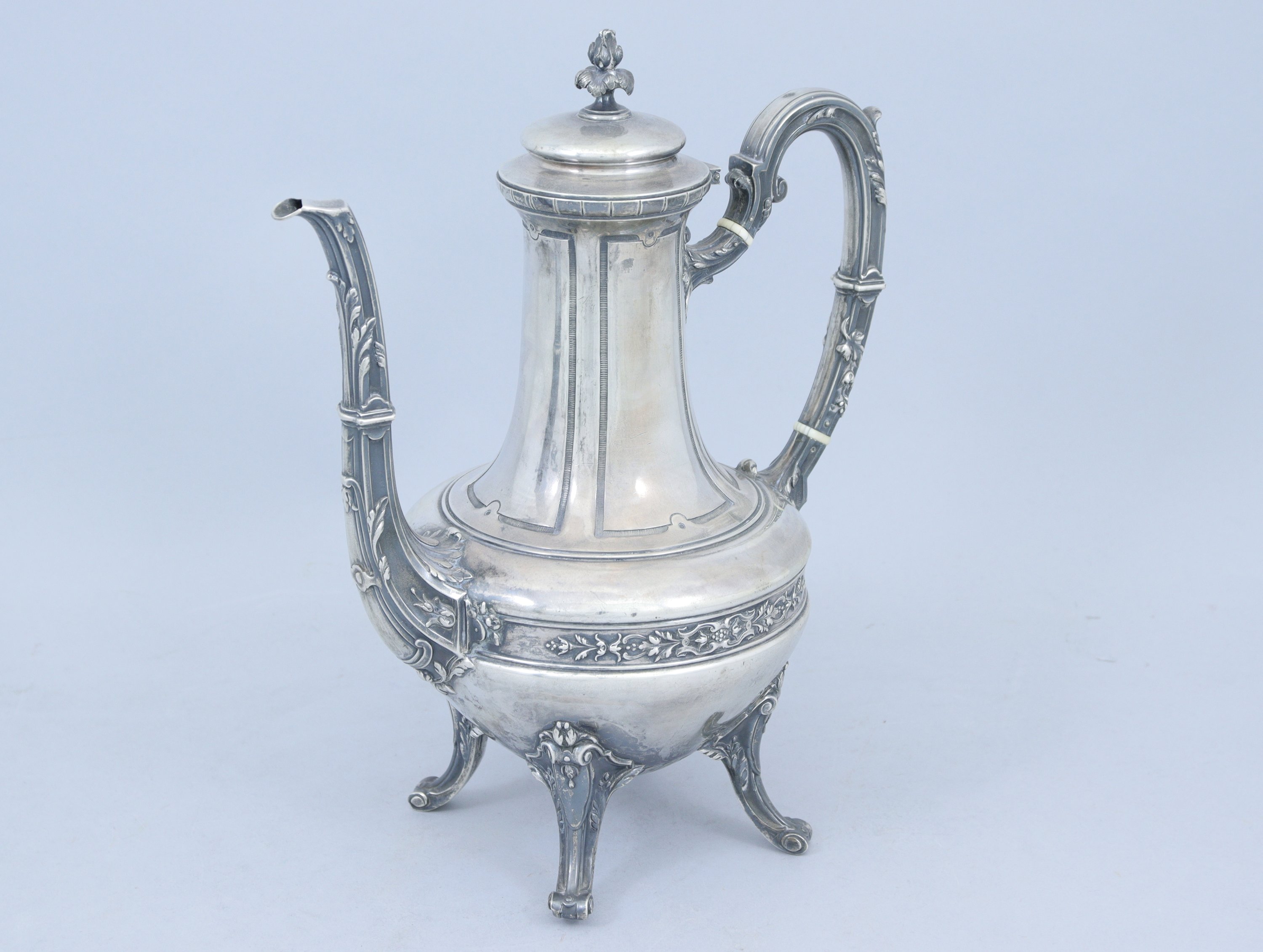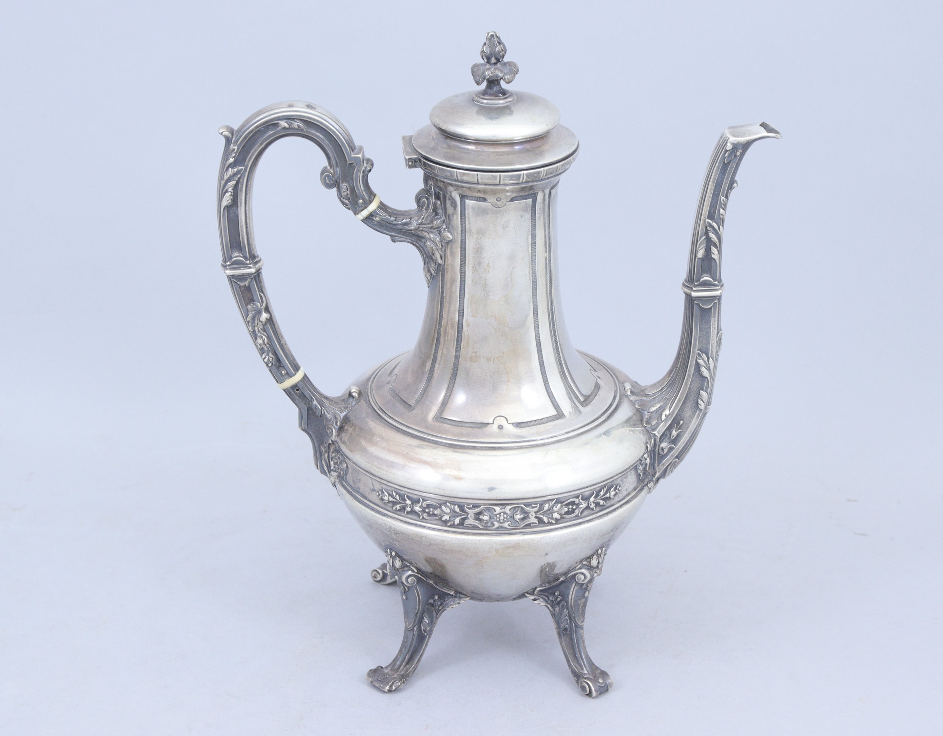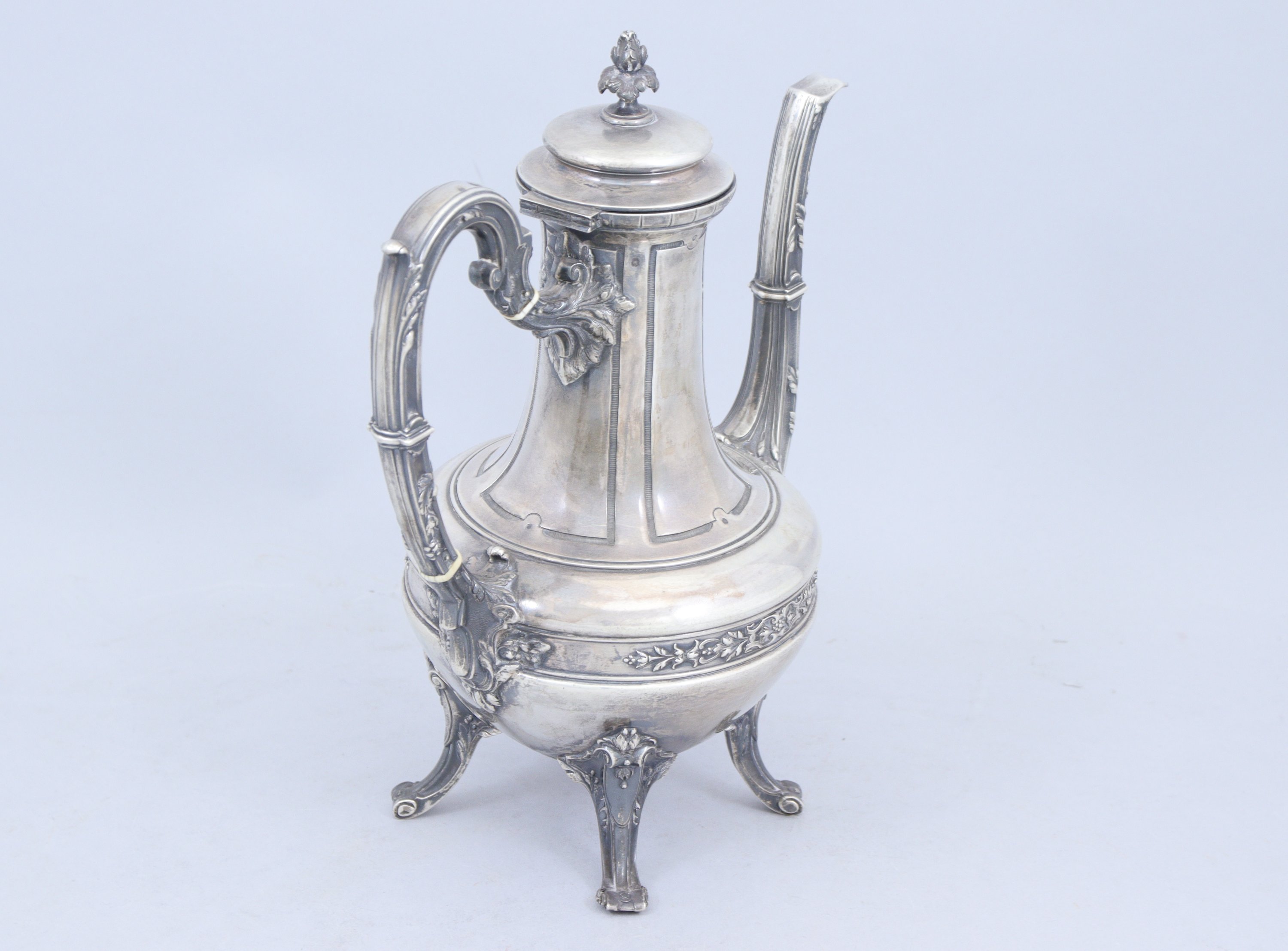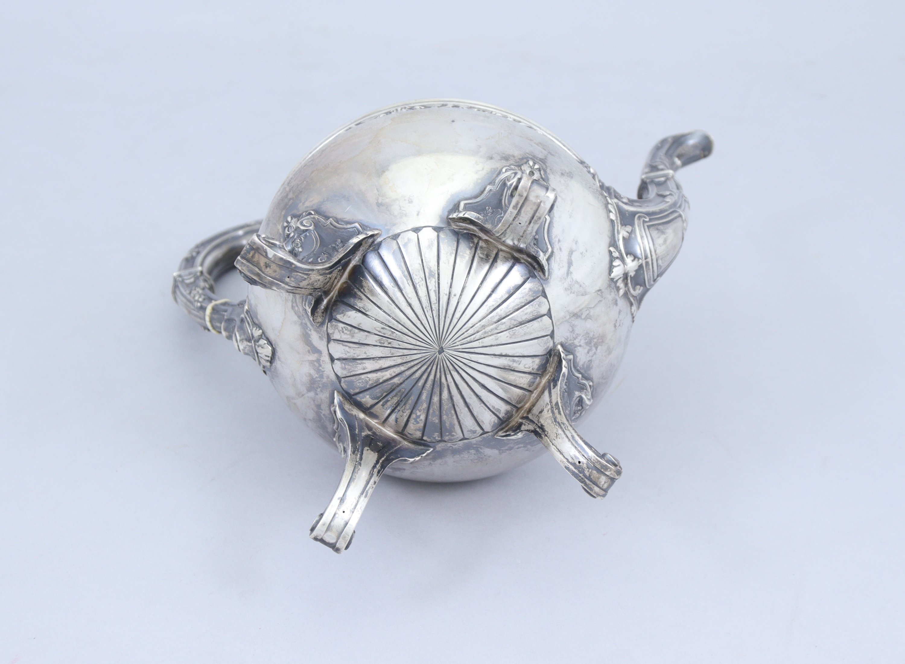 en argent. Le couvercle coiffé d'un fretel en forme de graine épanouie, l'anse et le bec ornés de feuilles d'acanthe. La panse est décorée d'une frise de lambrequins. Elle repose sur quatre pieds terminés en enroulements.