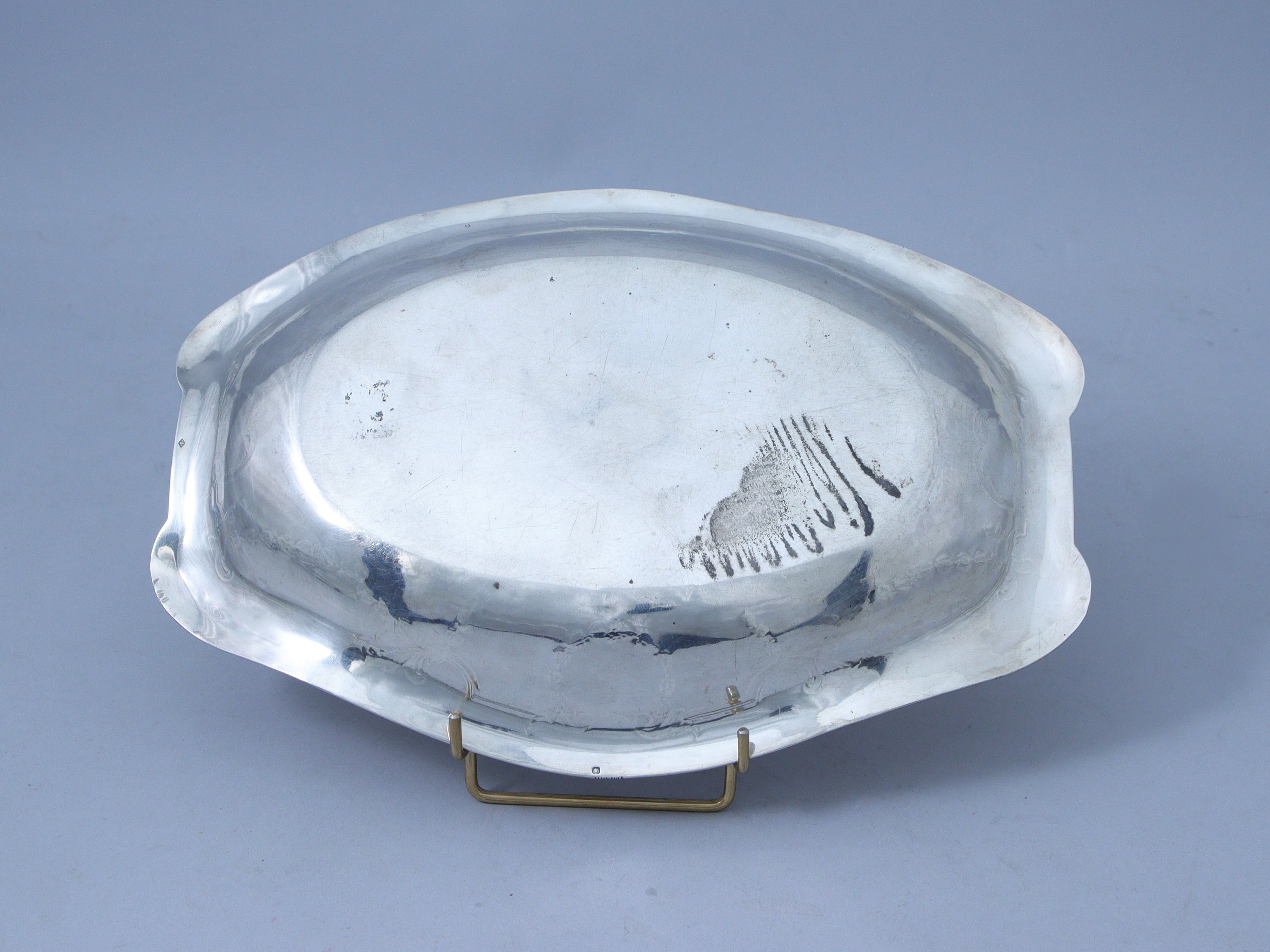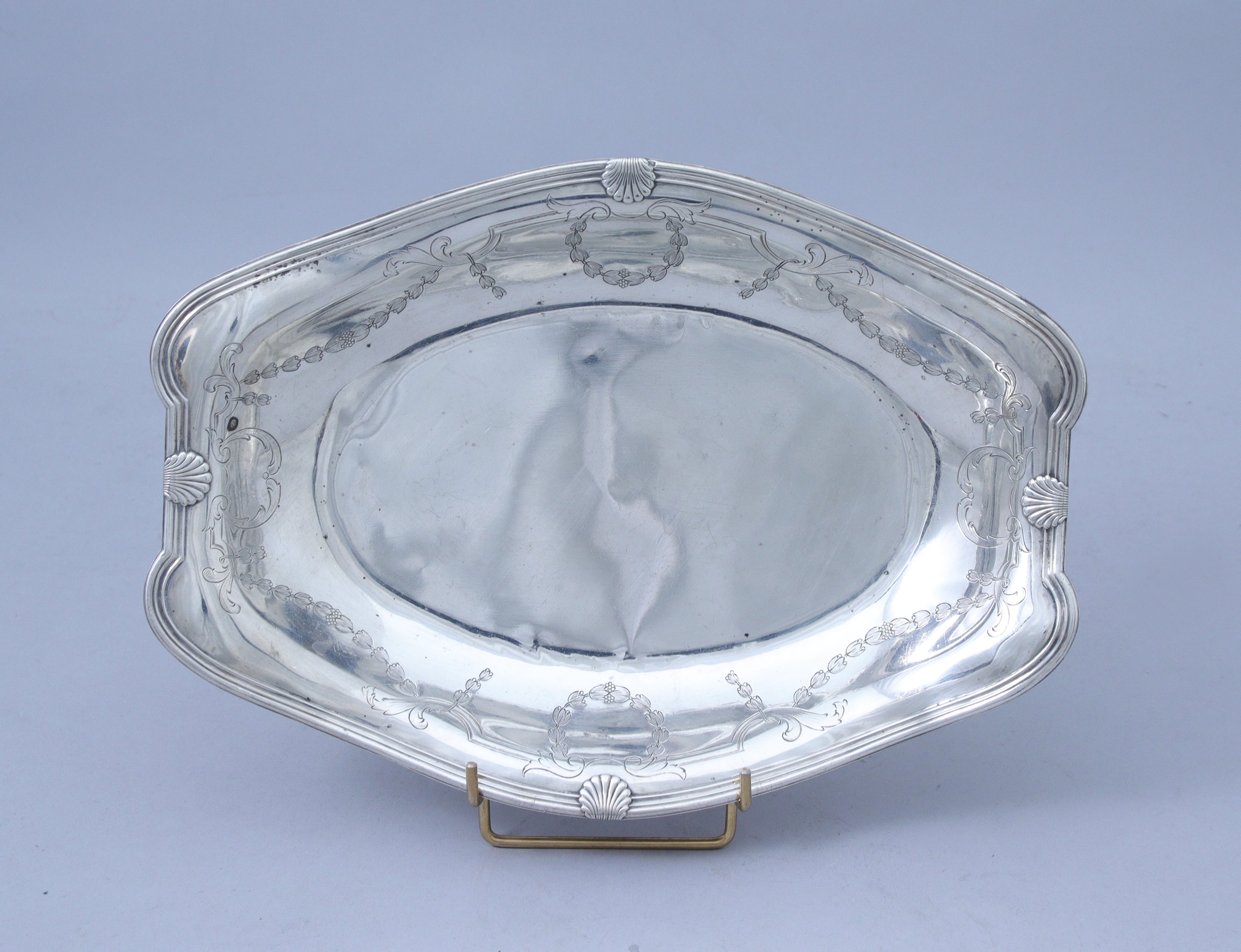 en argent, de forme mouvementée oblongue, à décor d'agrafes à coquille. L'aile est gravée de guirlandes fleuries.