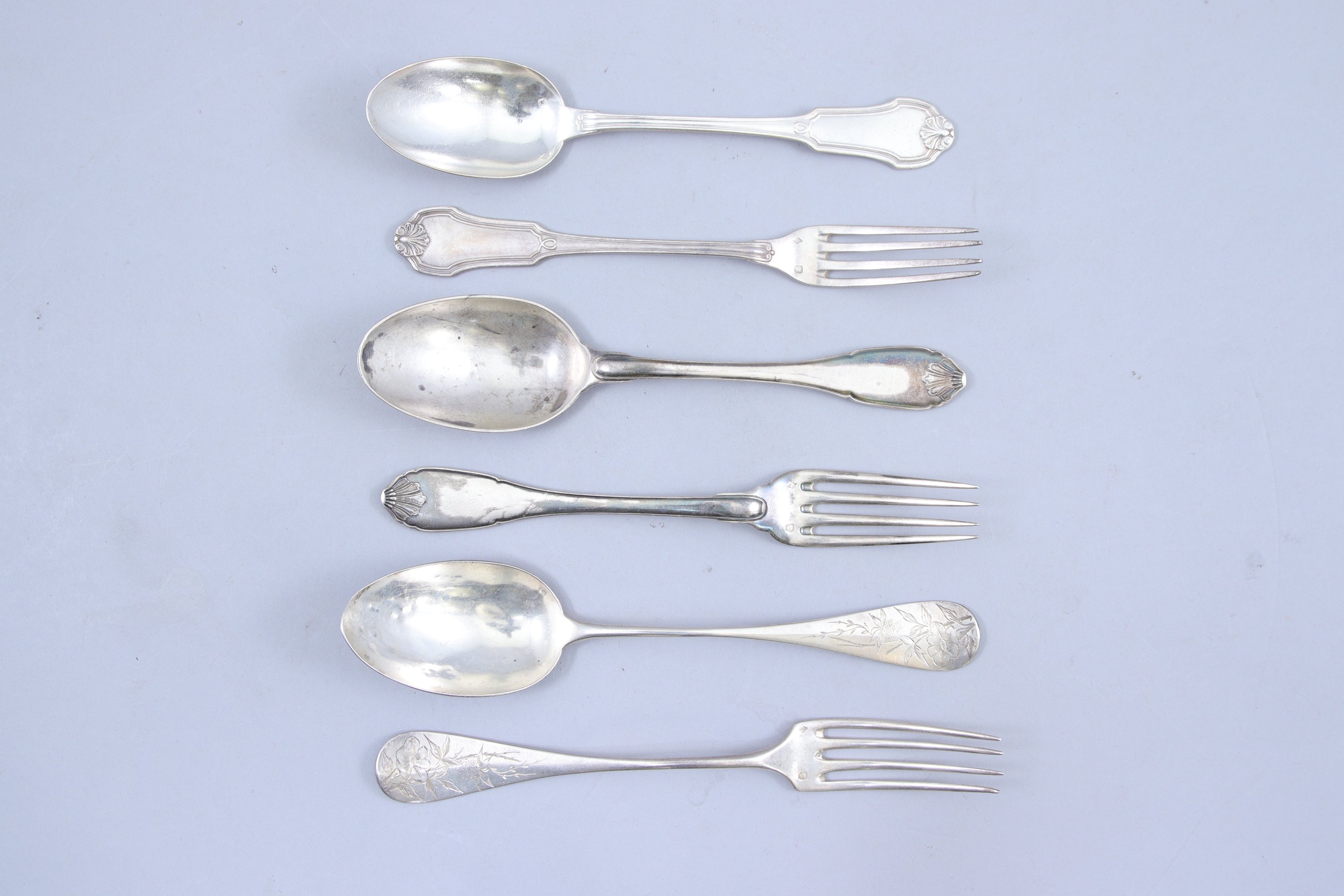 en argent. Deux de modèle filet coquille monogrammé, le troisième de modèle uniplat gravé de tiges de framboisier et panier monogrammé "AD".