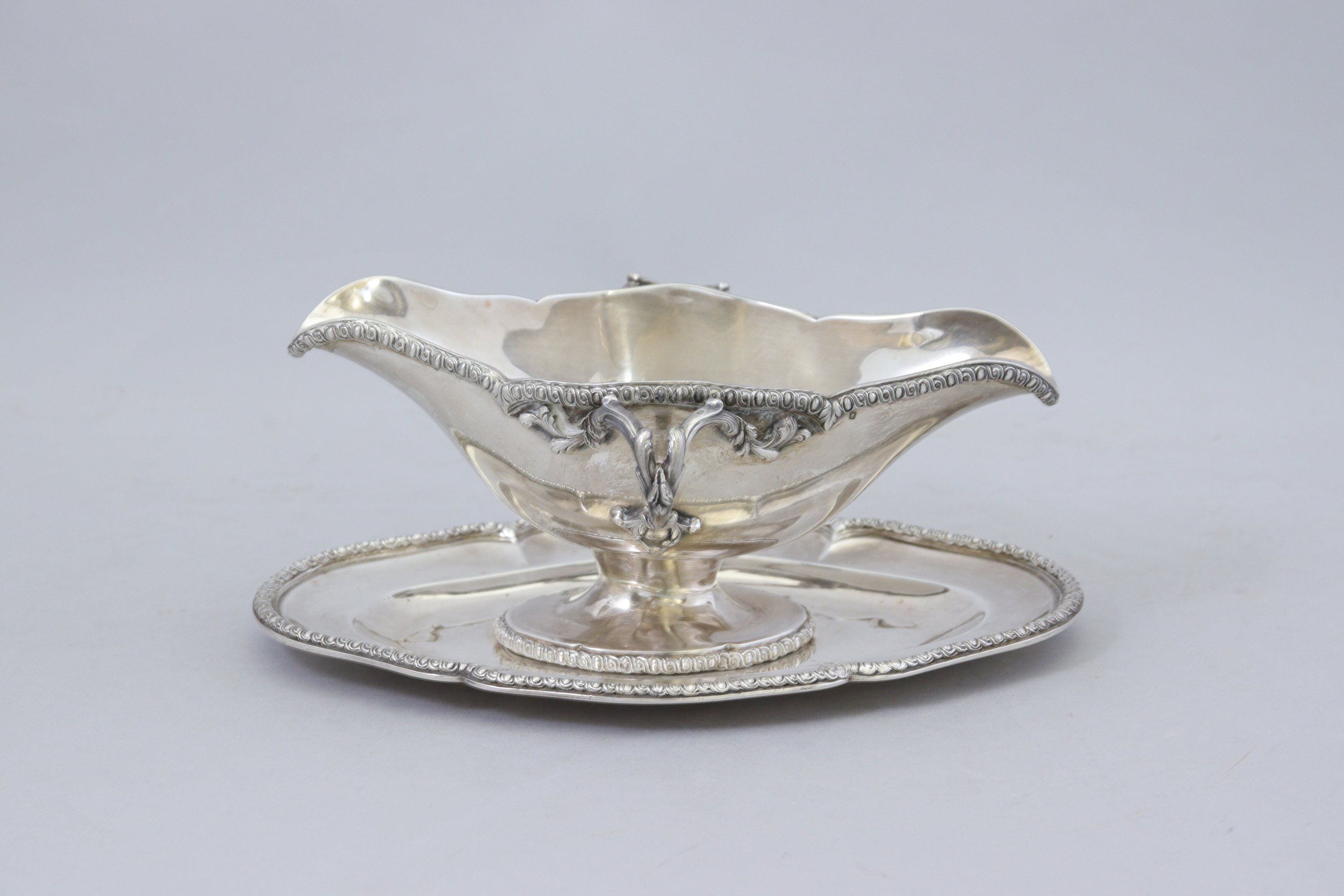 en argent à deux anses à feuilles d'acanthe et enroulements. La lèvre, le pied et le plateau mouvementé à décor d'oves et piastres.