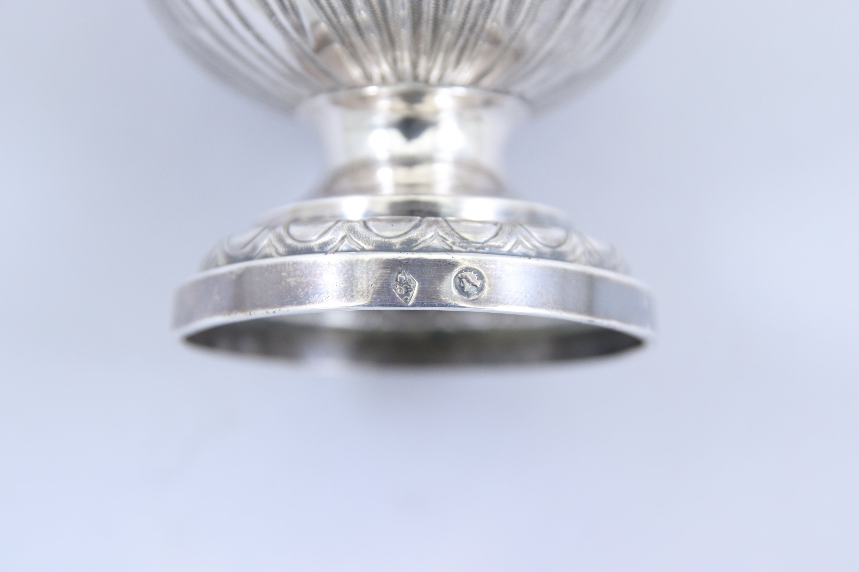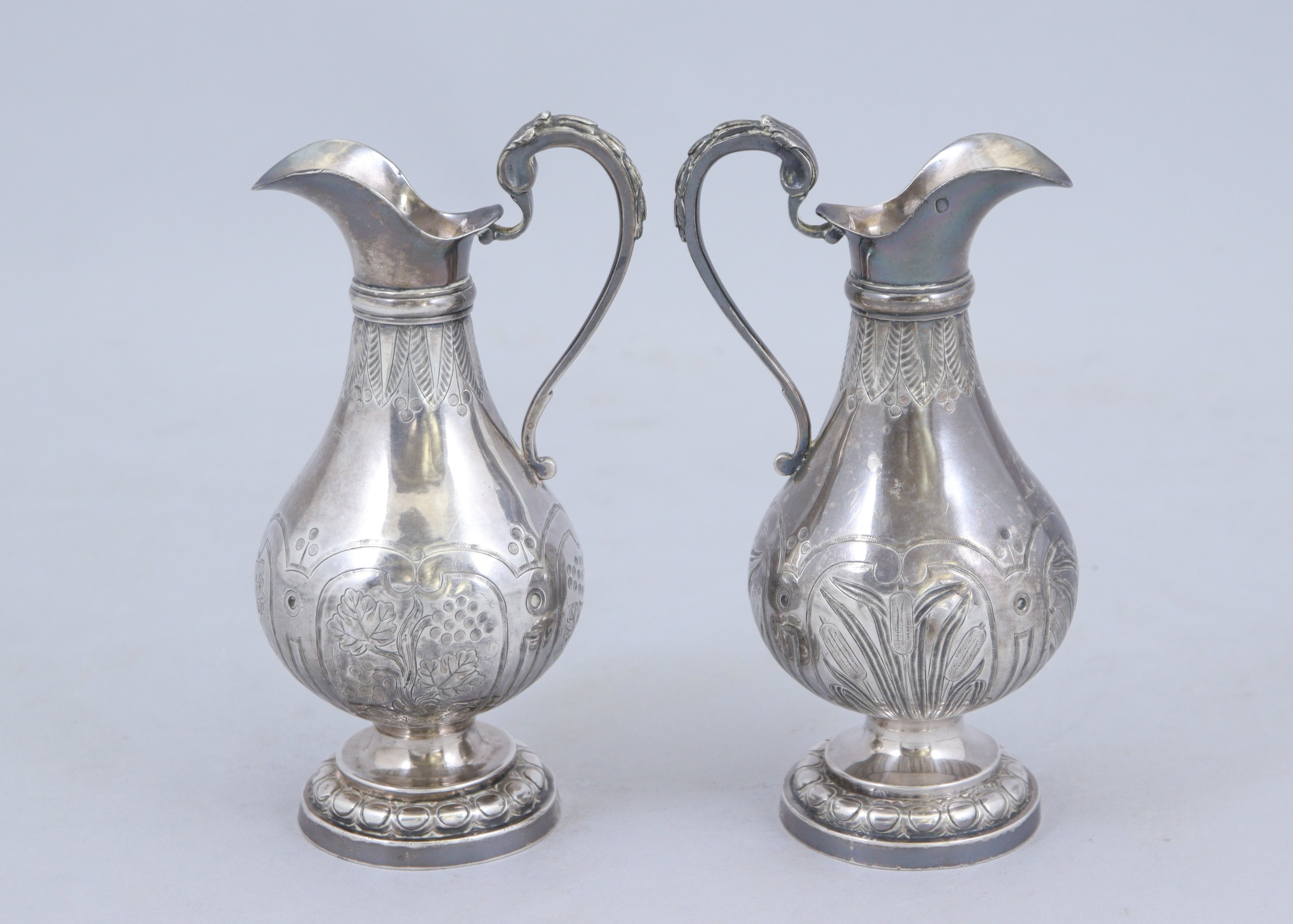 en argent. Les anses à décor de guirlandes de laurier, le col orné d'une bague. L'une gravée de pampres de vigne, l'autre de roseaux dans des cartouches avec le monogramme "A". Piétement circulaire.
