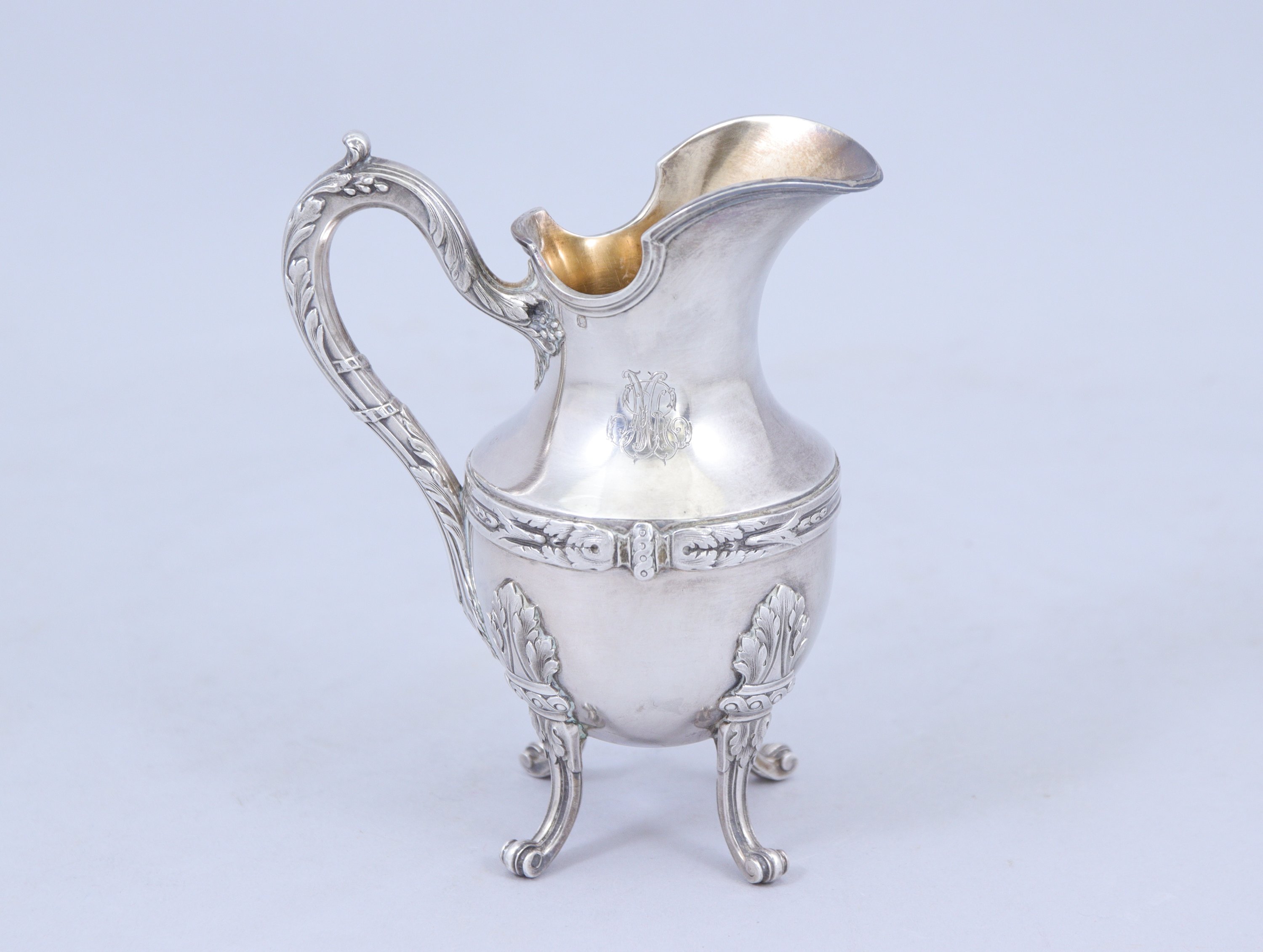 Joint: Pot à lait en argent, l'anse à feuilles d'acanthe, quatre pieds terminés en enroulement et coiffés de feuilles. Minerve. Orfèvre: Paul Tailois. Haut. 13,5 cm. Poids: 284 gr.