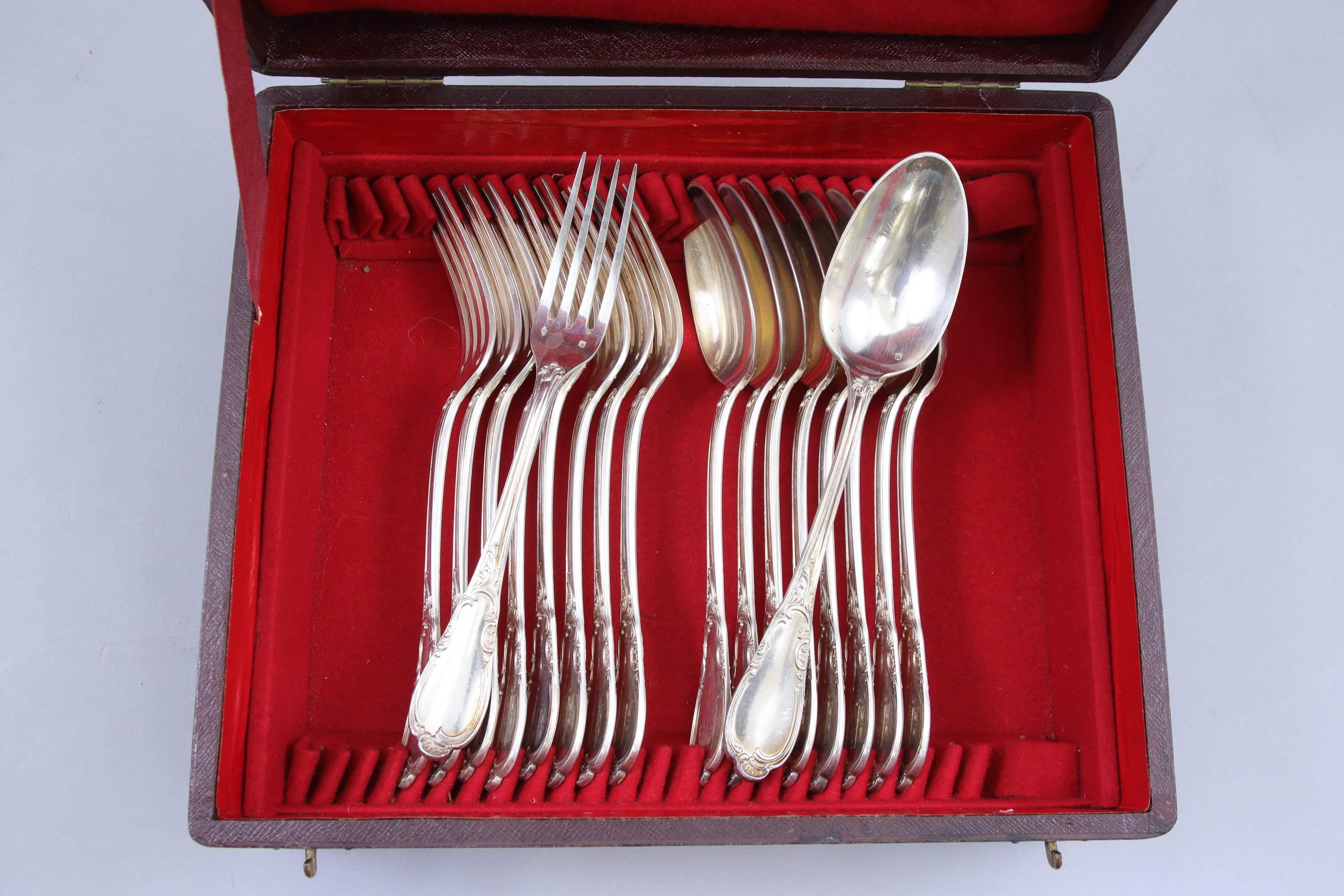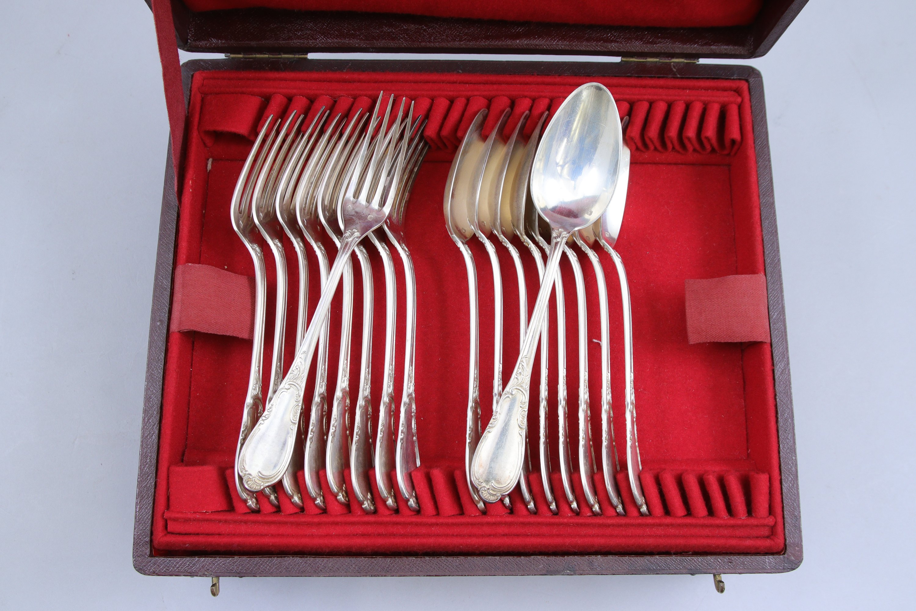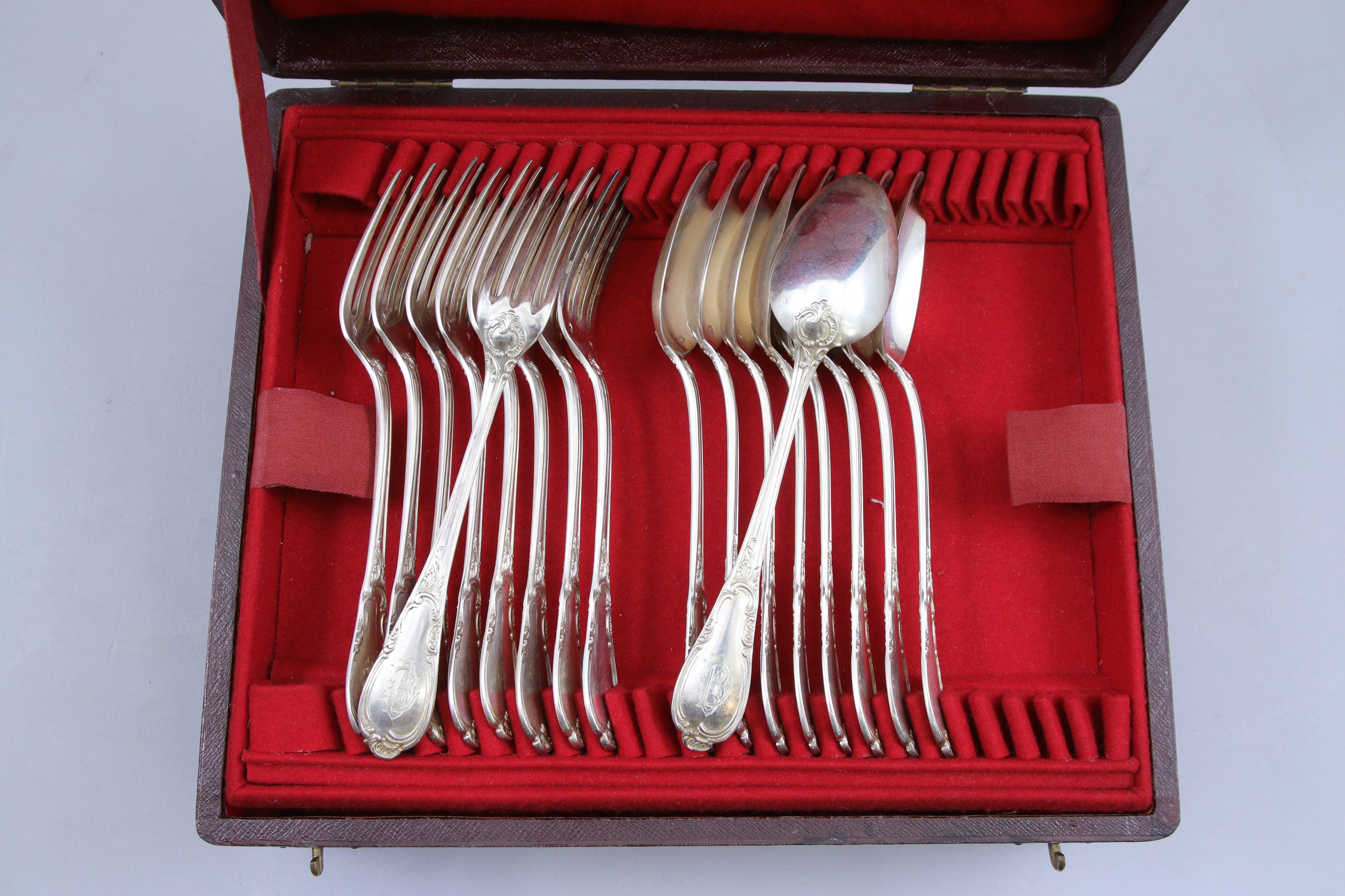 en argent de 36 pièces, modèle piriforme agrafée de volutes d'acanthes et chiffré BD, comprenant: neuf couverts de table et neuf couverts à dessert.