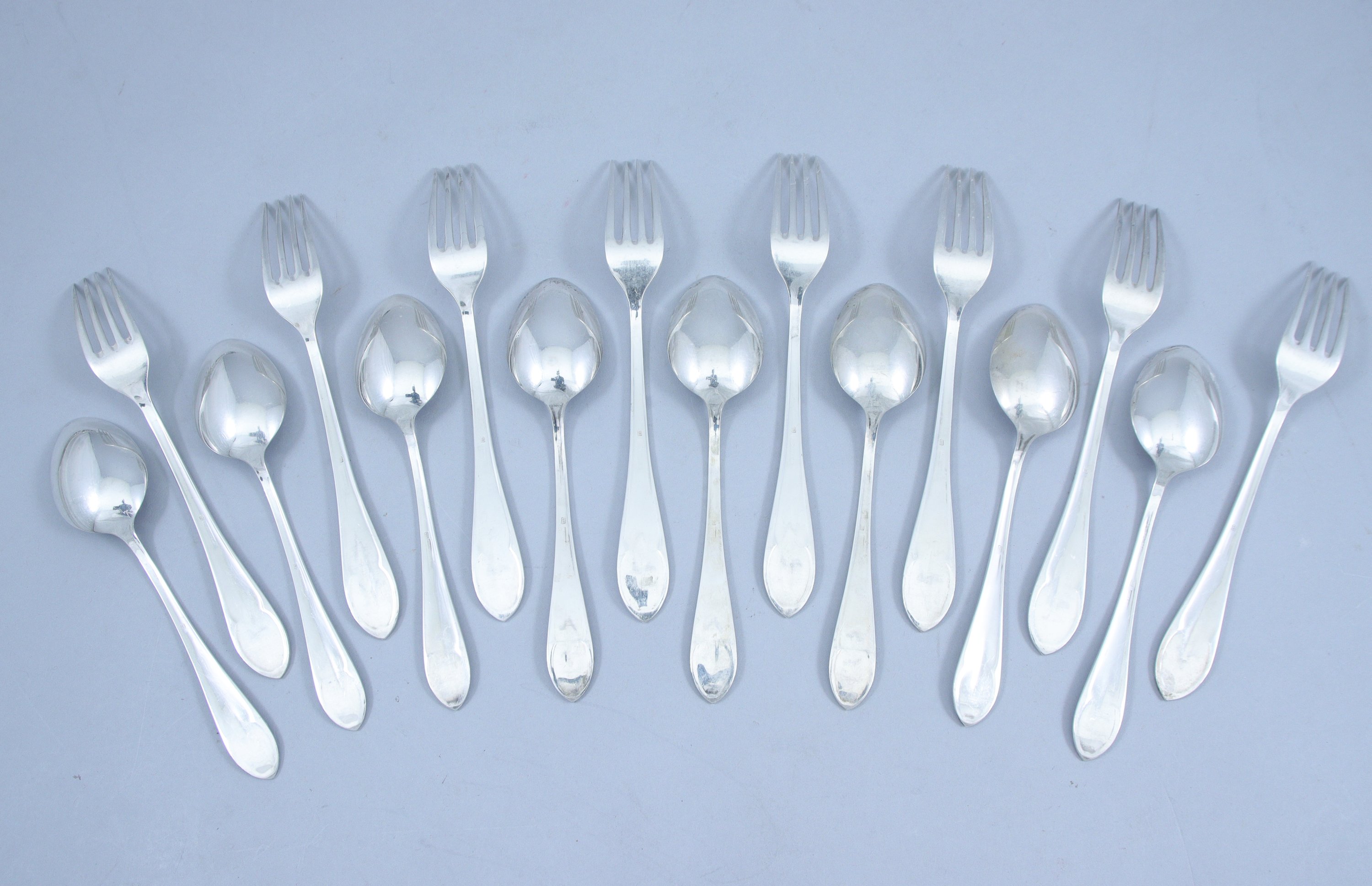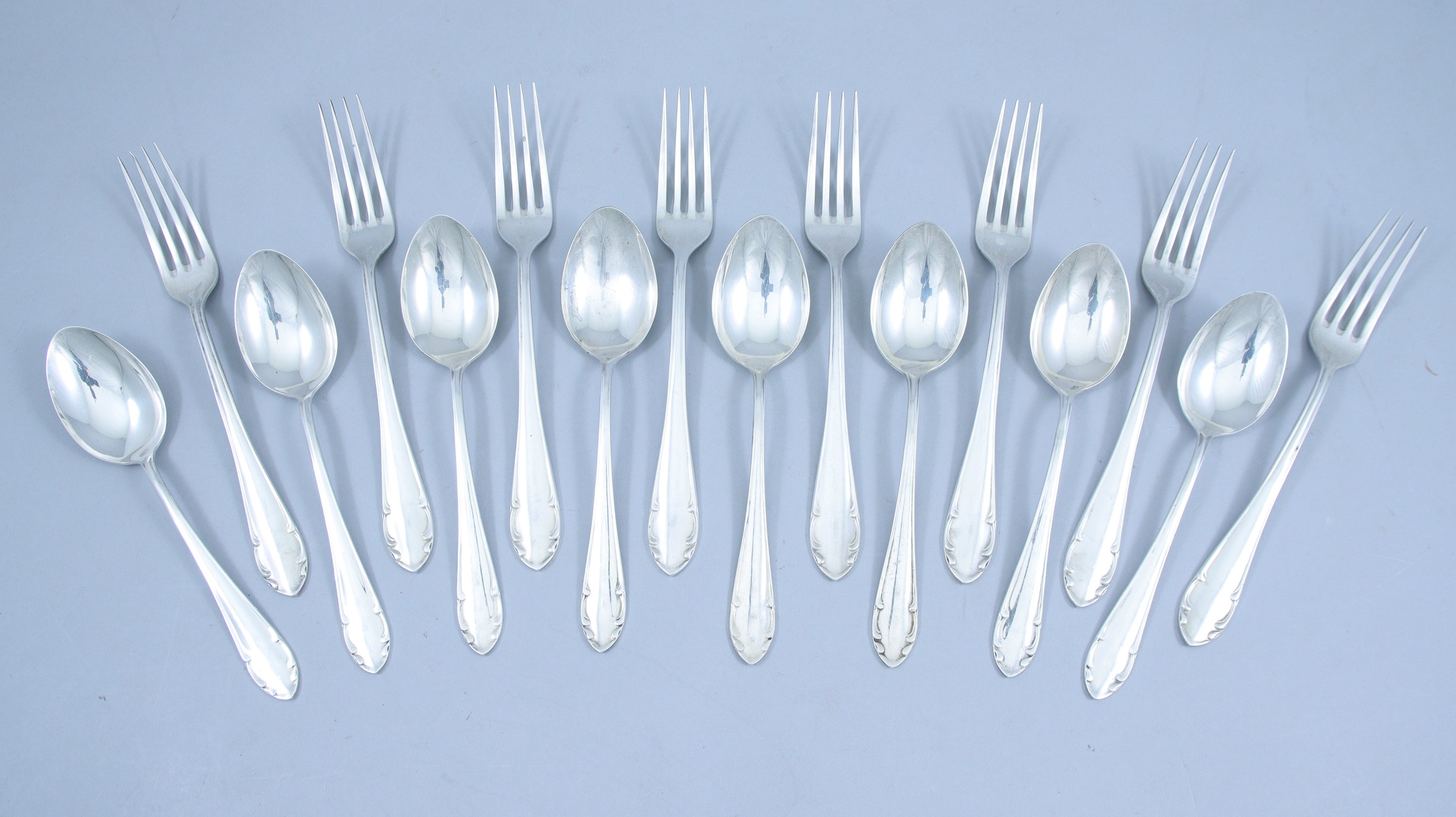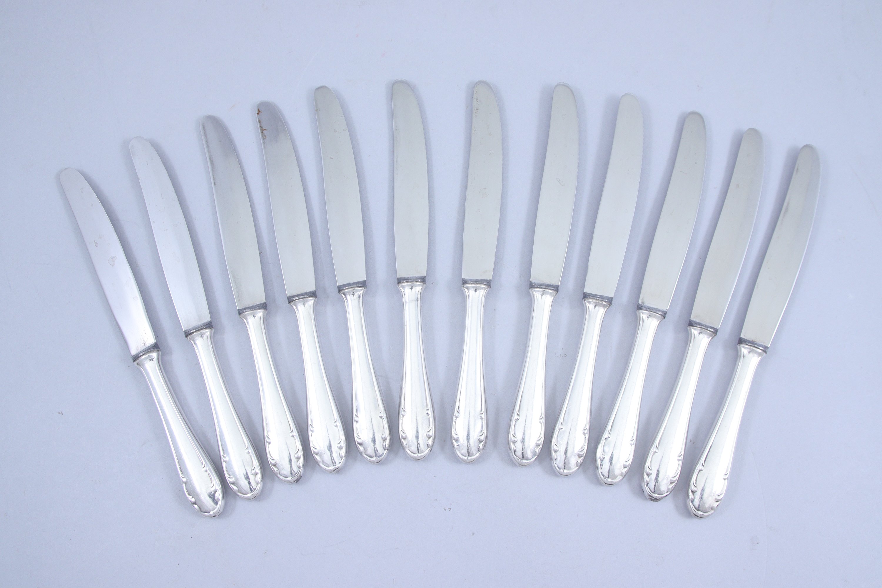 en argent, modèle à feuilles d'acanthe, de 28 pièces composée de huit fourchettes de table, douze grands couteaux de table à lame inox, et huit cuillers à entremets.