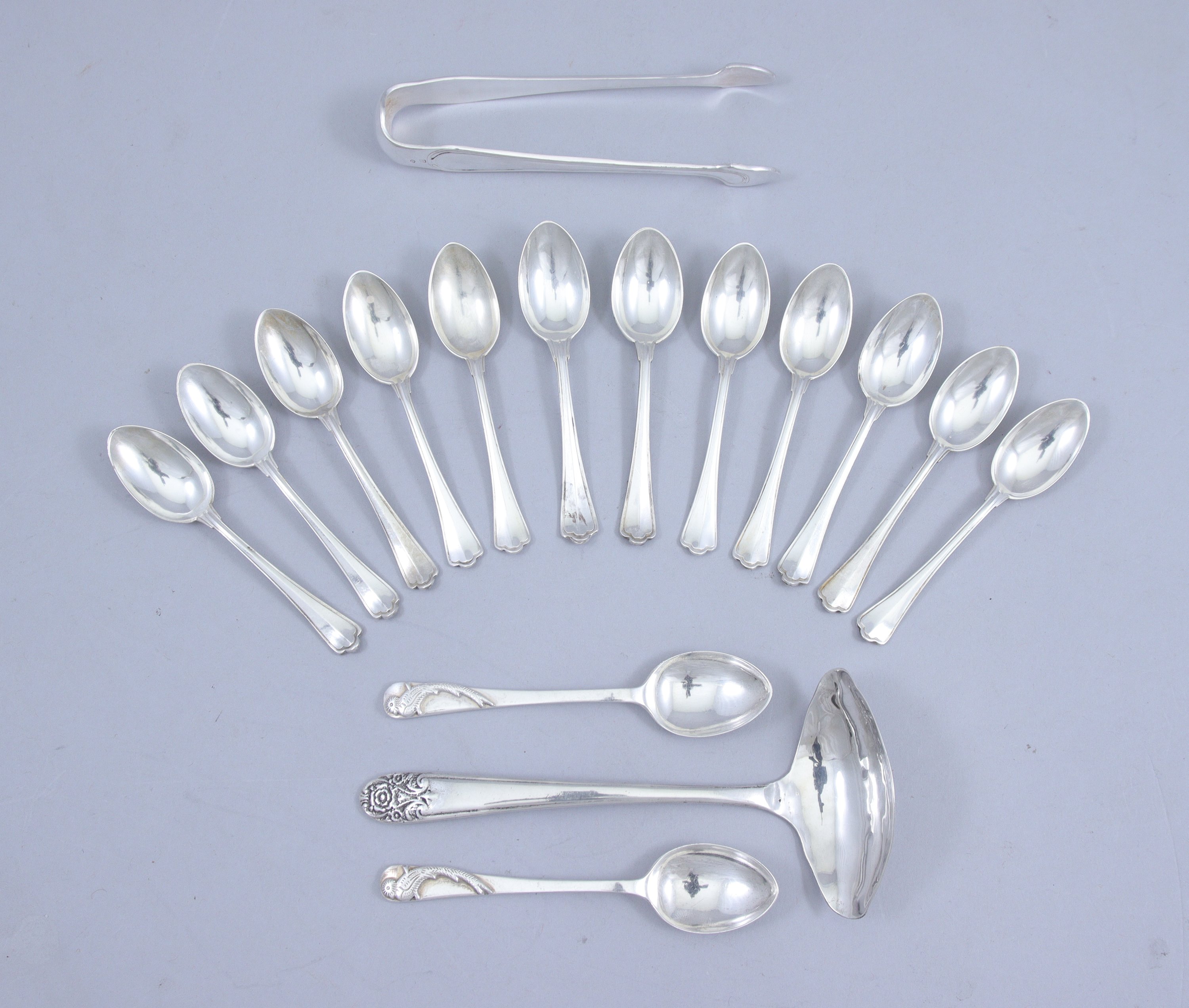 - une pince à sucre à décor de filet et une cuiller à sauce ornée de fleurs en métal argenté.