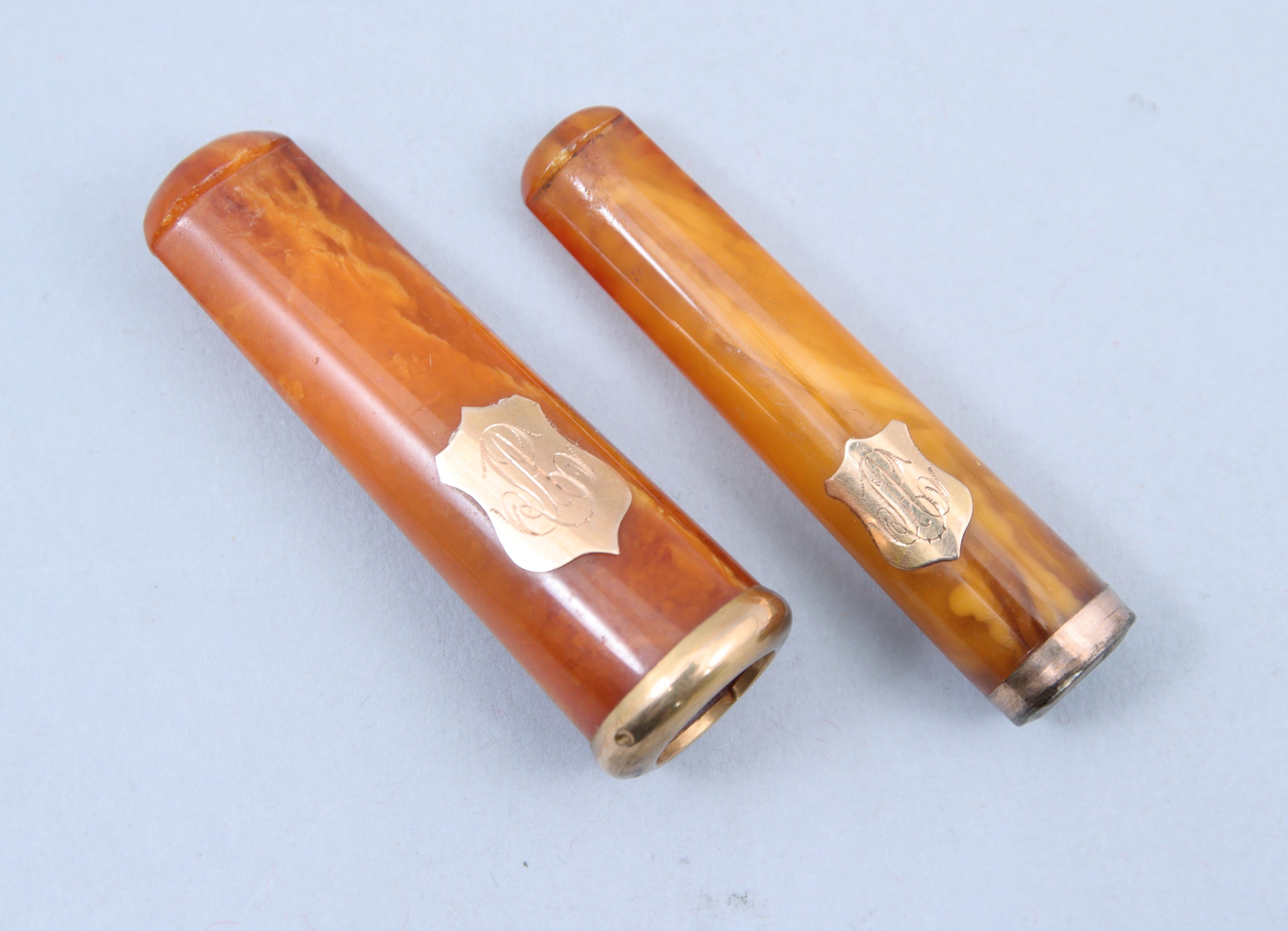 Joints: deux fume-cigarettes en ambre, l'un à monture or, l'autre en métal doré. Chacun monogrammé dans un cuir. Poids brut: 13,4 gr.