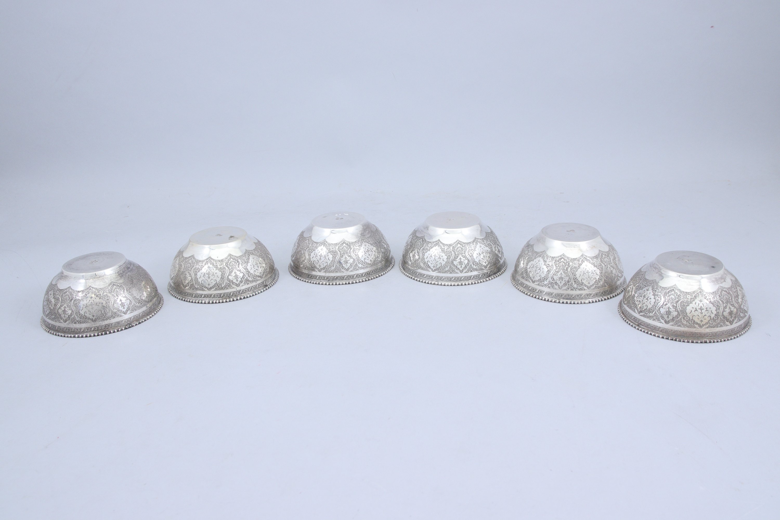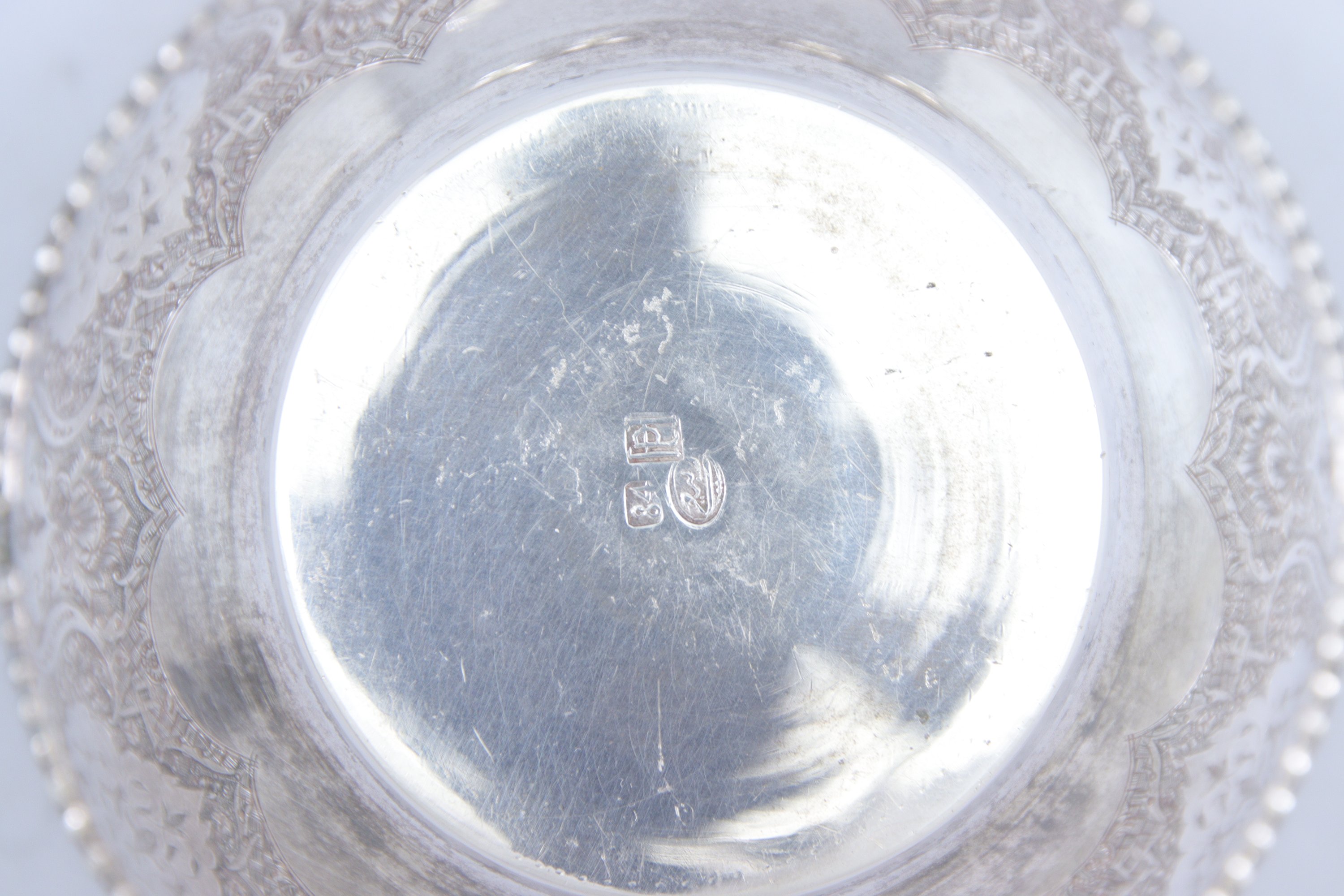 en argent. La lèvre soulignée d'un rang de perles surmontant une frise de fleurettes épanouies. La panse est finement gravée de motifs végétaux formant des réserves .