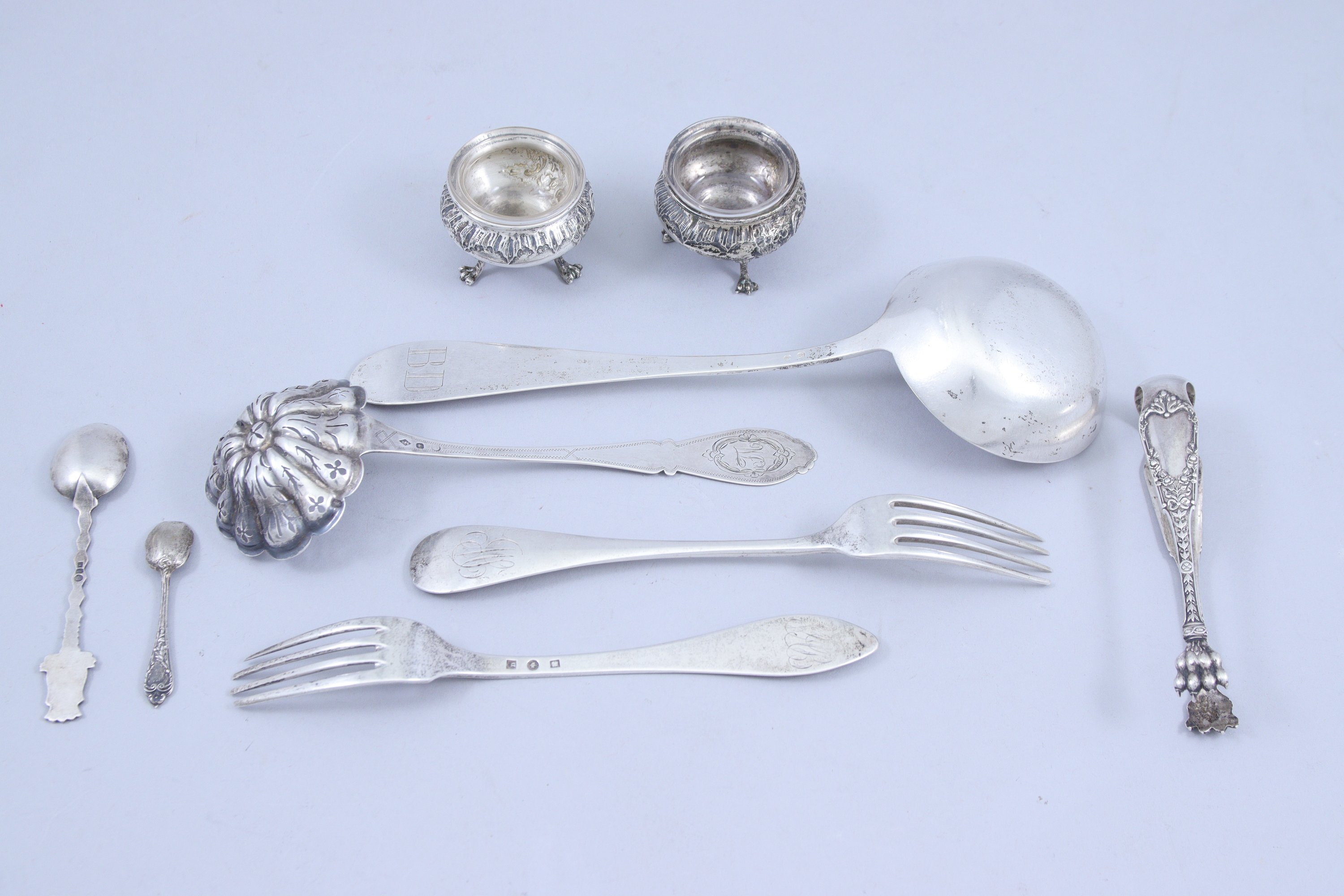 Joint: une louche, une pince à sucre et une paire de salerons en argent (poinçons de titre étranger) ainsi qu'une cuiller à saupoudrer en argent (poinçon Minerve) et deux fourchettes (Poids: 380 gr), et deux cuillers en métal.