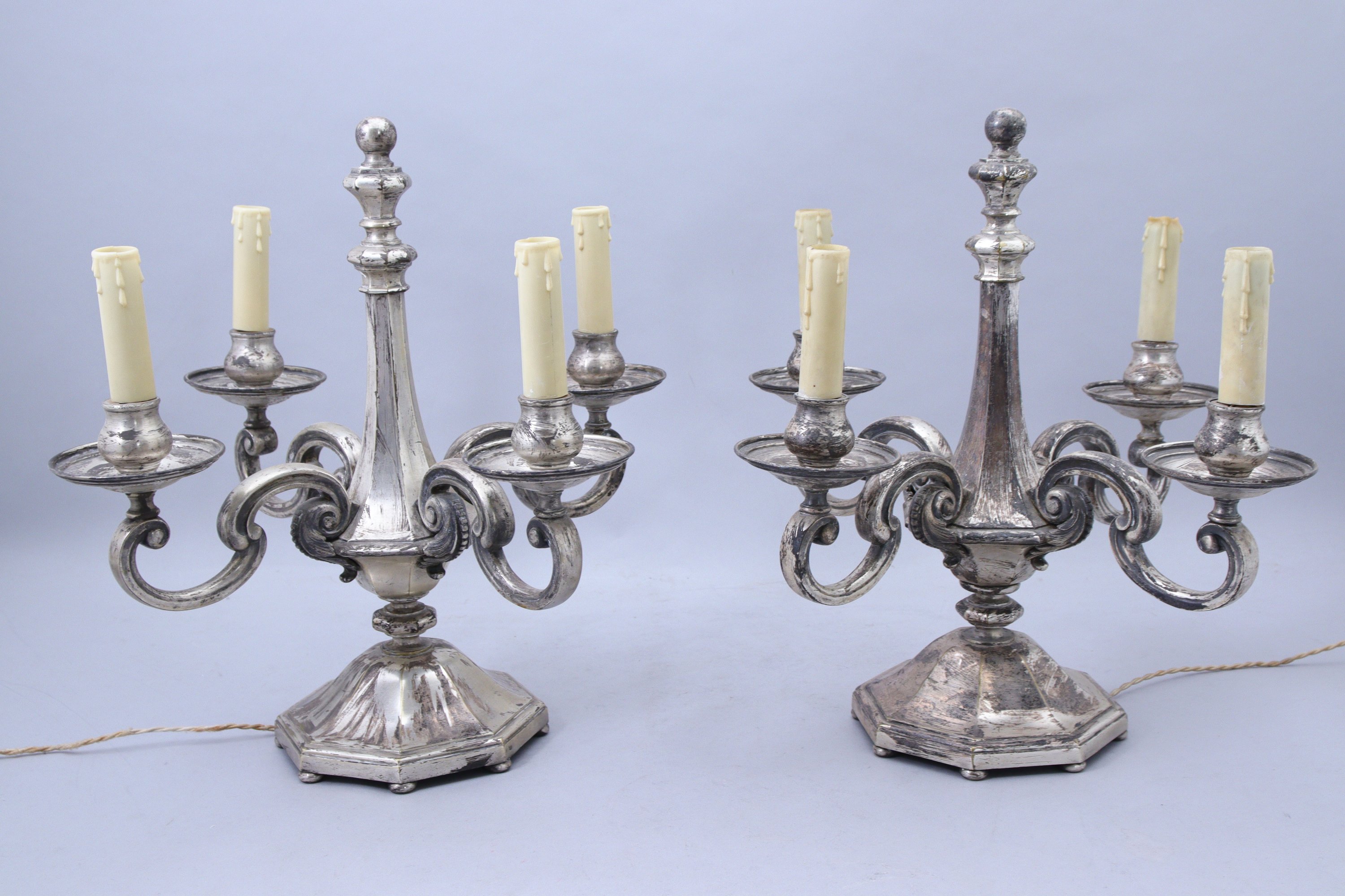 en bronze argenté, à quatre bras de lumière ouvragés et décorés de feuilles d'acanthe, fût et pied de forme octogonale.