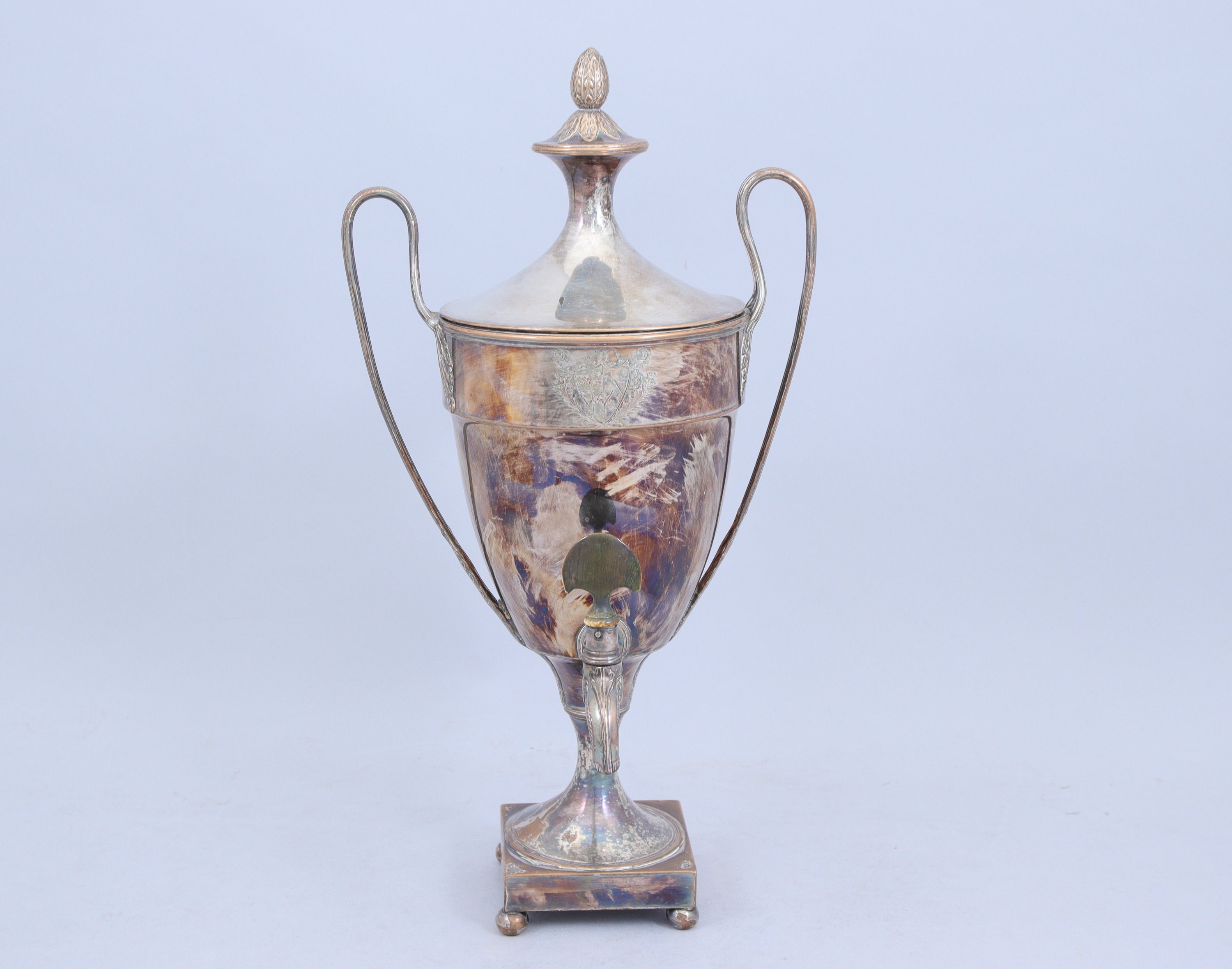 en métal argenté. Le couvercle coiffé d'une pomme de pin sur une terrasse de feuilles entouré de deux anses moulurées terminées par des feuilles d'acanthe. Le col présente des armoiries d'alliance. Le bec à décor de médaillons entourés de guirlandes feuillagées et surmonté d'un bouton en corne. Il repose sur un piédouche terminé par une base carrée. Quatre pieds boules.
