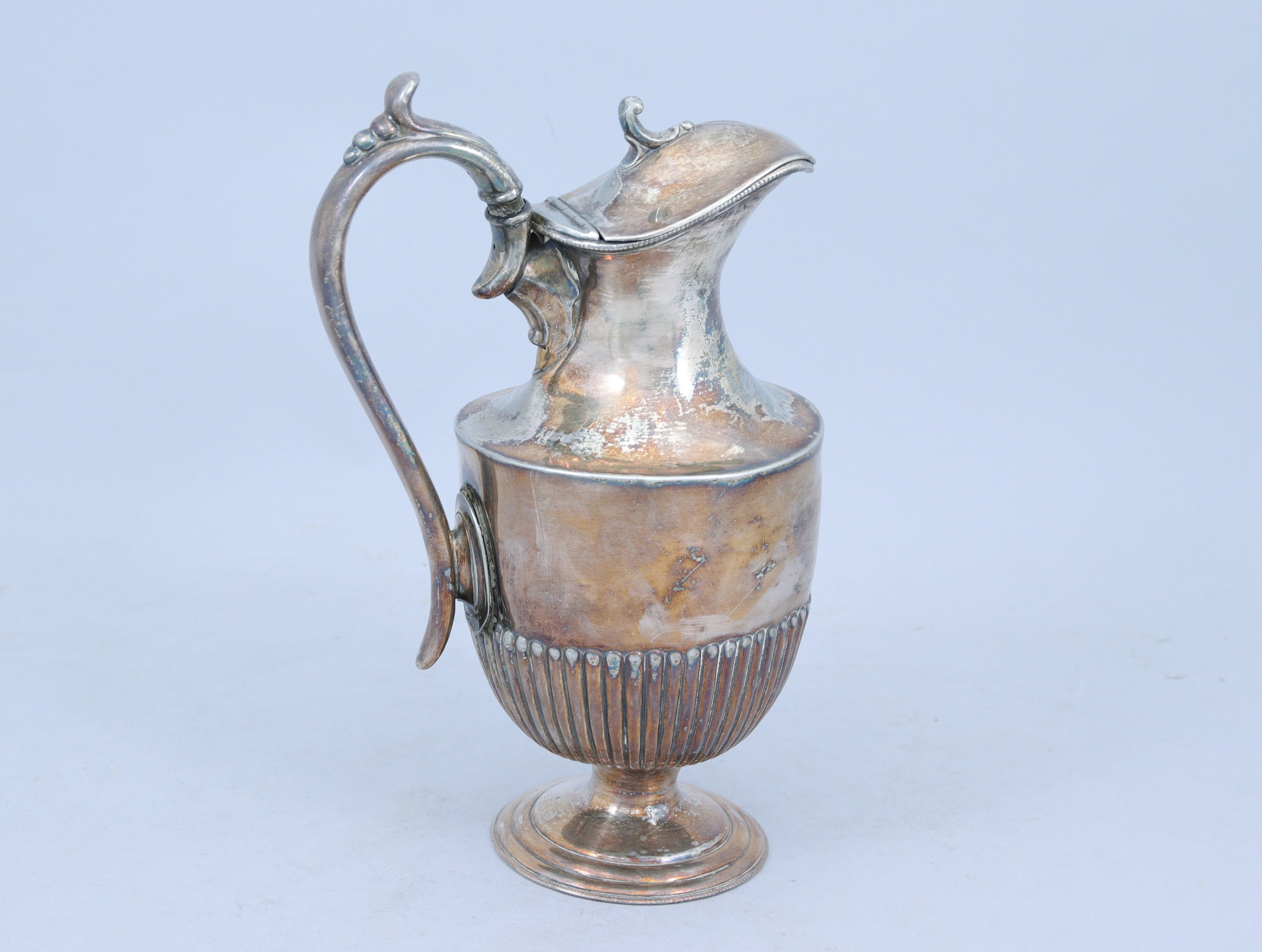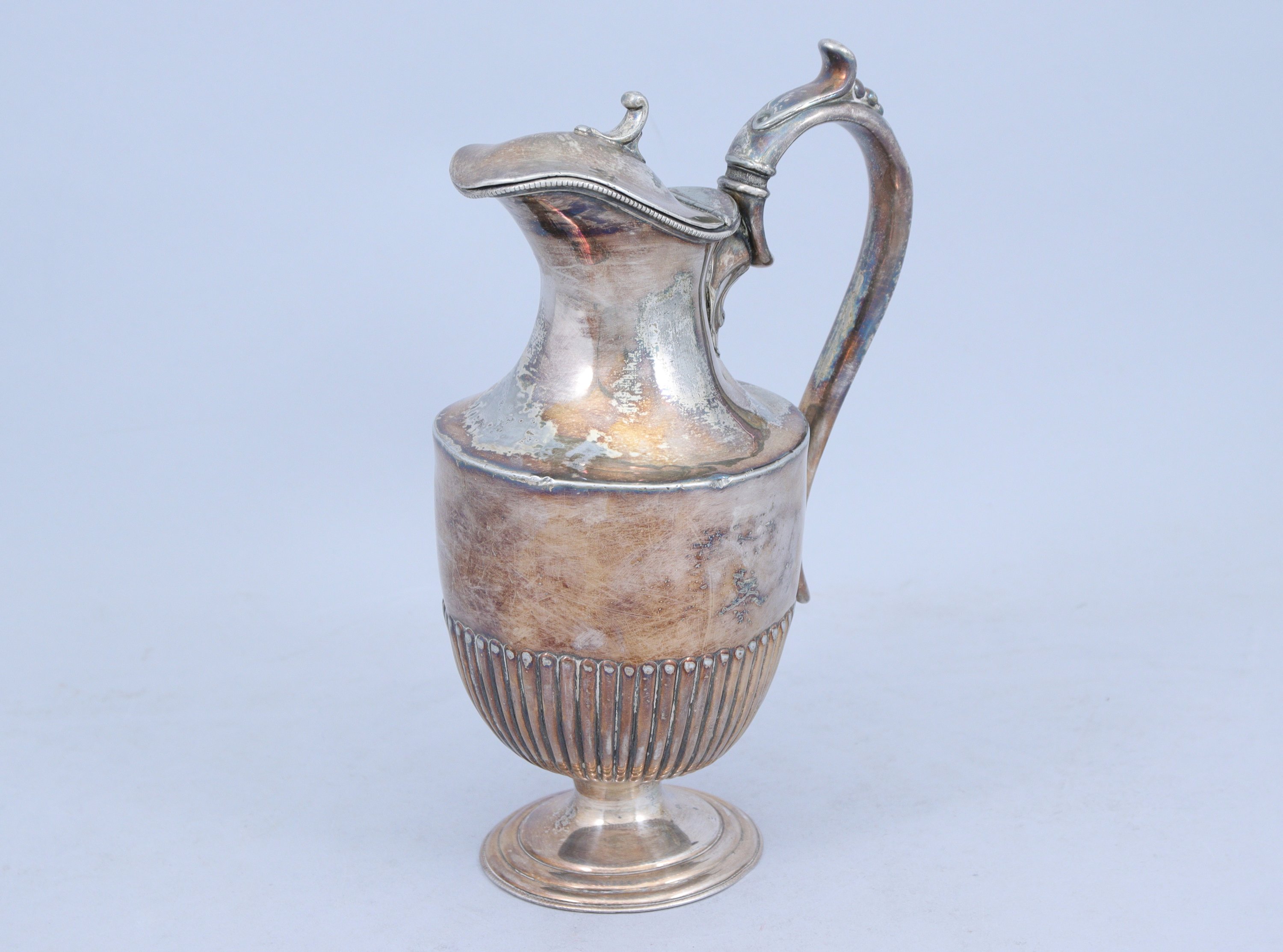 en métal argenté. Le couvercle présente un appui-pouce en agrafe, l'anse reprenant le même décor. Le bec est orné d'une frise de perles, la panse offre en partie basse des motifs de godrons. L'ensemble repose sur un pied circulaire.