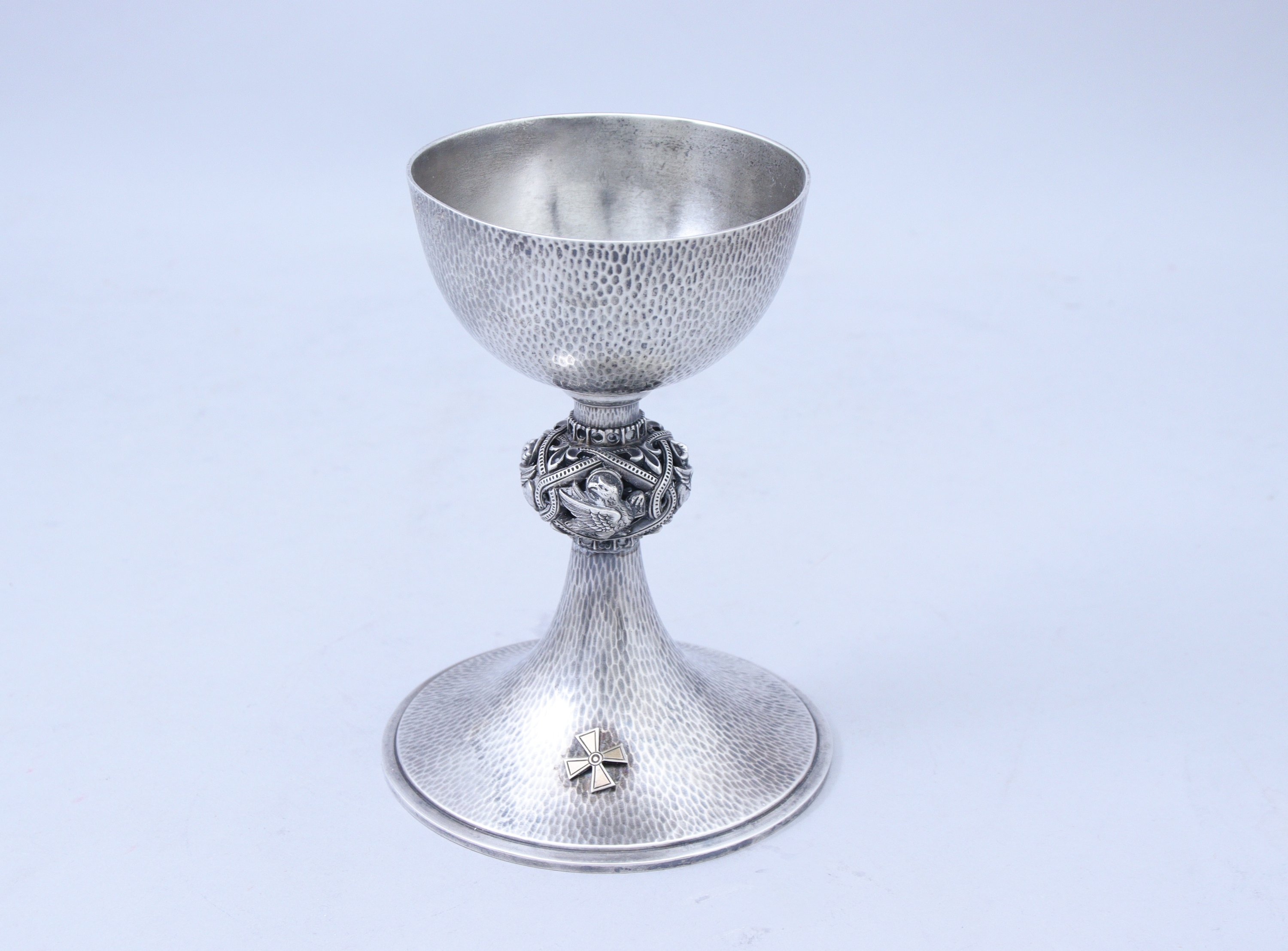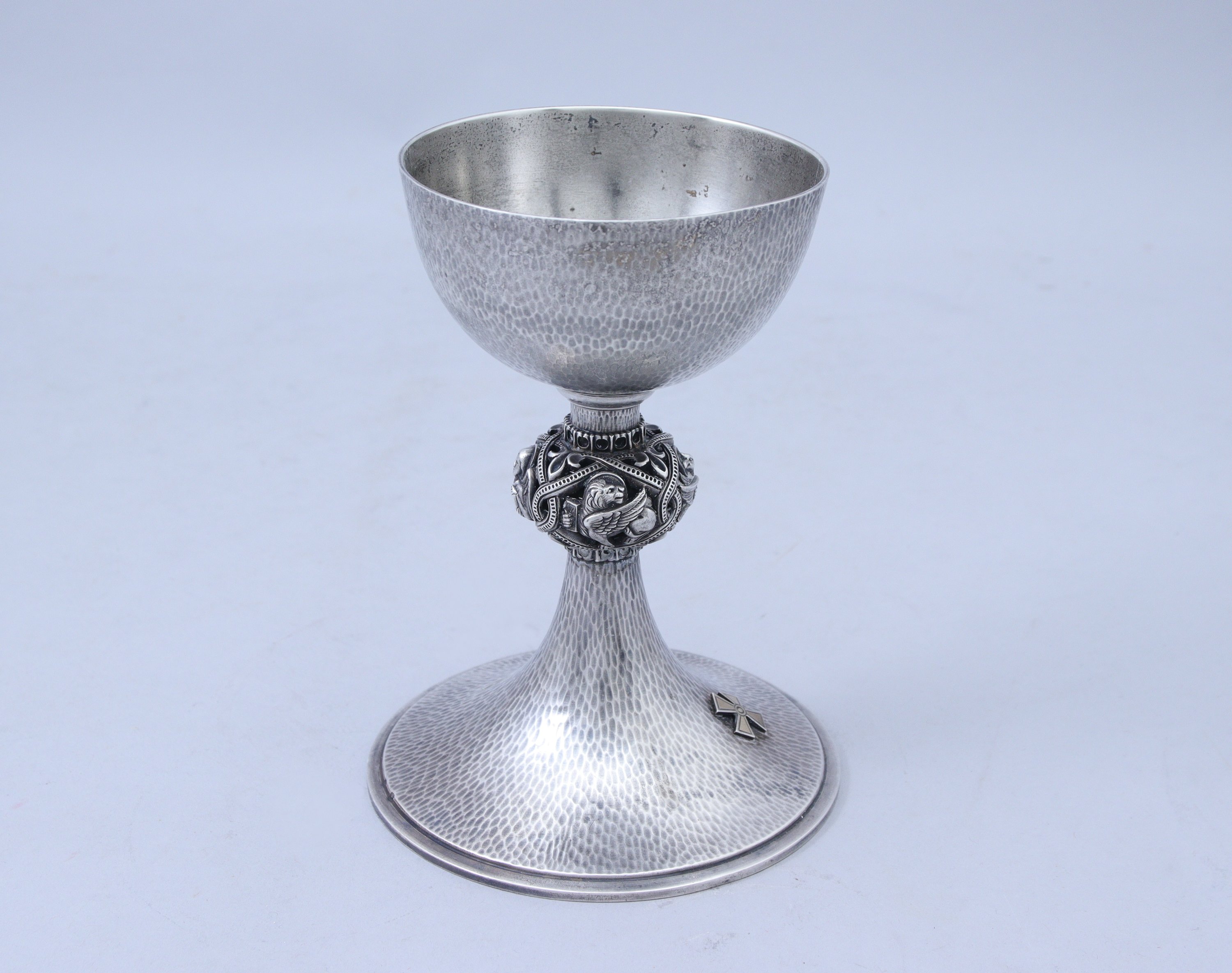 en argent, à décor ciselé et martelé. Le pied ajouré figure le tétramorphe dans un entourage d'enroulements. Une croix sur le pied circulaire.