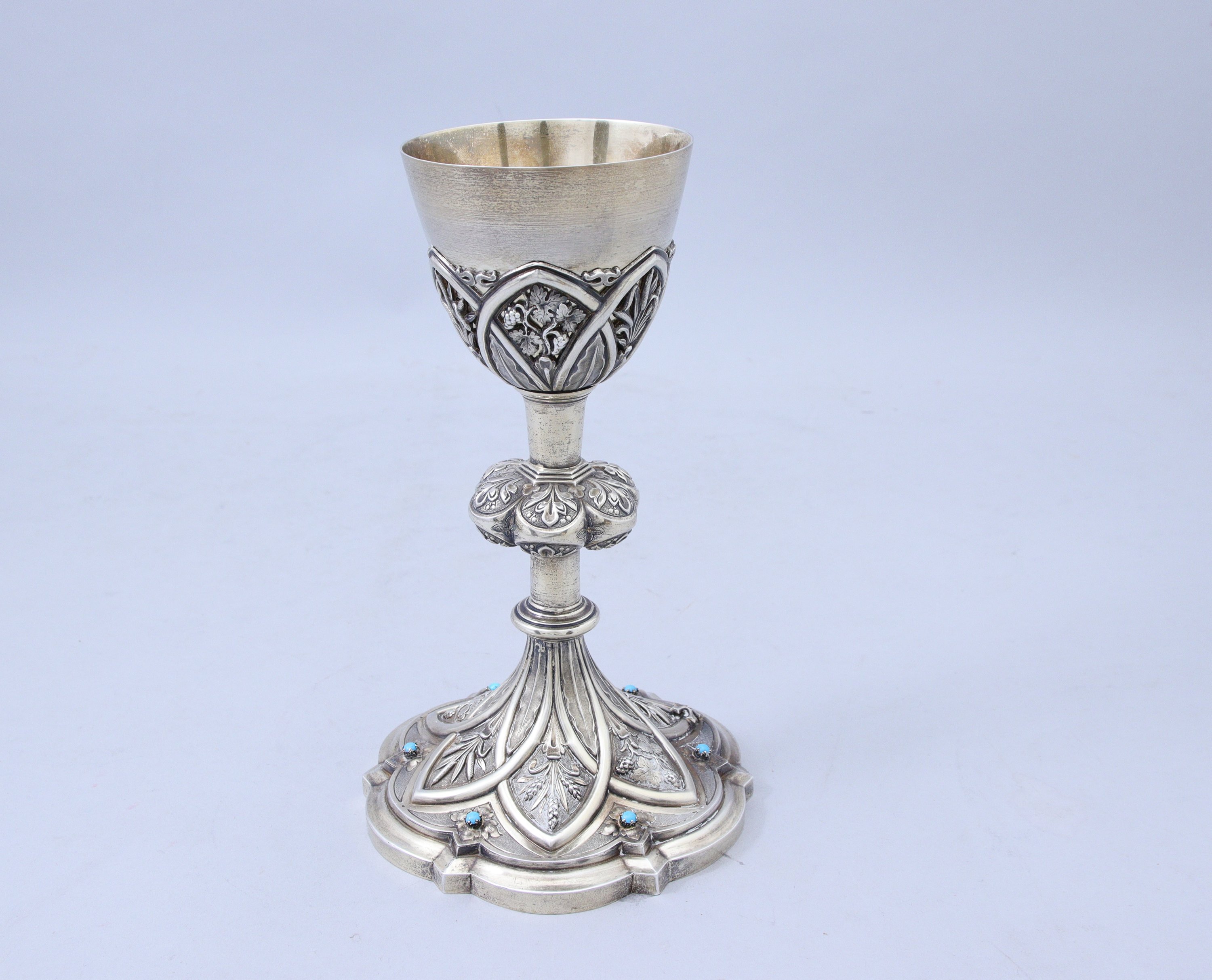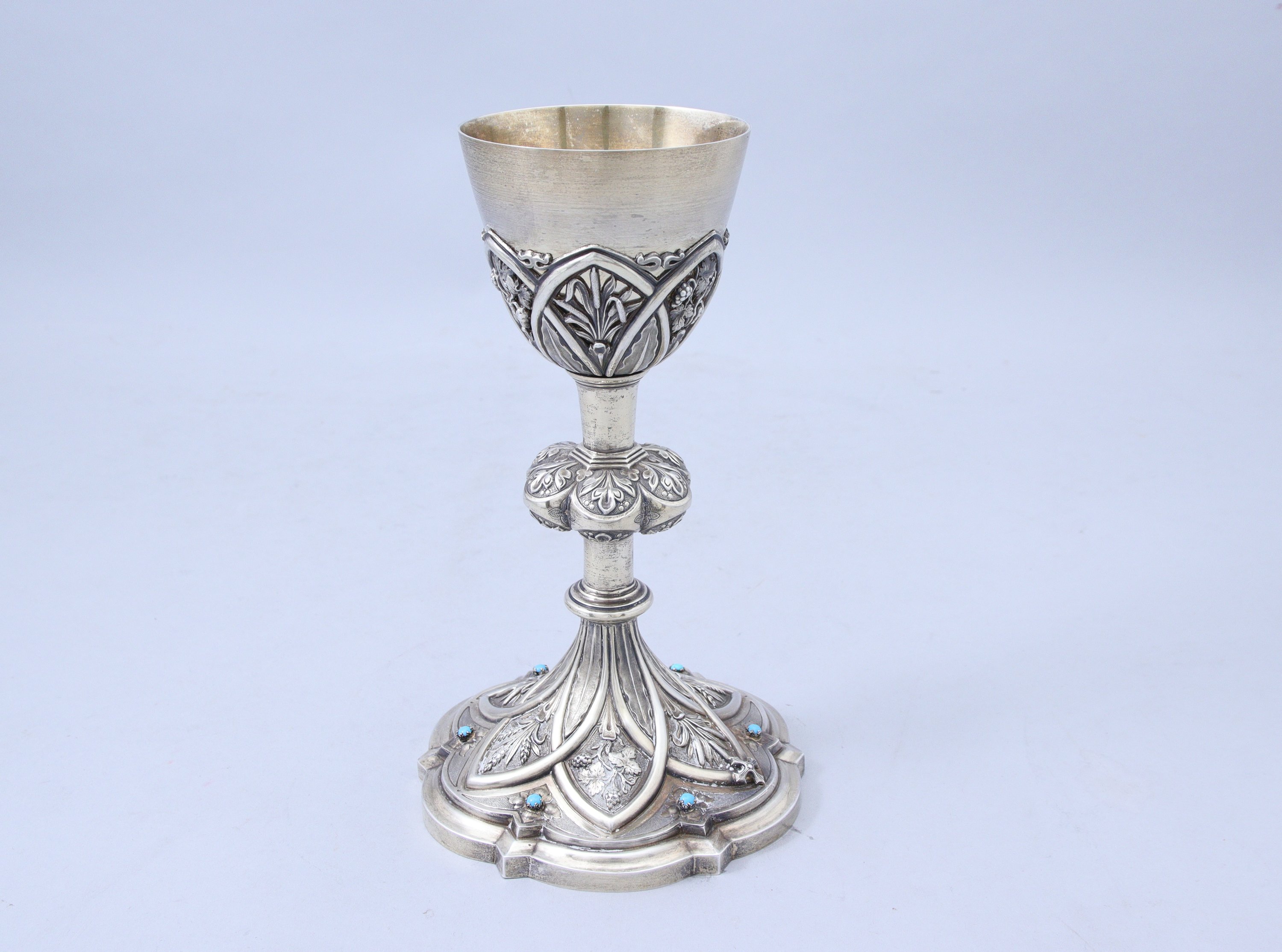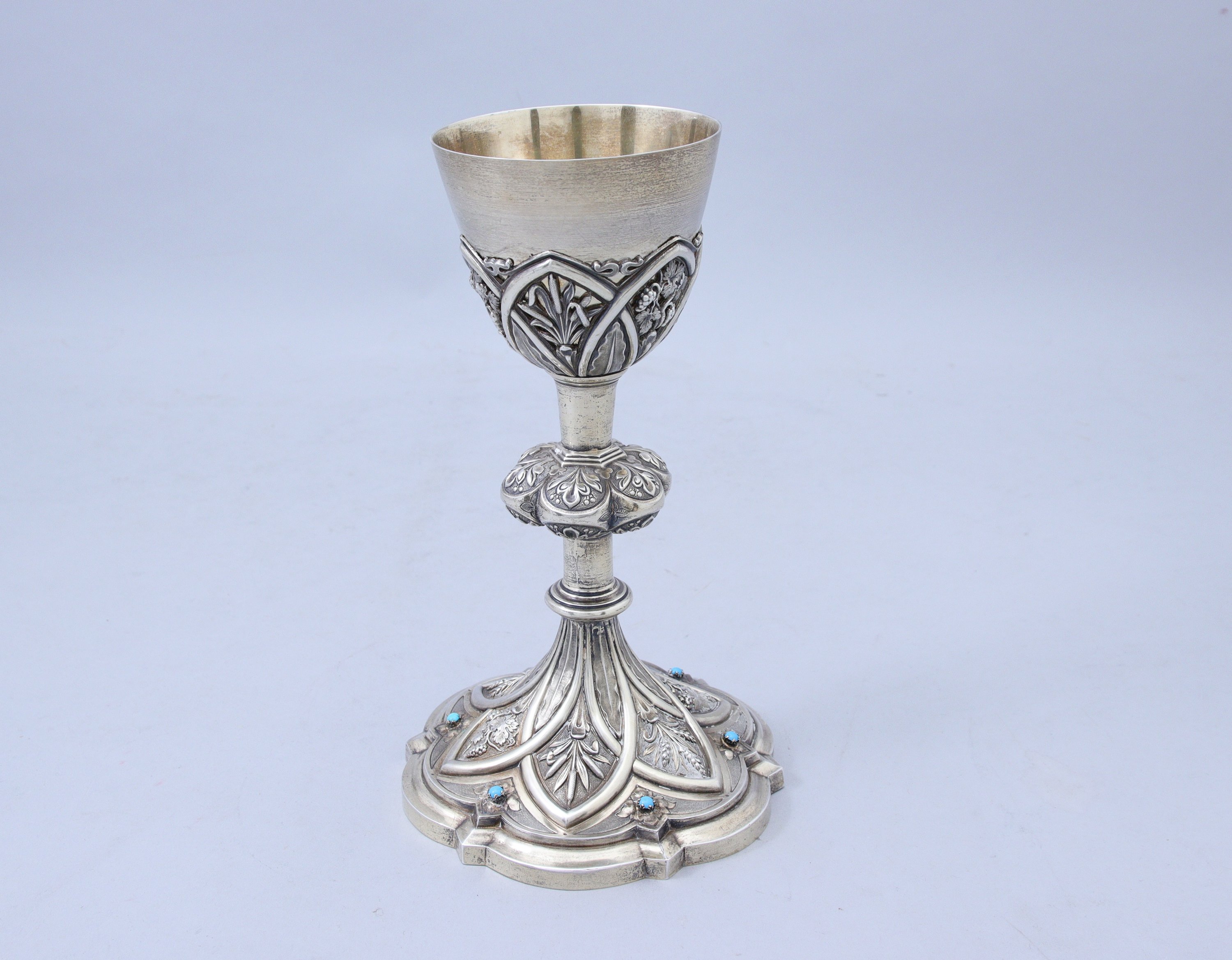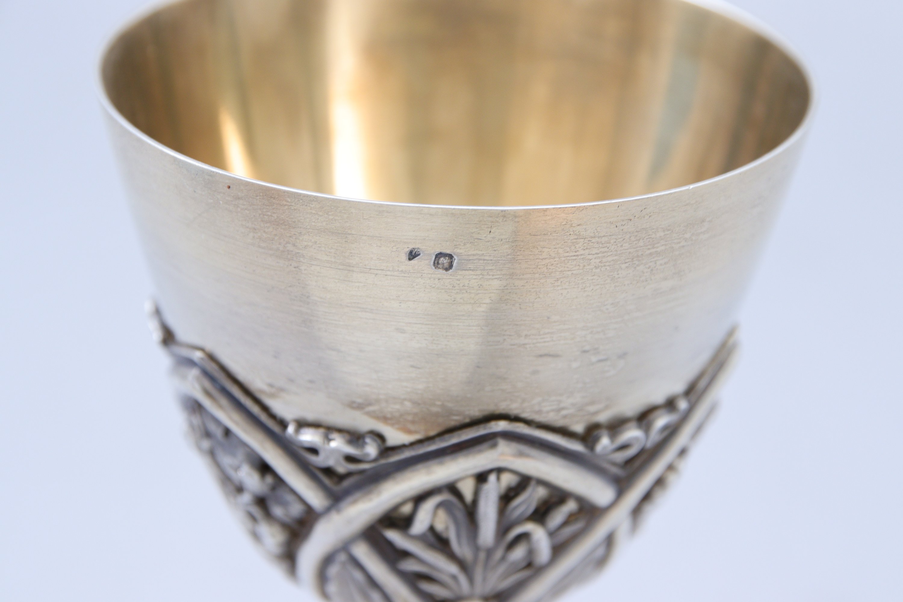 en vermeil à décor repoussé. La fausse-coupe présente des roseaux et pampres de vigne dans des formes lancéolées en alternance de feuilles d'eau. Le pied à six lobes ornés de feuilles d'acanthe. La base ornée de cabochons turquoises reprend un décor lancéolé dans lequel sont inscrits roseaux, épis de blé et pampres de vigne. Elle est terminée par une doucine polylobée.