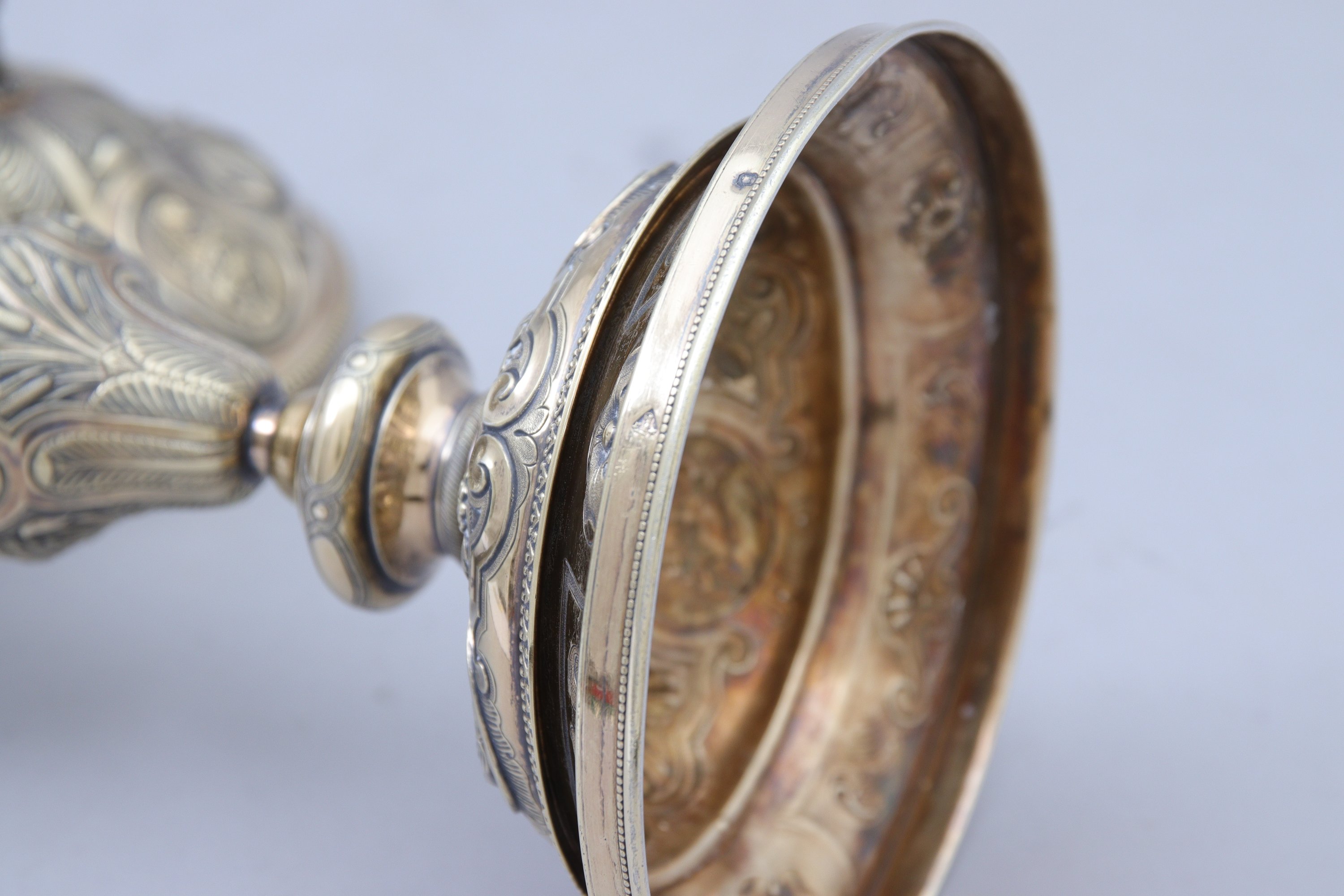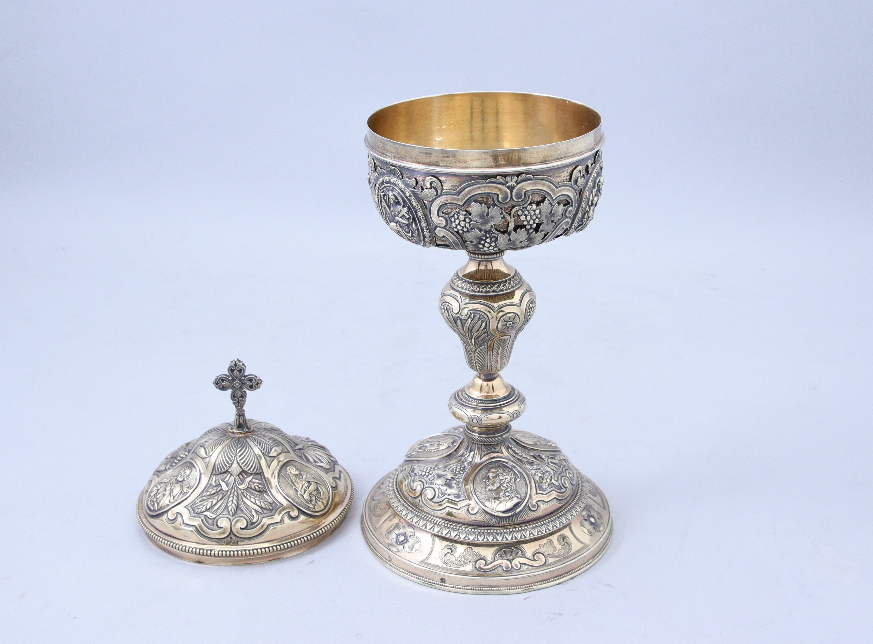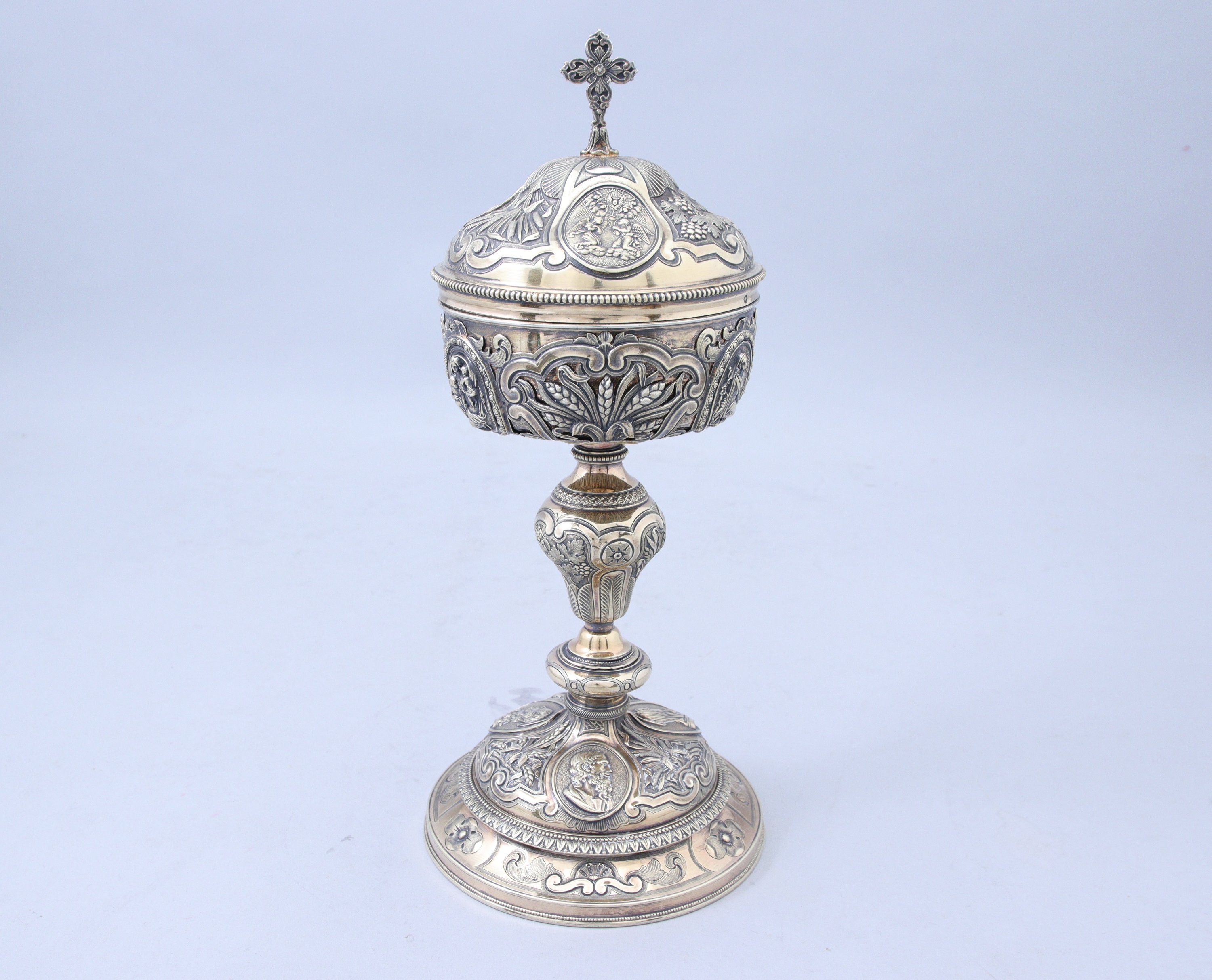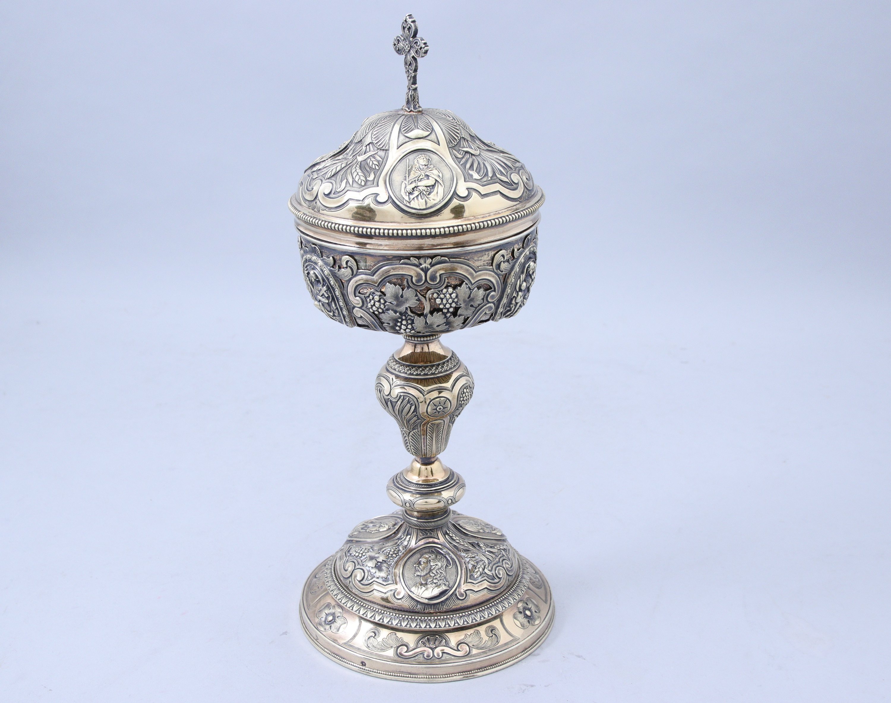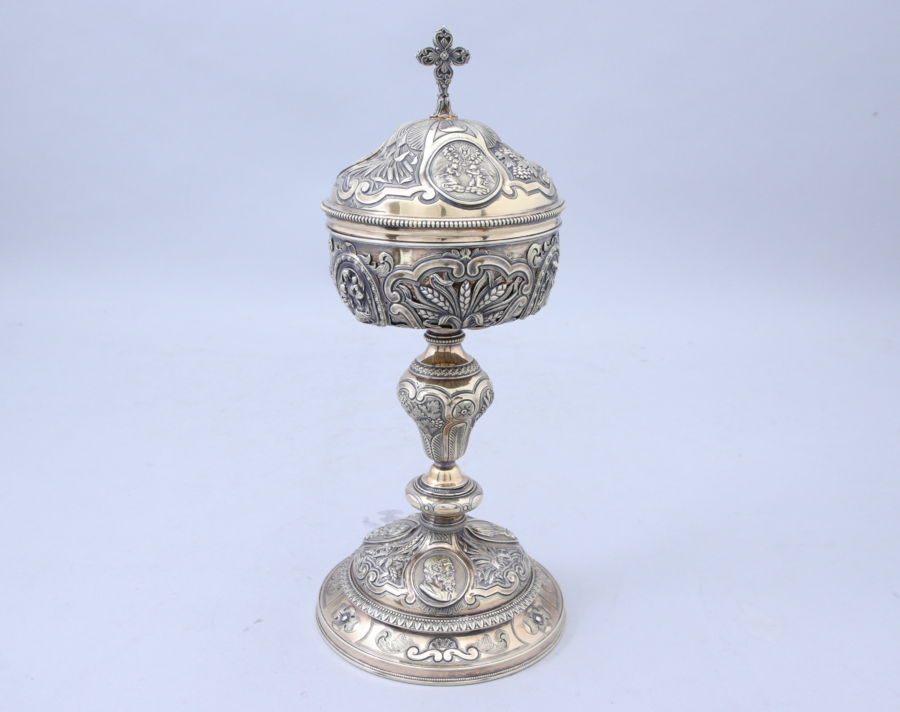 en vermeil, à décor repoussé et appliqué. Le couvercle sommé d'une croix latine, la terrasse à décor de trois médaillons figurant Saint Pierre, le Christ aux outrages et deux anges en prière sous l'esprit Saint, en alternance d'épis de blé, roseaux et pampres de vigne. La coupe est ornée de trois médaillons. Le premier figure l'allégorie de la Charité, le deuxième l'Espérance et le troisième la Foi. Le pied de forme balustre reprenant le même répertoire iconographique. La base circulaire figure le portrait du Christ, de la Vierge Marie et de Saint Joseph.