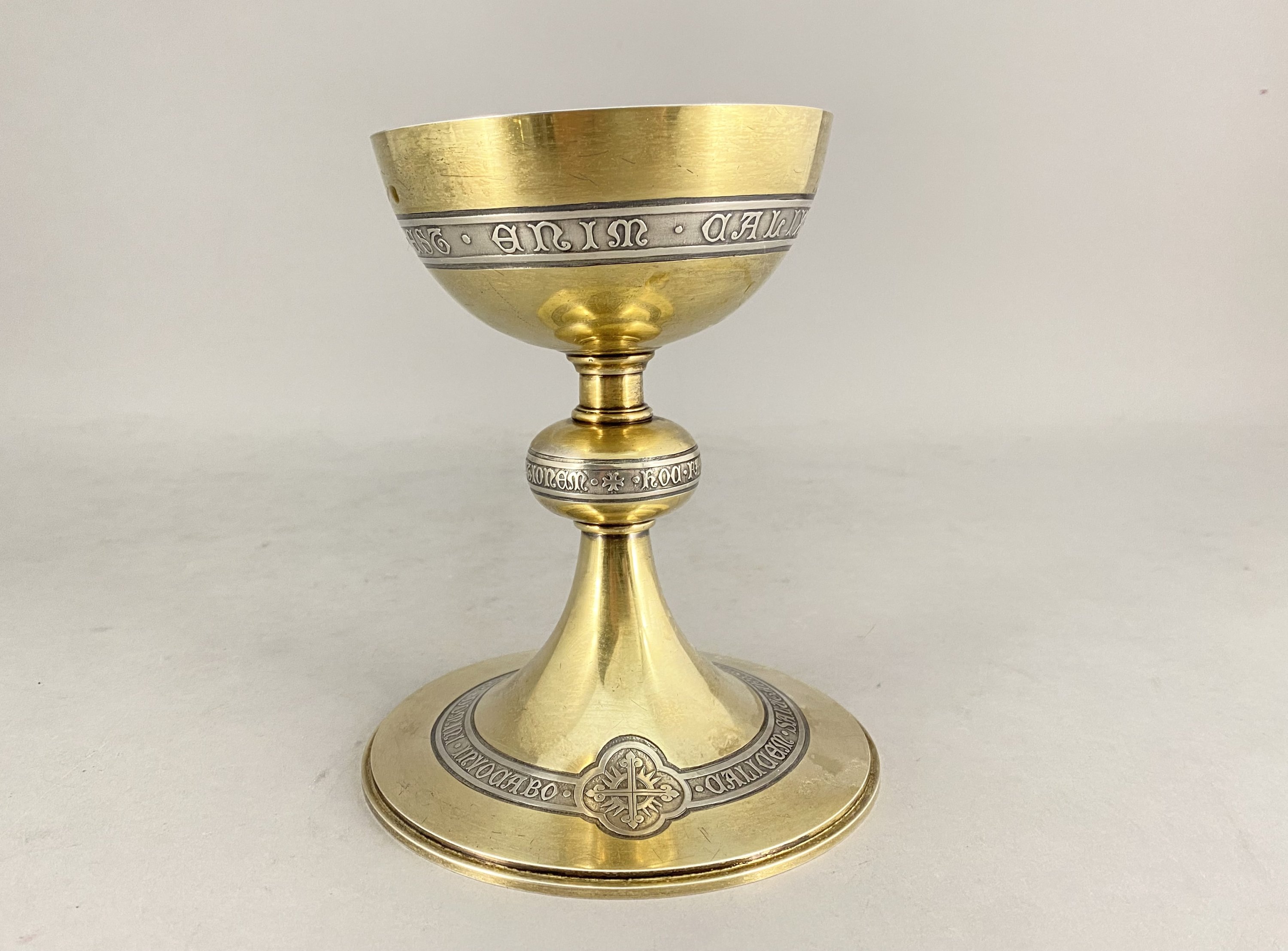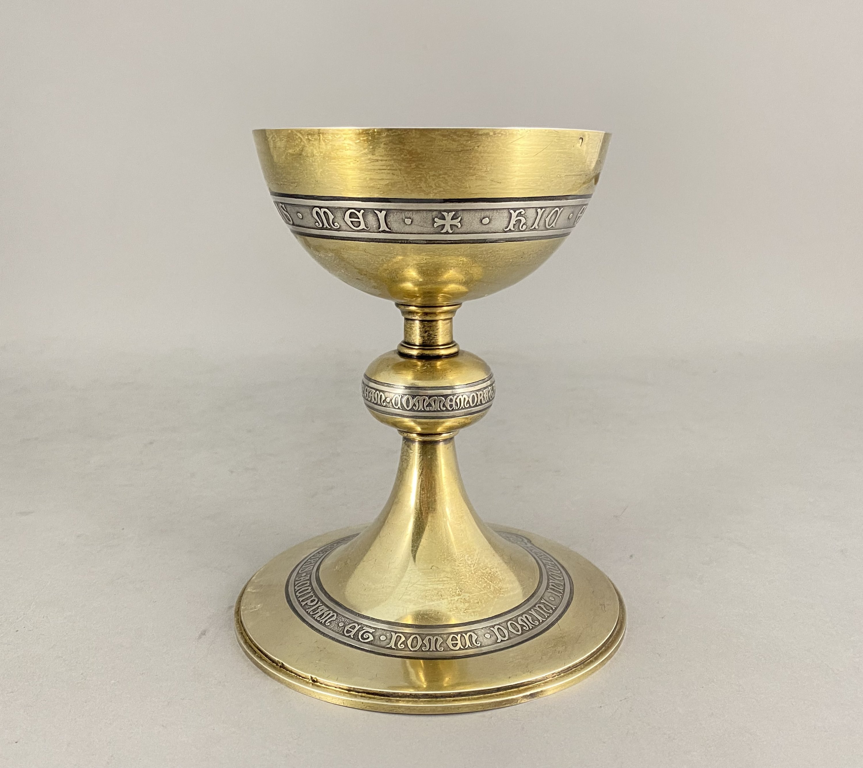 en bronze, argent et vermeil. La coupe présente l'inscription "hic.est.enim.calix.sanguinis.mei". Le pied est inscrit "hoc.facita.in.meam.comemorationem", la base circulaire avec la mention "calicem.salutaris.accipiam.et.nonem.domini.invocabo".