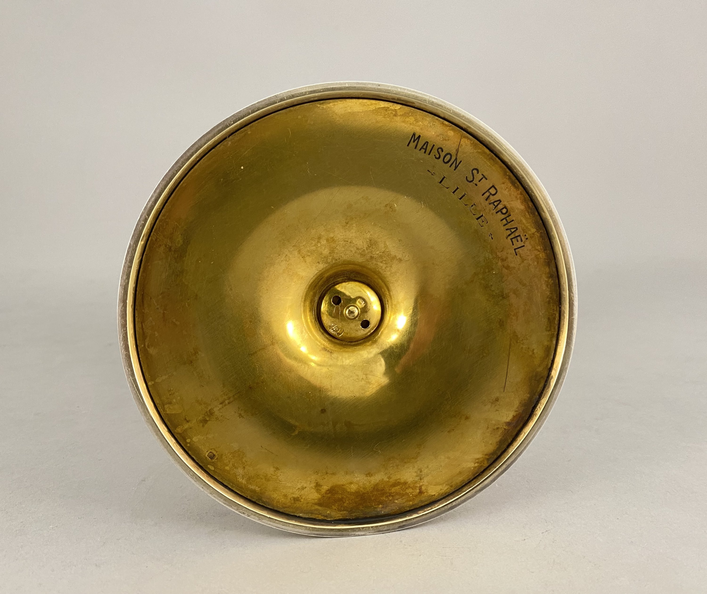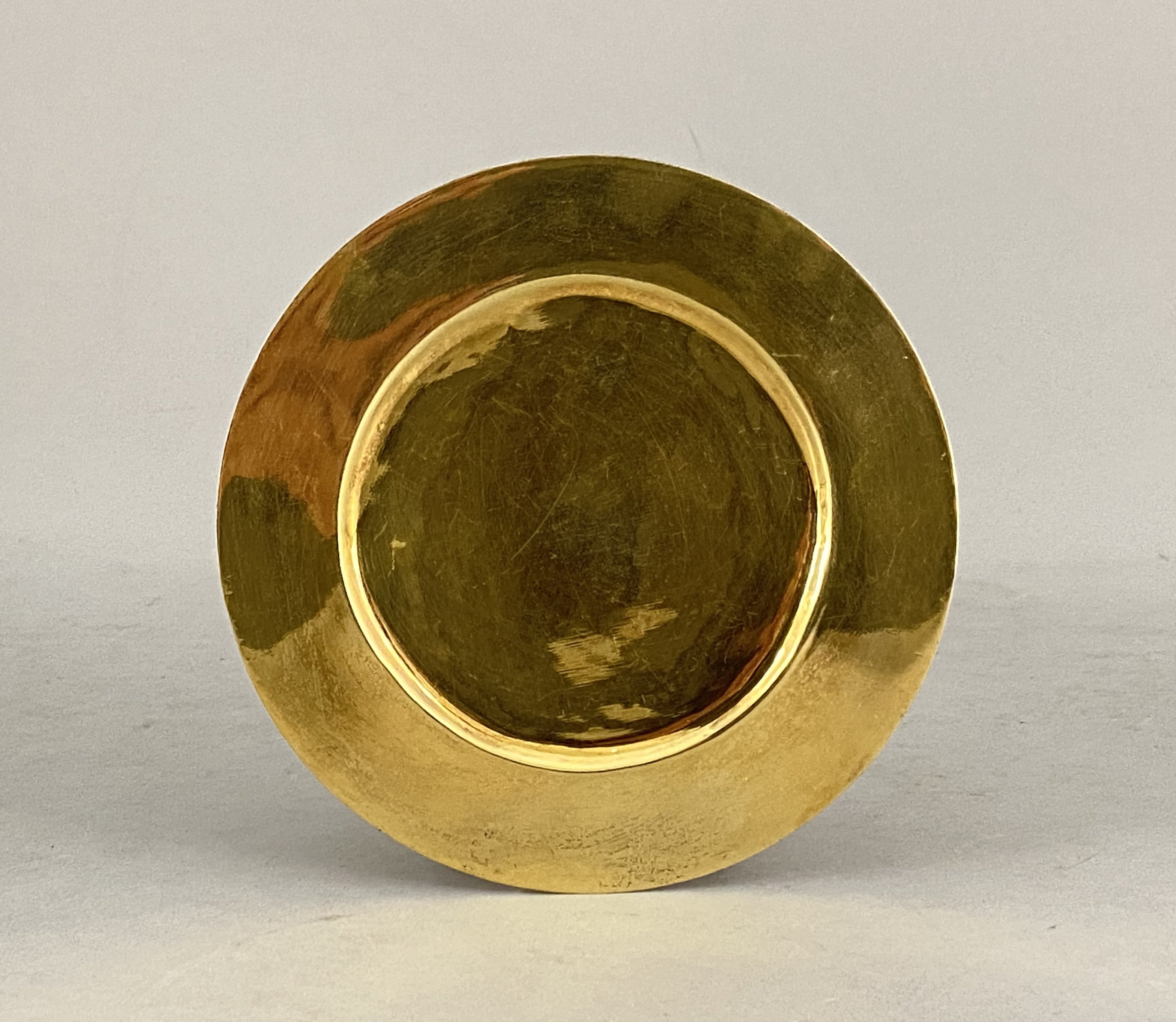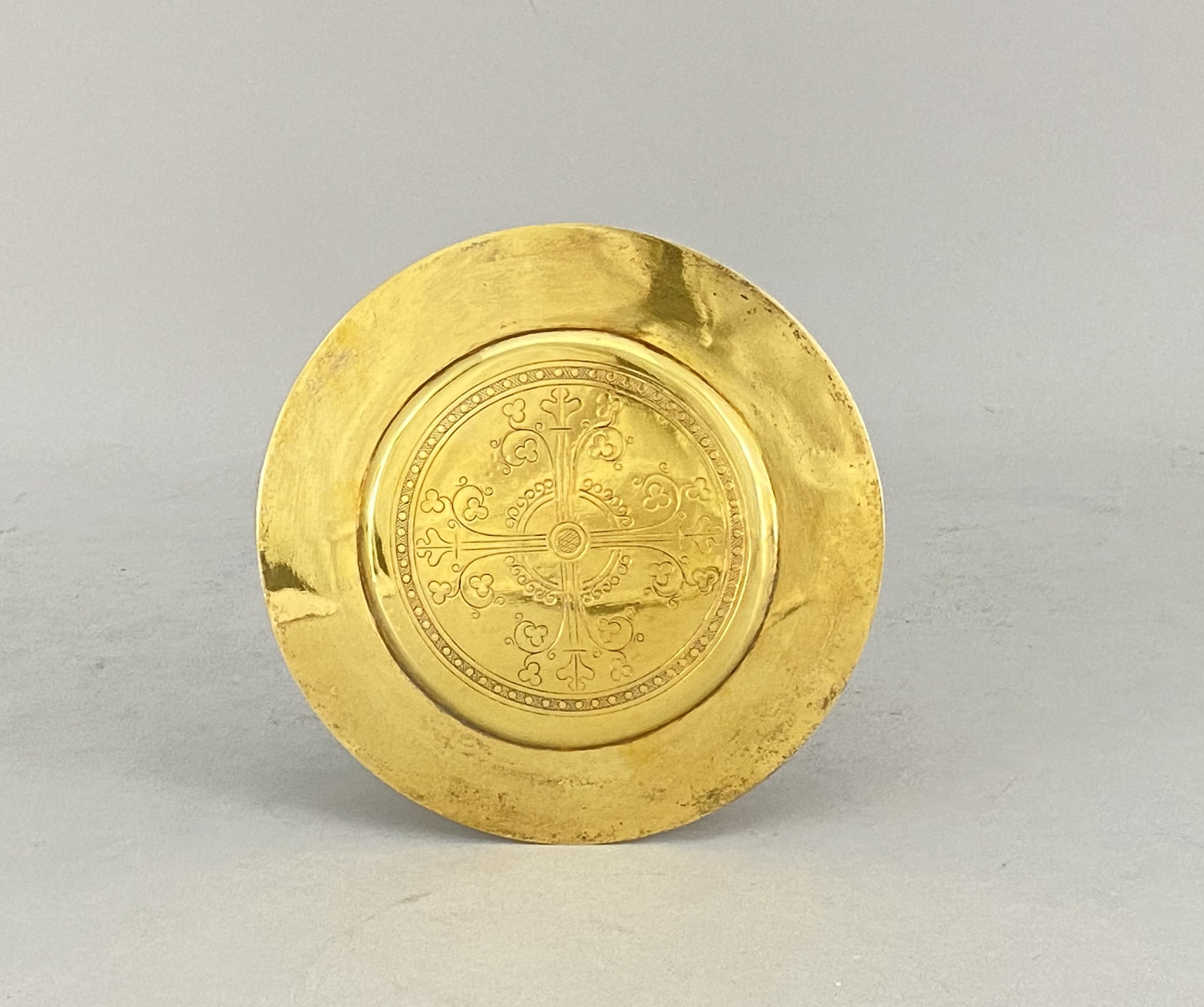 Joint: une patène en métal doré à décor gravé d'une croix entourée d'une frise de perles. Diam. 15,2 cm.