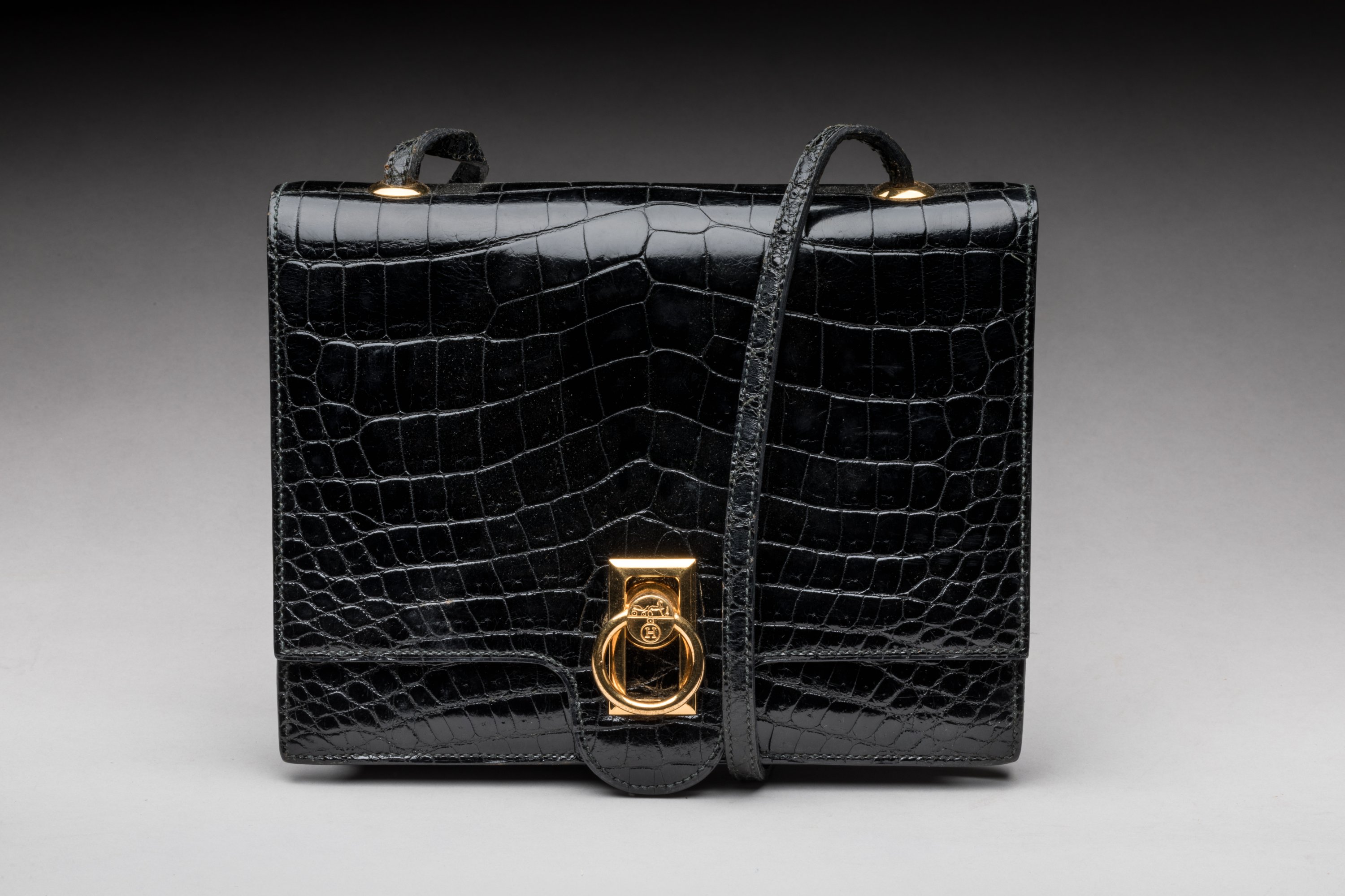 en crocodile noir, le fermoir en métal doré, siglé, orné d'un anneau.