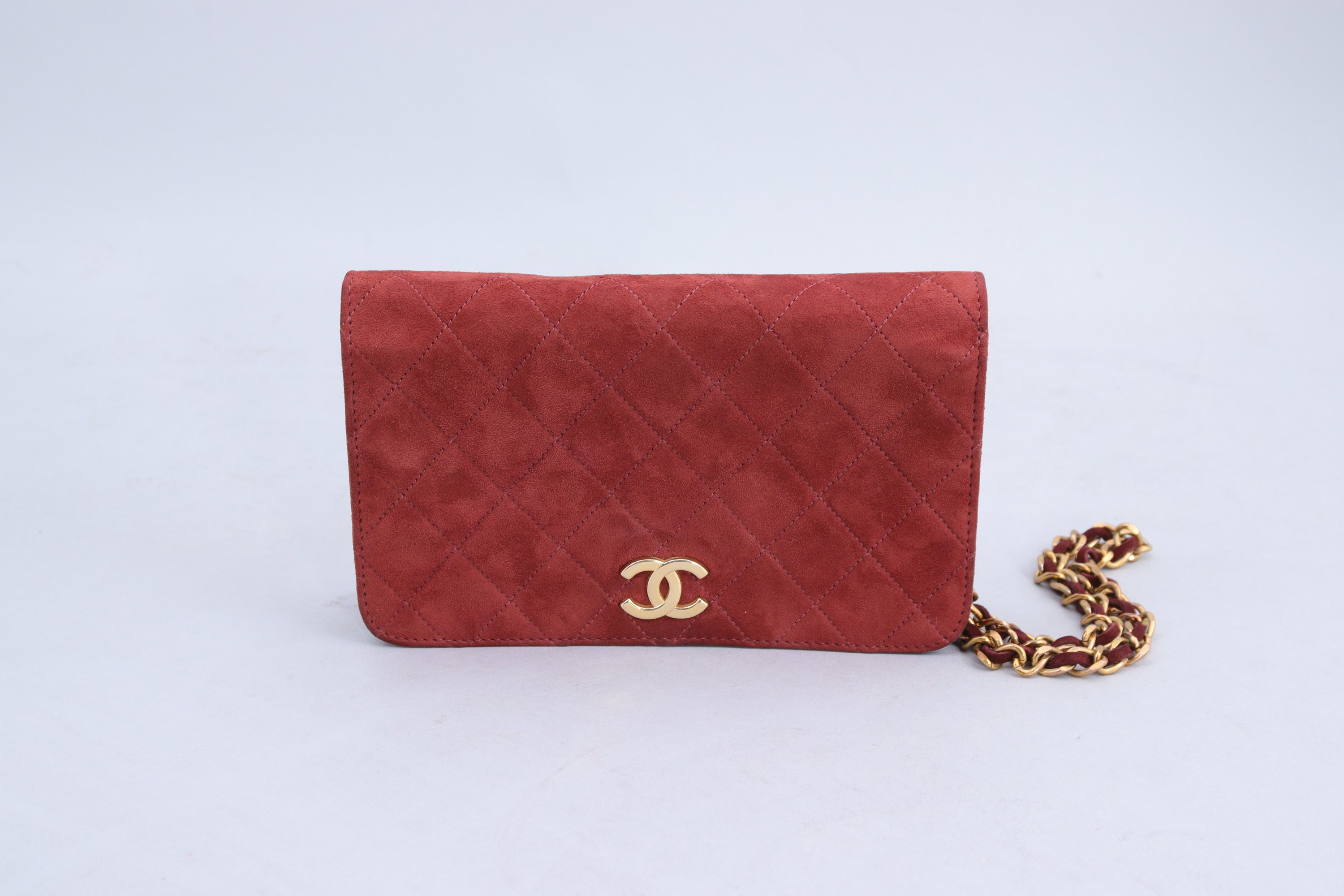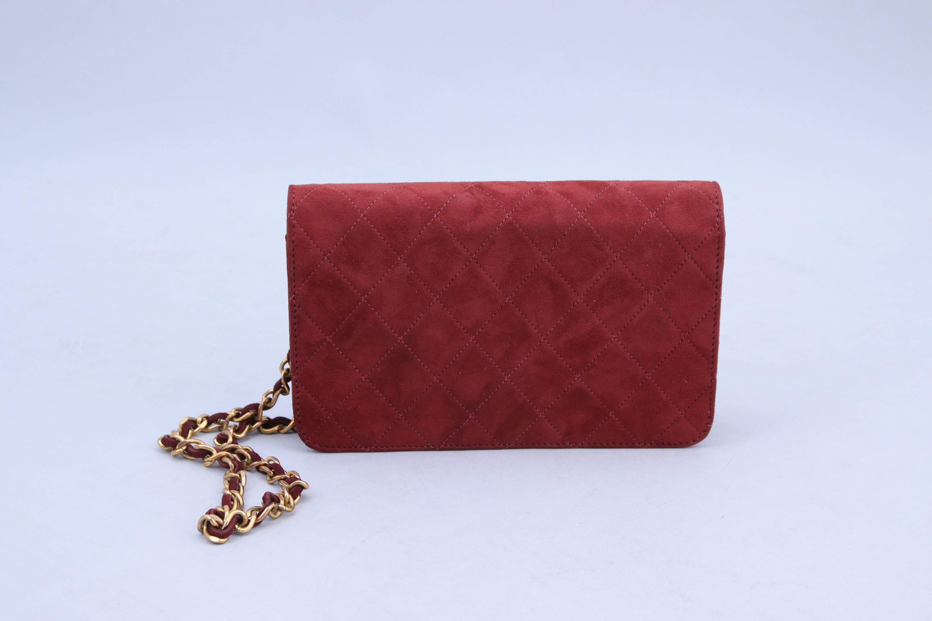 en daim teinté bordeaux, fermoir siglé aux C entrelacés. Bandoulière Wallet On Chain.