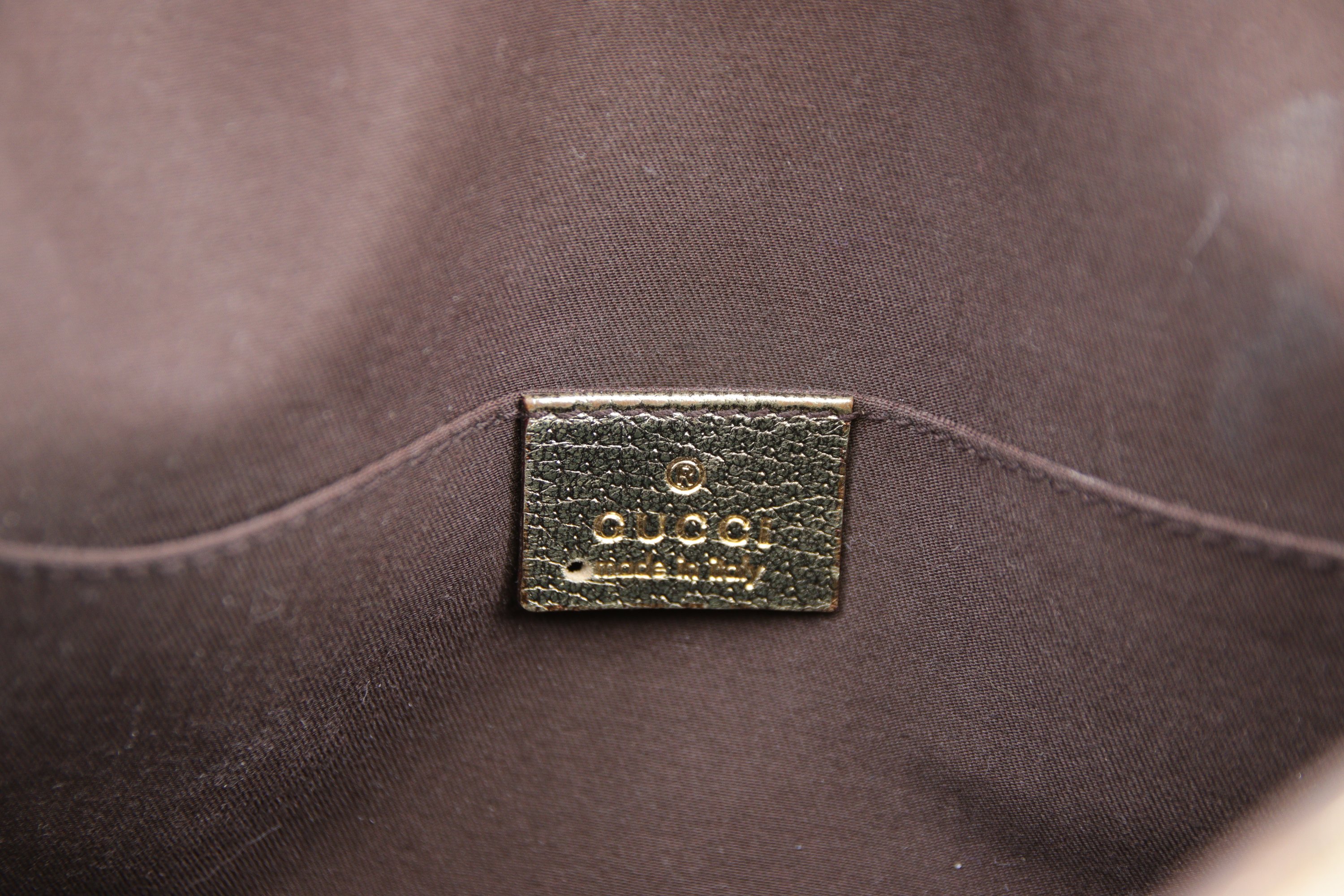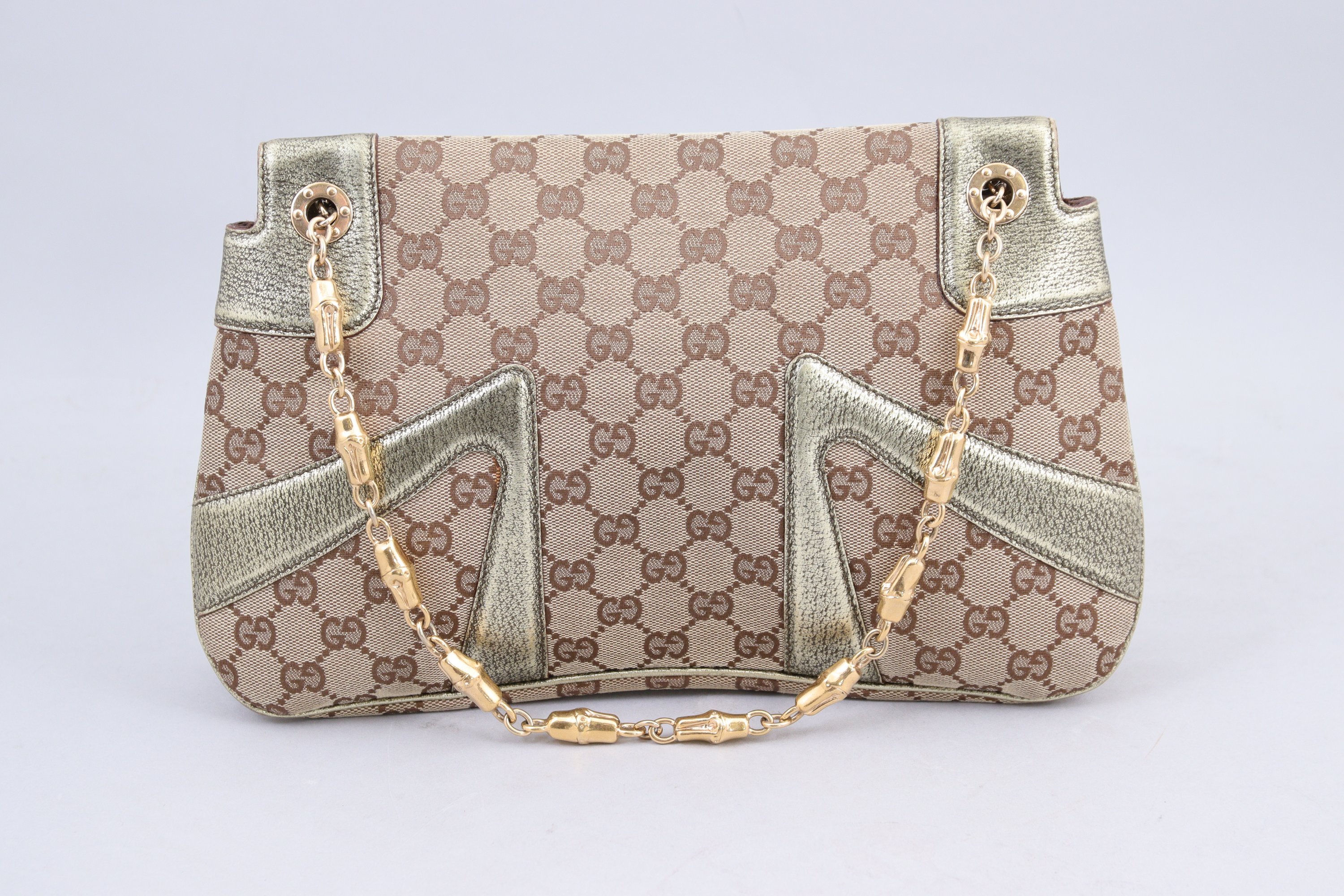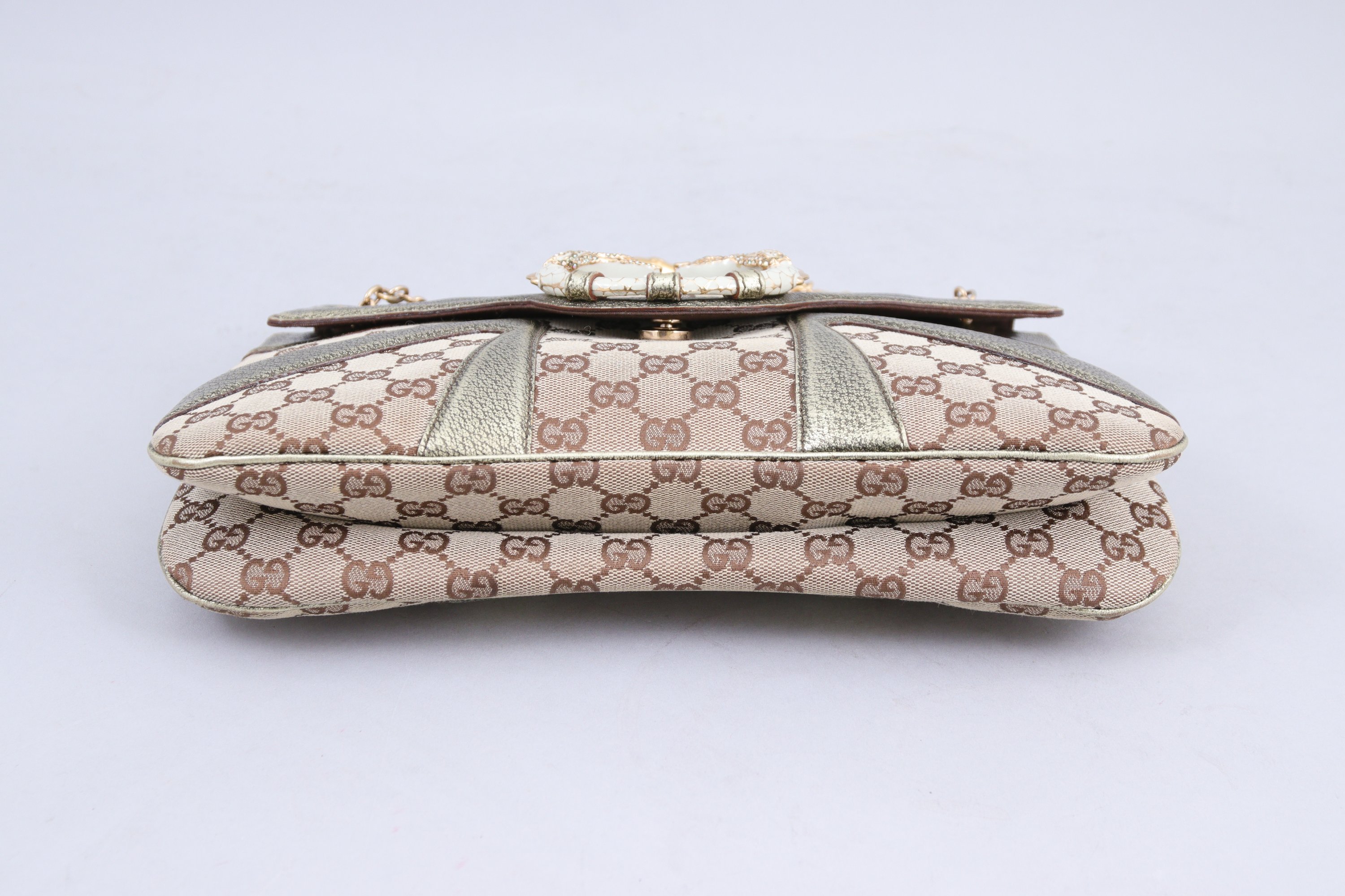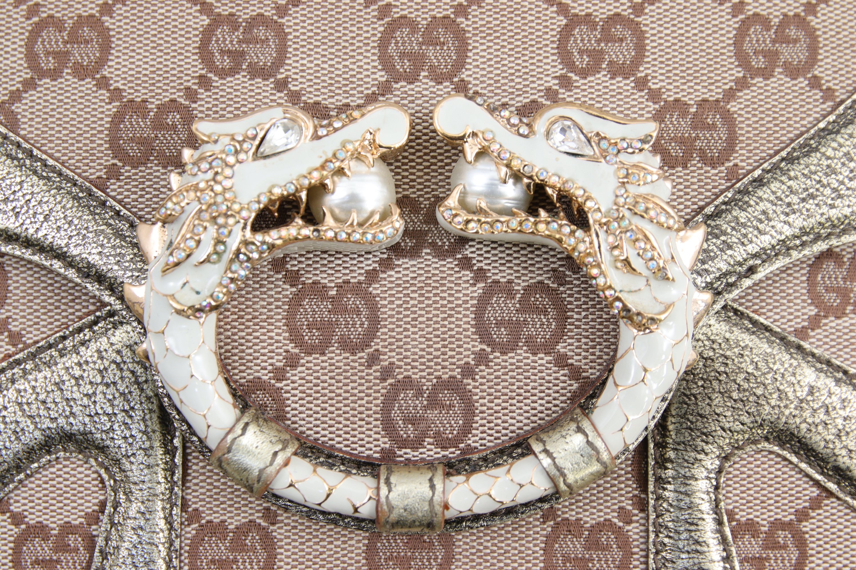 en toile monogrammée GG, la boucle présentant deux dragons affrontés tenant chacun la perle sacrée. Chaine en métal doré à l'imitation du bambou.