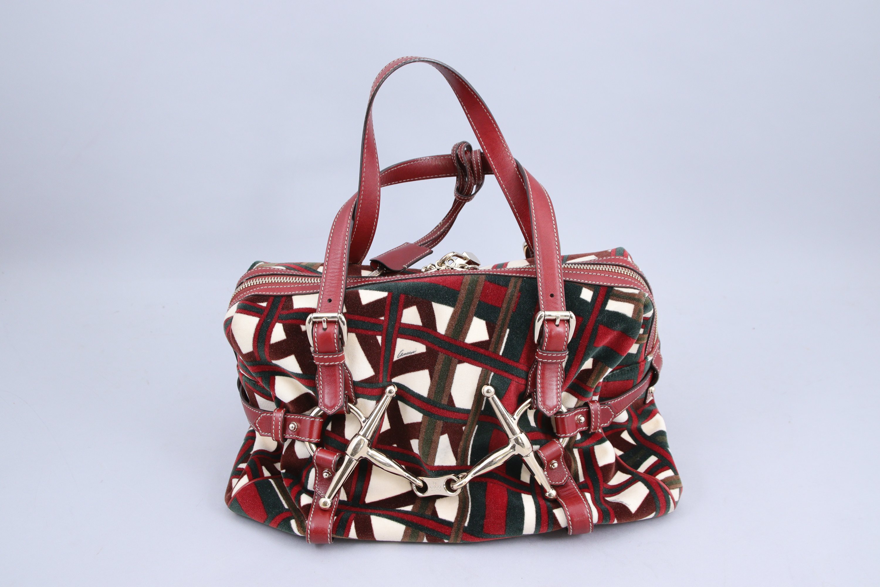 Sac à main modèle "Boston Bridal Bit 85th" en cuir rouge et velours. Plaque au centre rappelant le 85e anniversaire de la marque. Cadenas, clochette et clé. Deux anses.