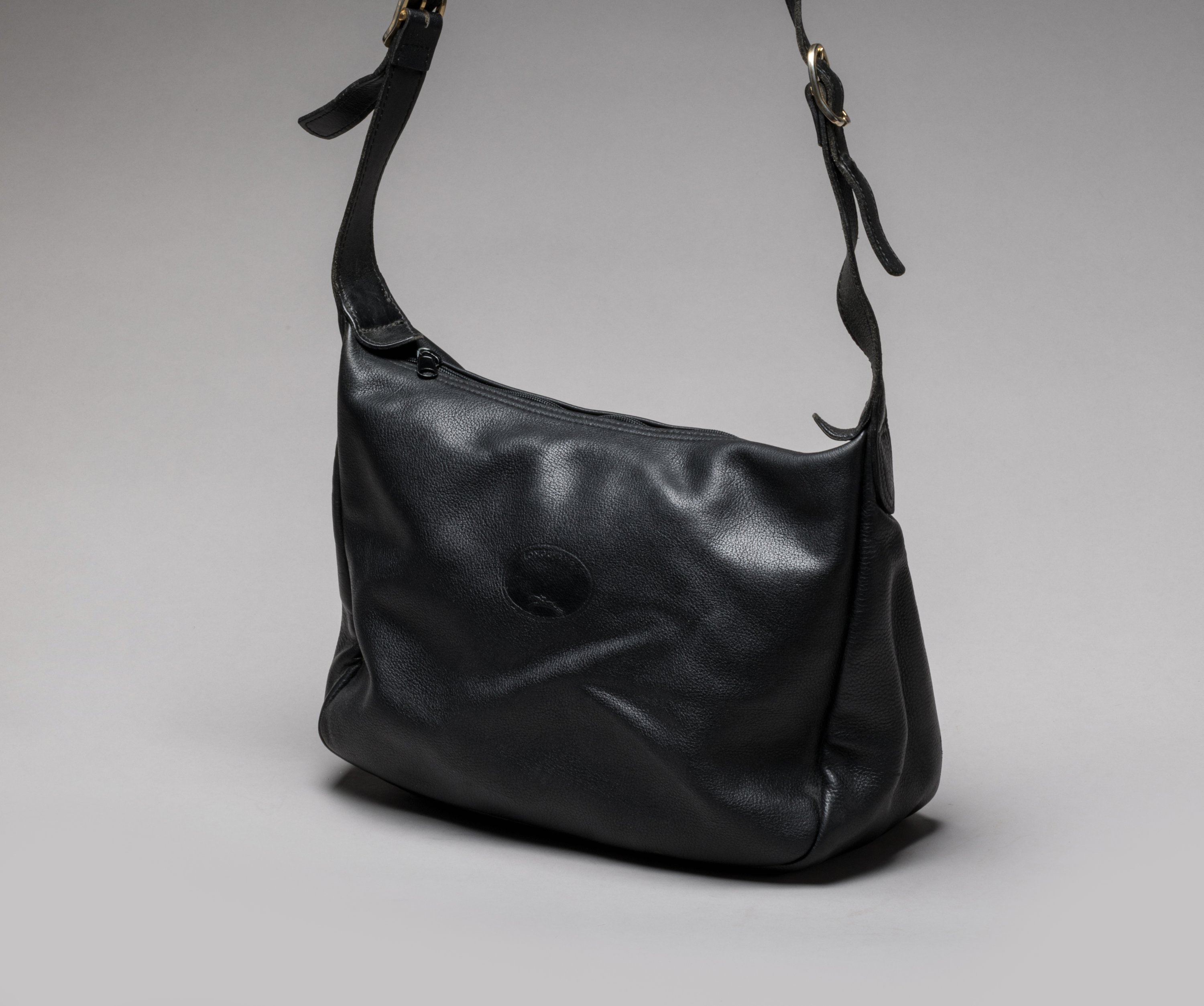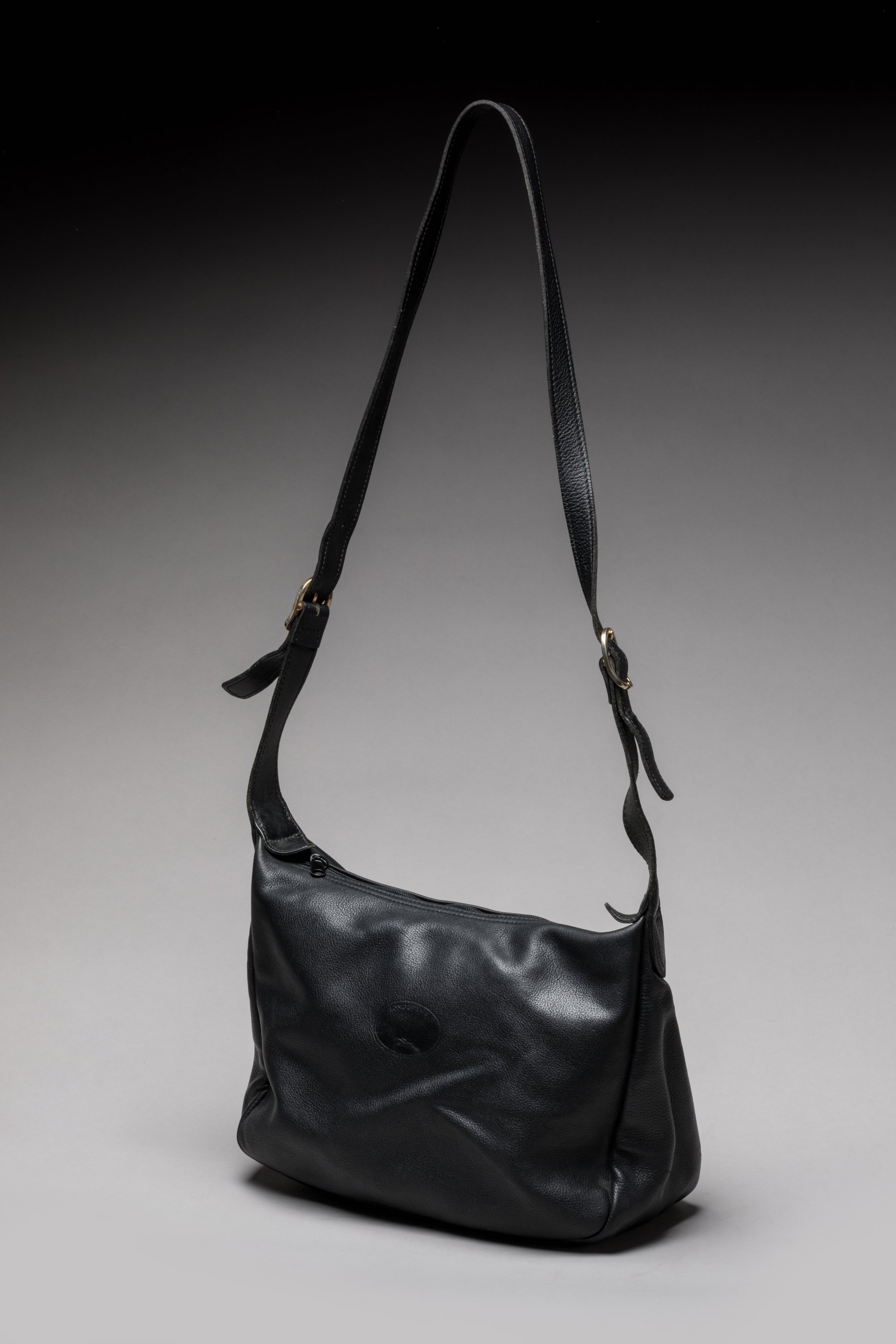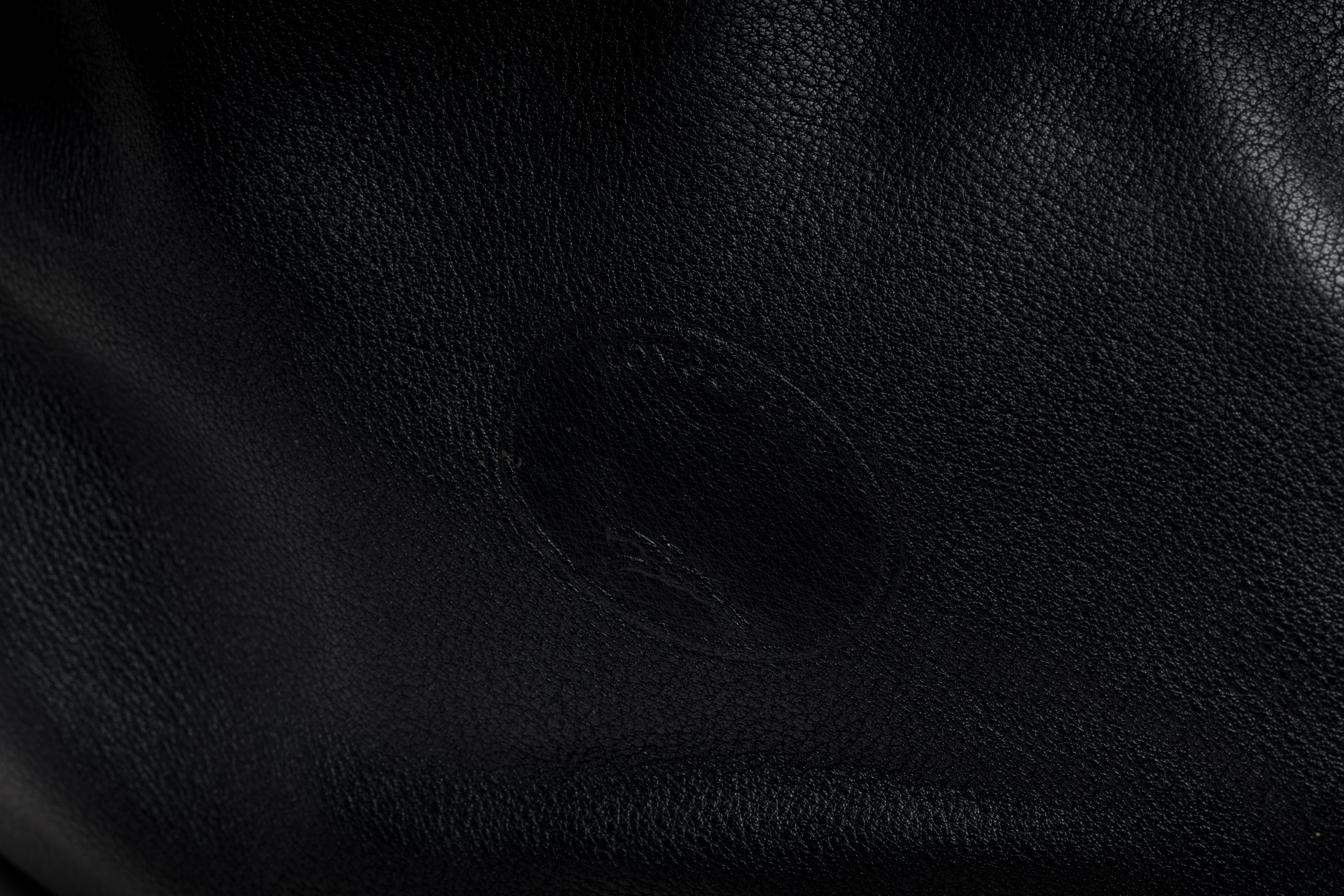 Longchamp Sac à main en cuir noir, estampillé au centre....