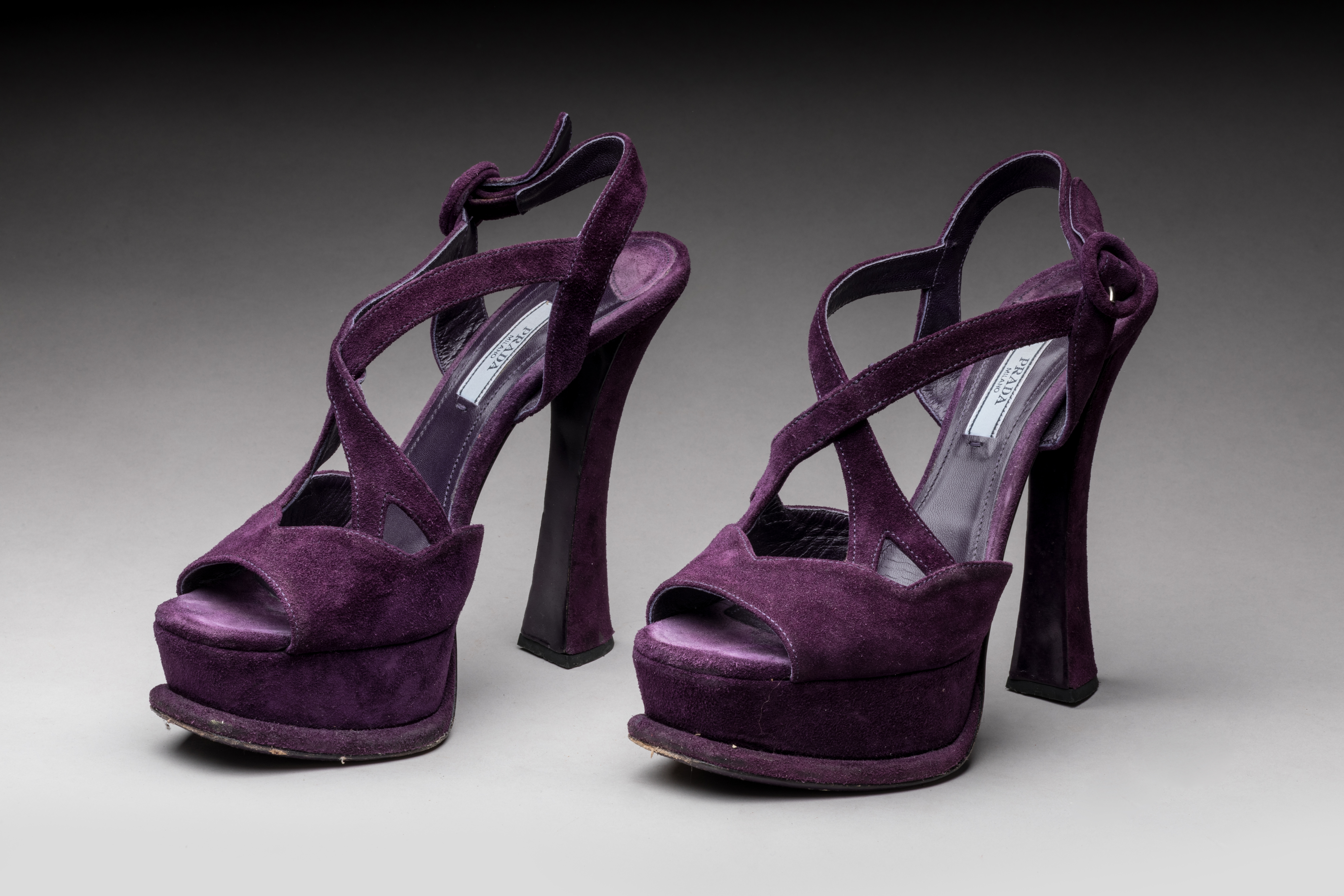 en cuir suédé violet, à brides croisées.