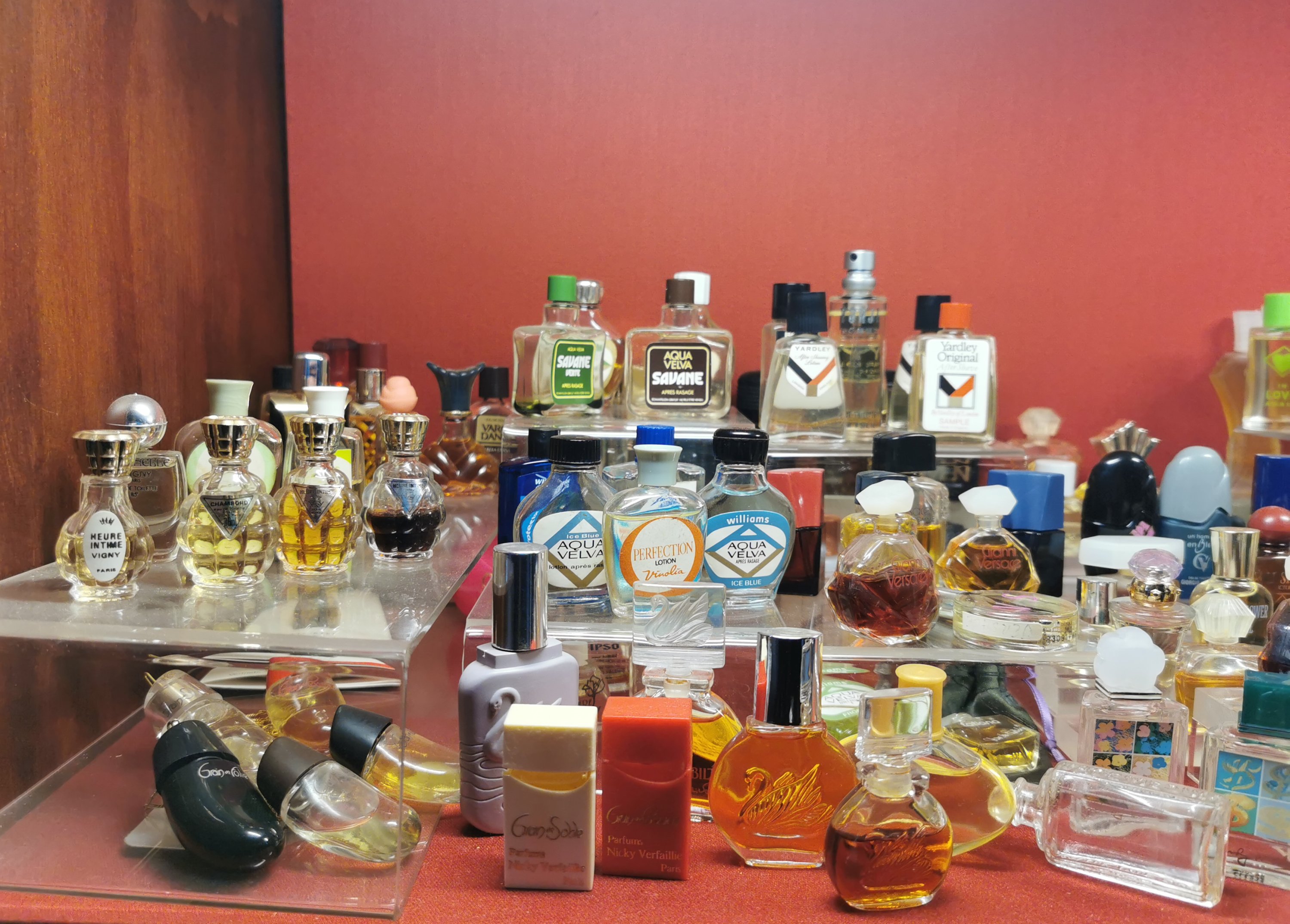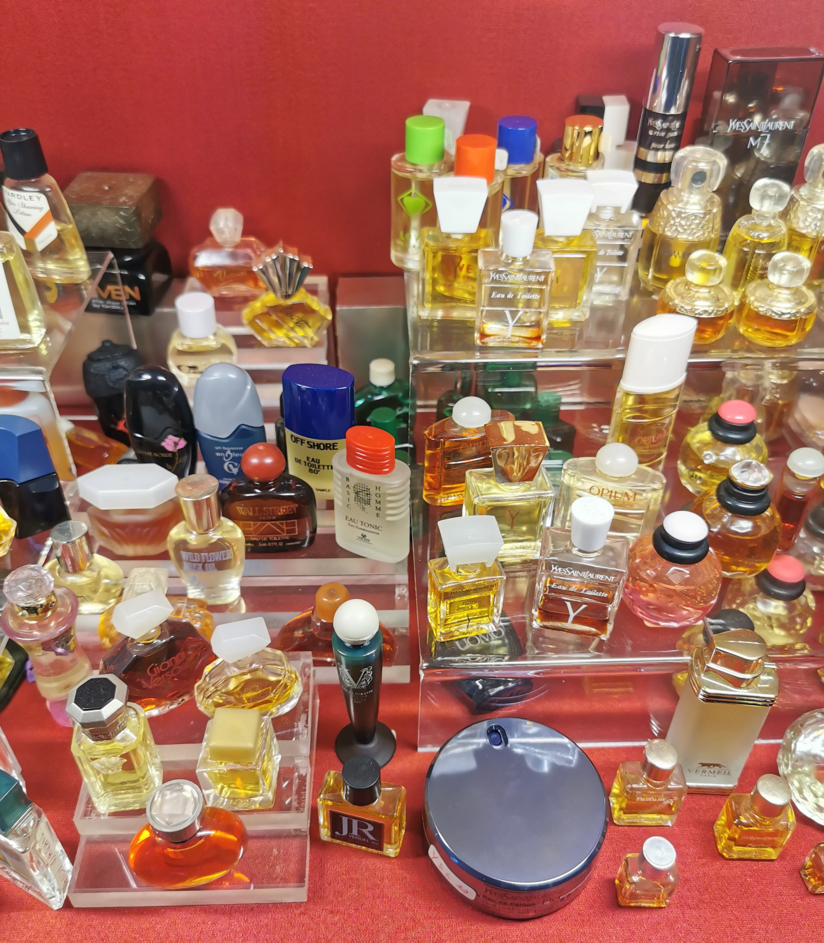 Assortiment d’environ 120 diminutifs parfums ou échantillons de parfums, la plupart avec leur étui carton titré.