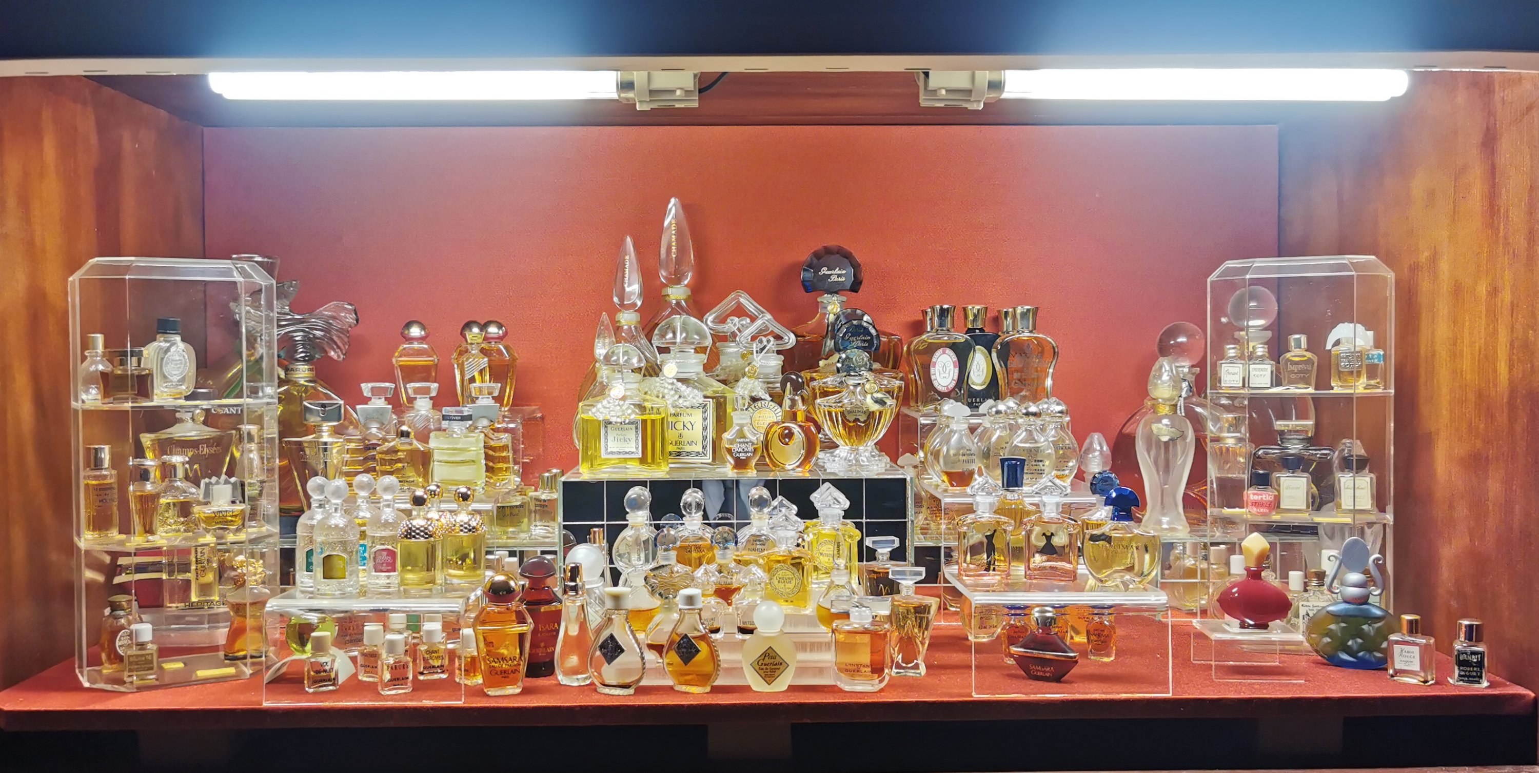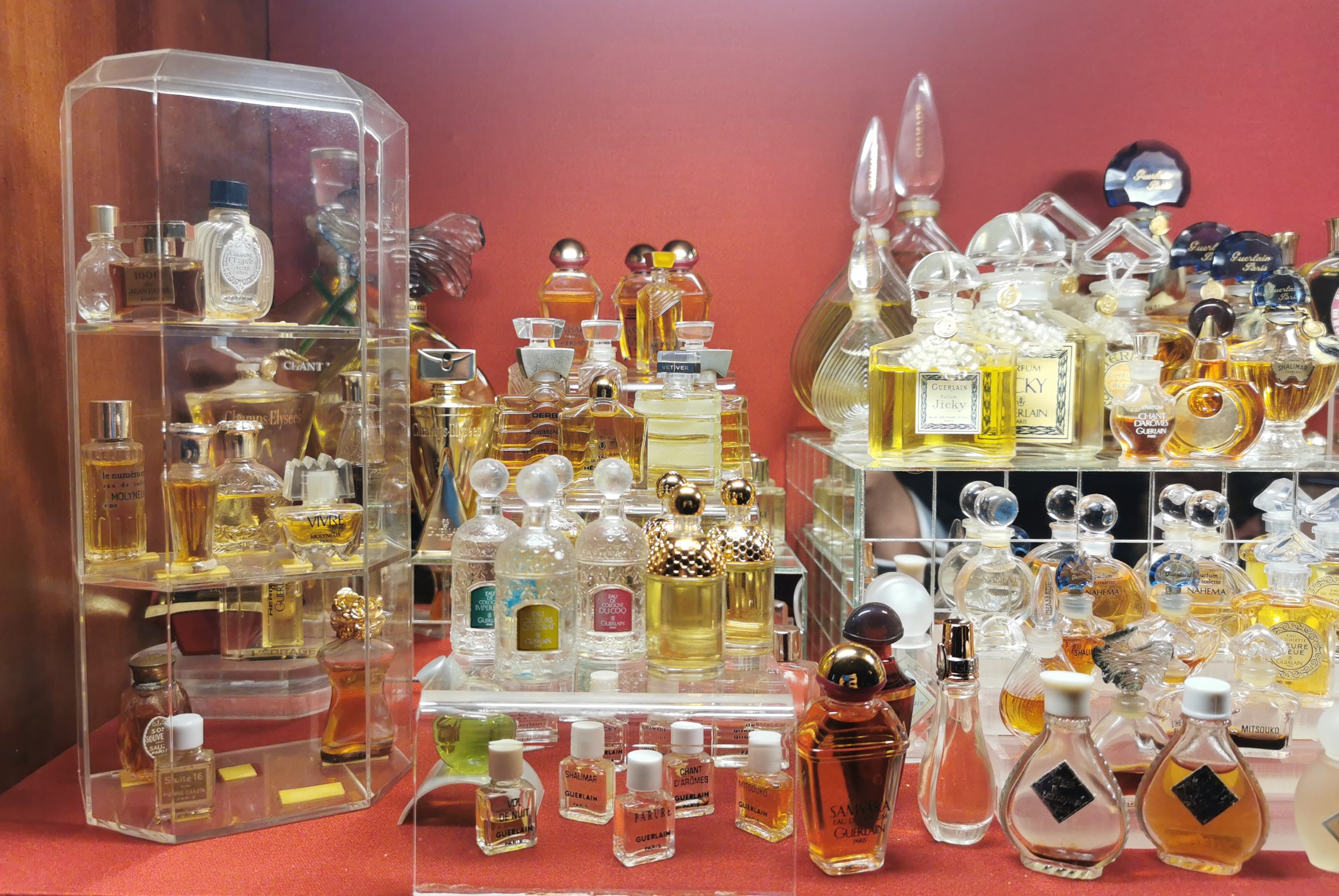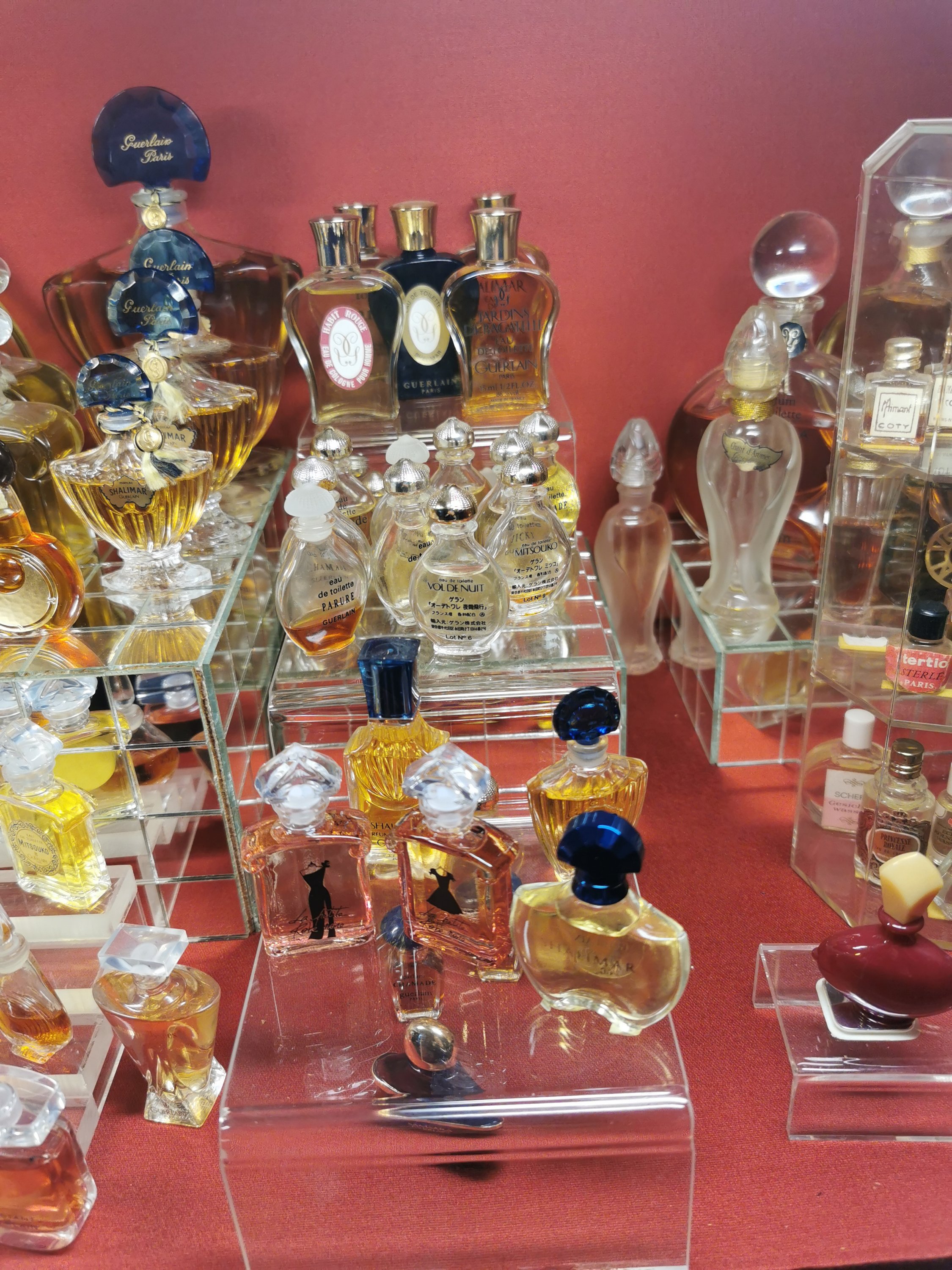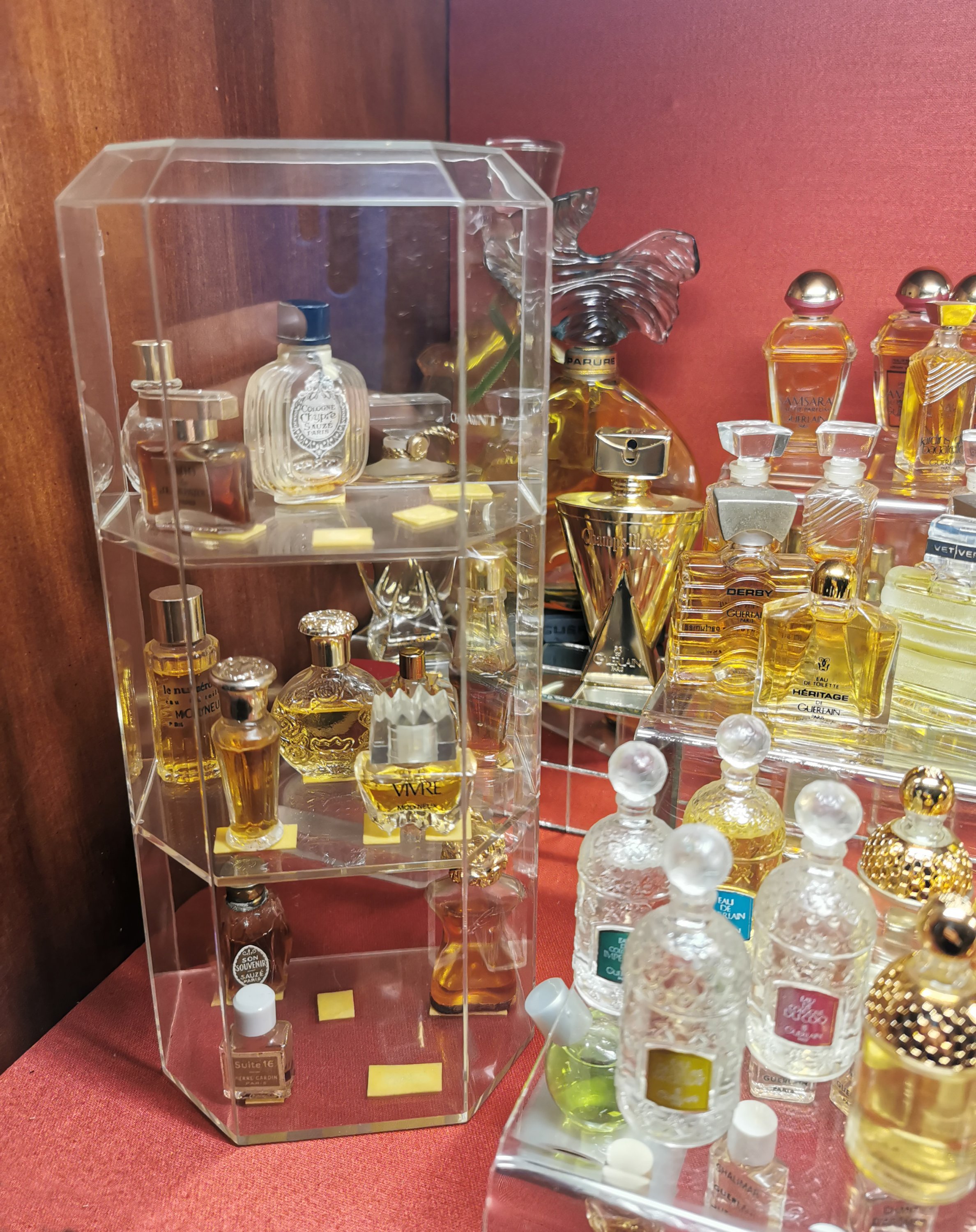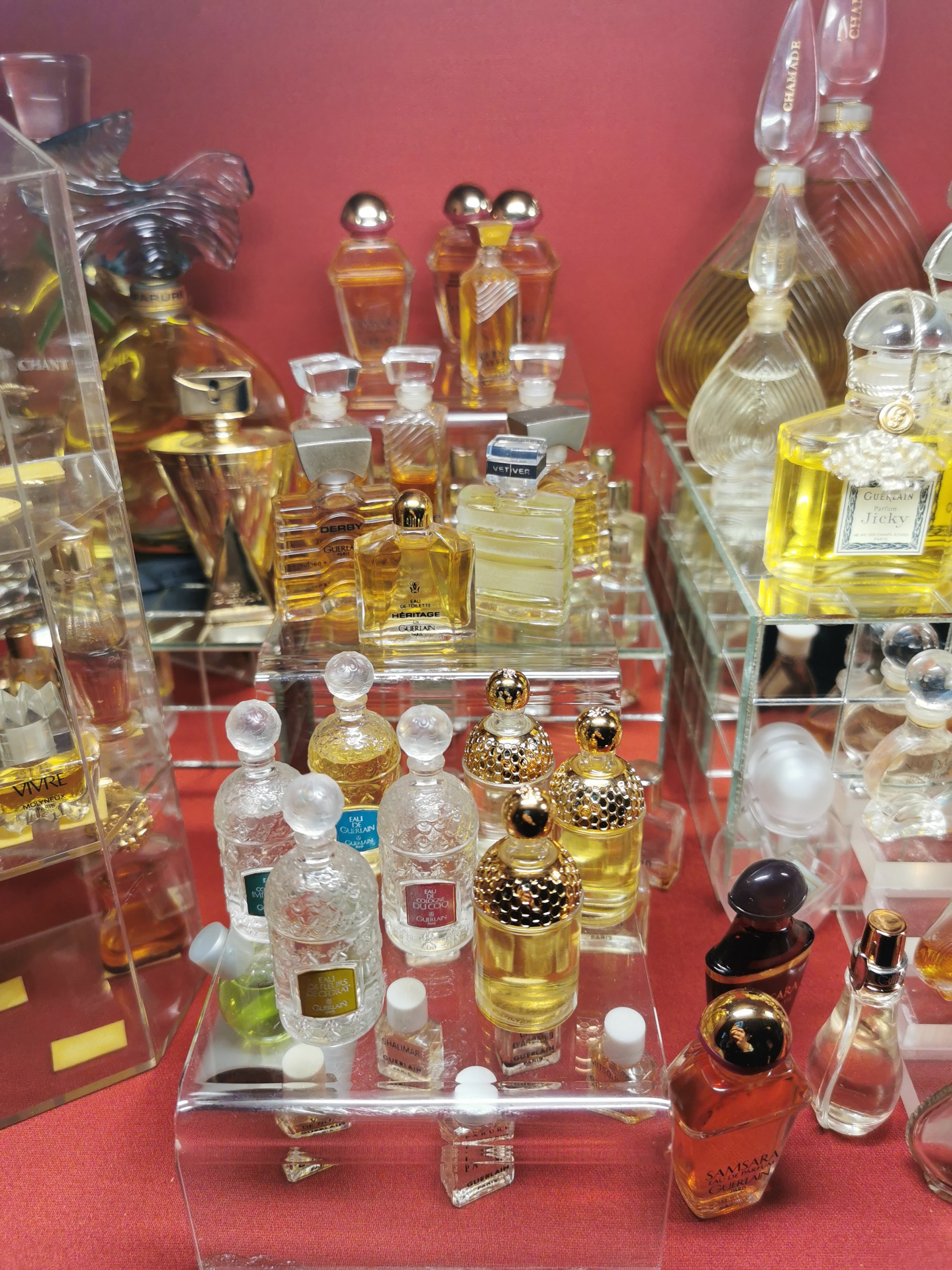 On y joint 14 flacons dextrait: 1 flacon dextrait Parure, 1 flacon dextrait Shandarum, 3 flacons dextrait Chamade, 4 flacons dextrait Shalimar, 2 flacons dextrait Jicky, 2 flacons dextrait Lheure Bleue, 1 flacon dextrait Vol de Nuit.