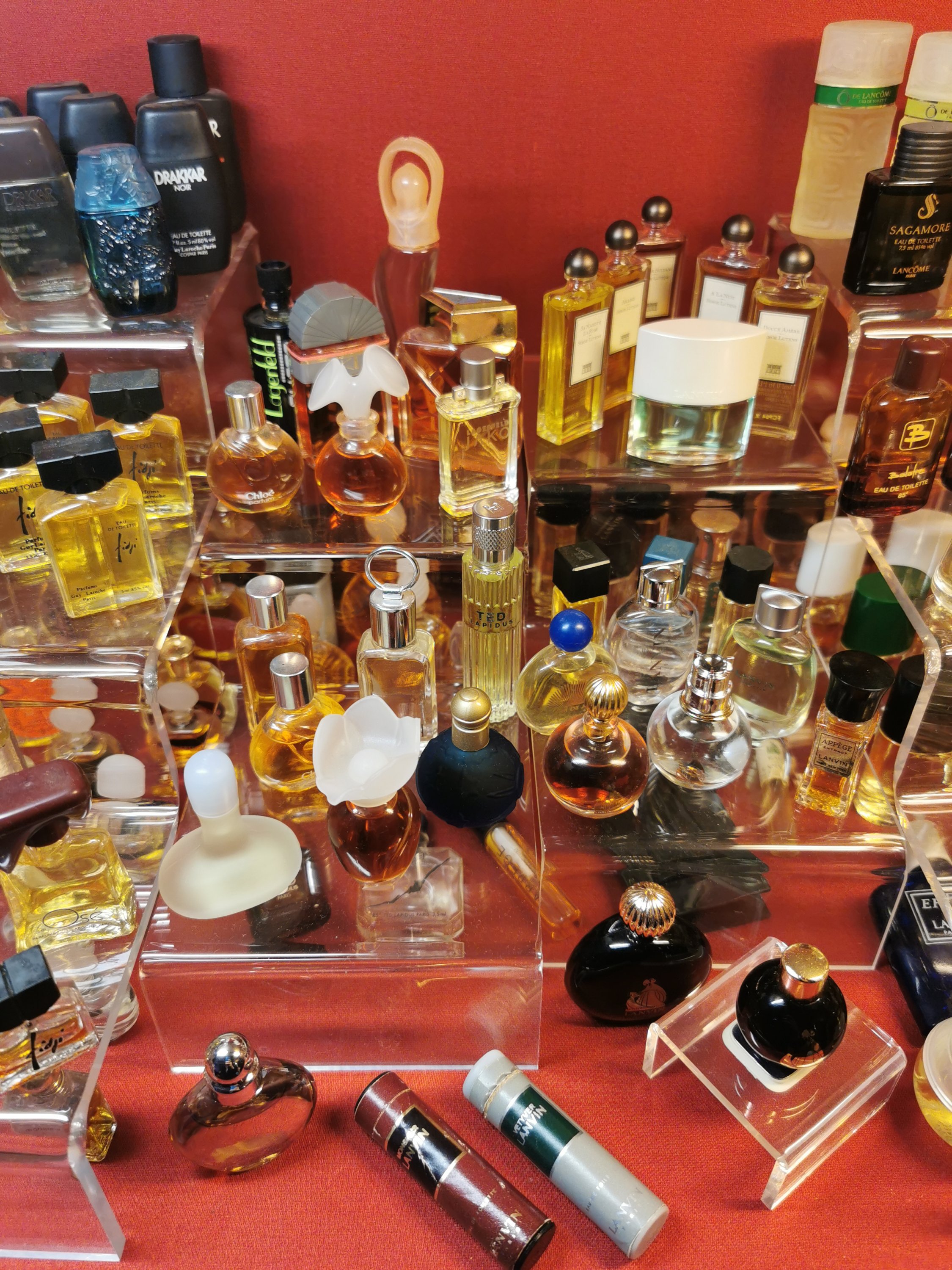 Assortiment d’environ 150 diminutifs parfums ou échantillons de parfums, la plupart avec leur étui carton titré.