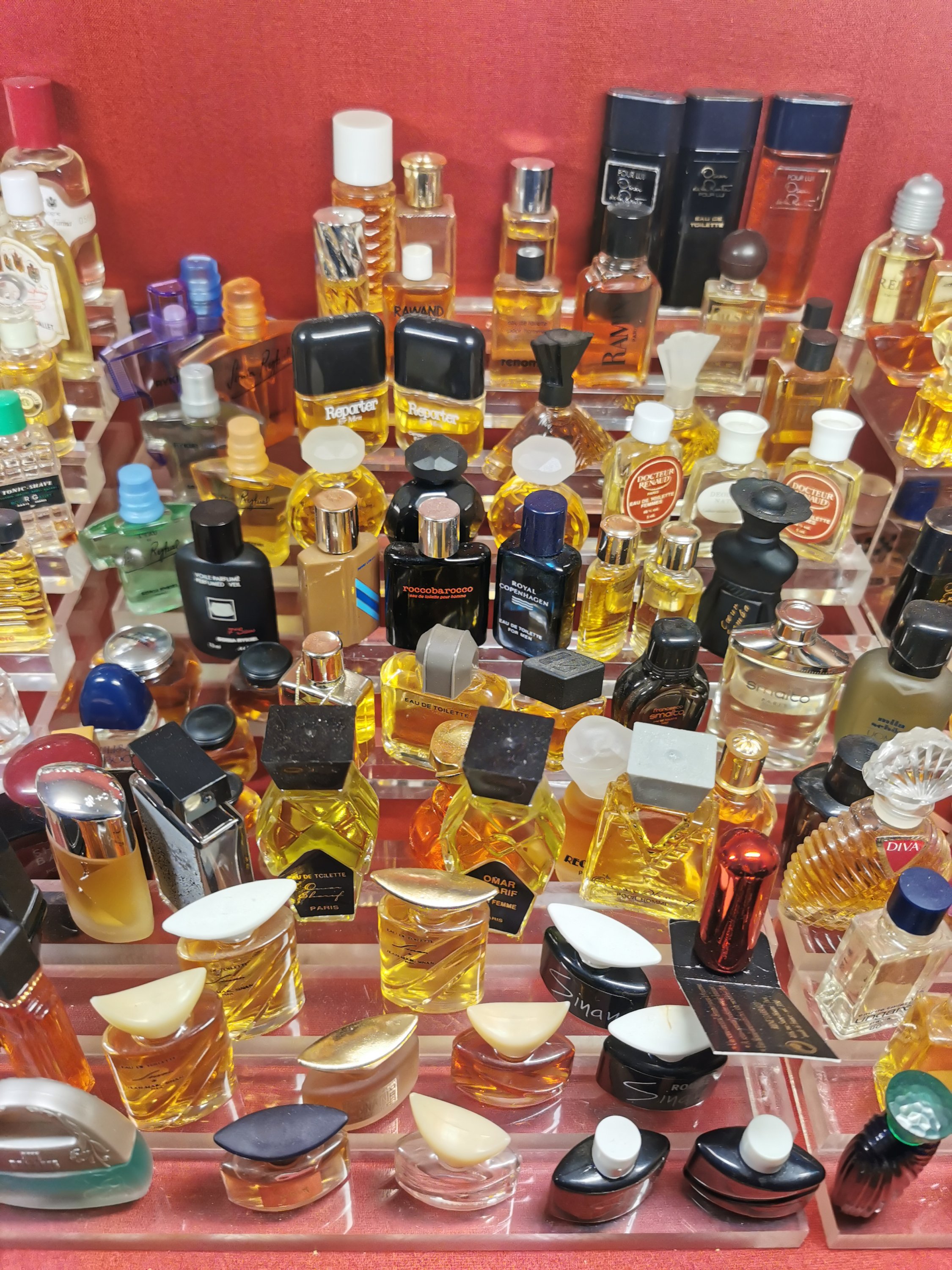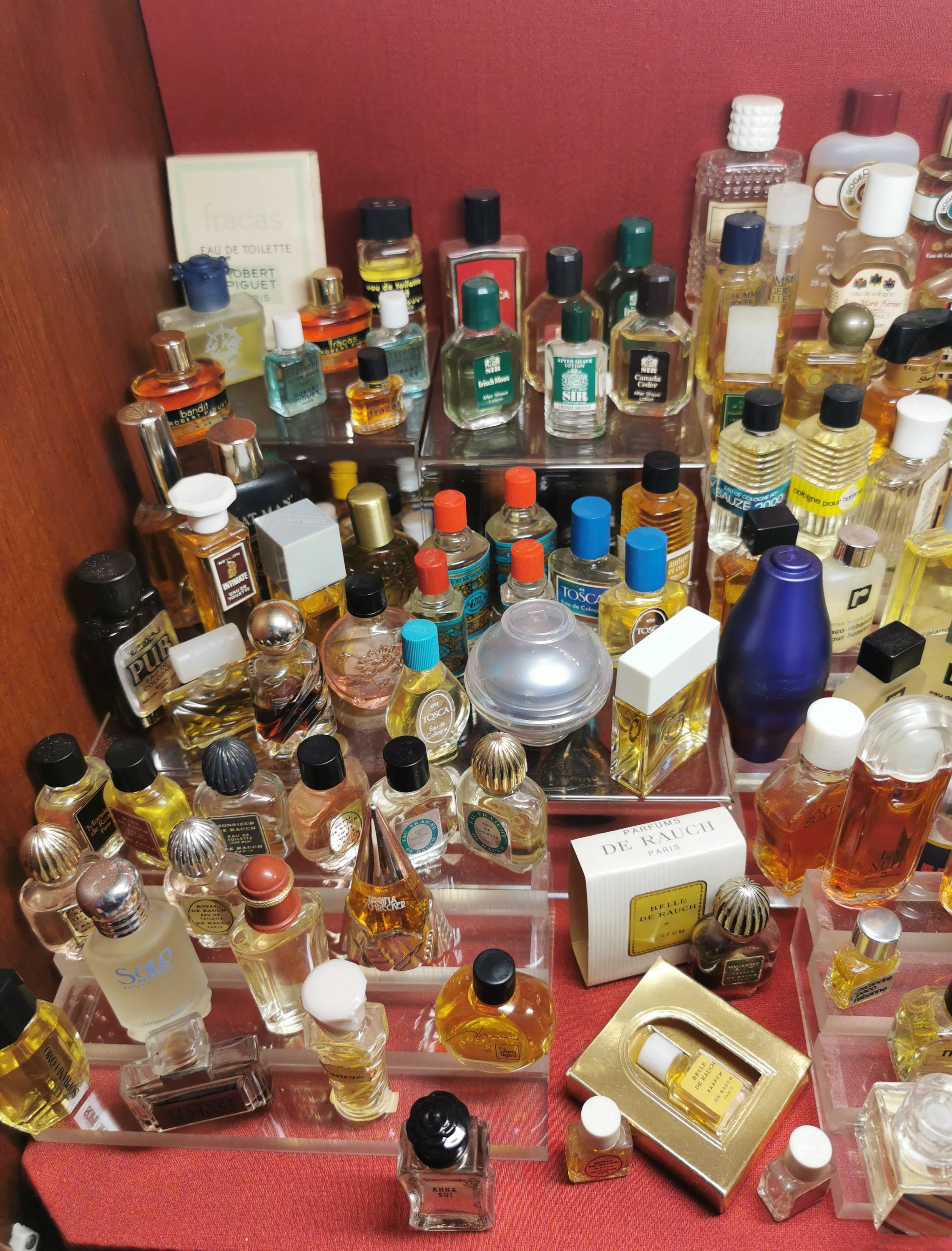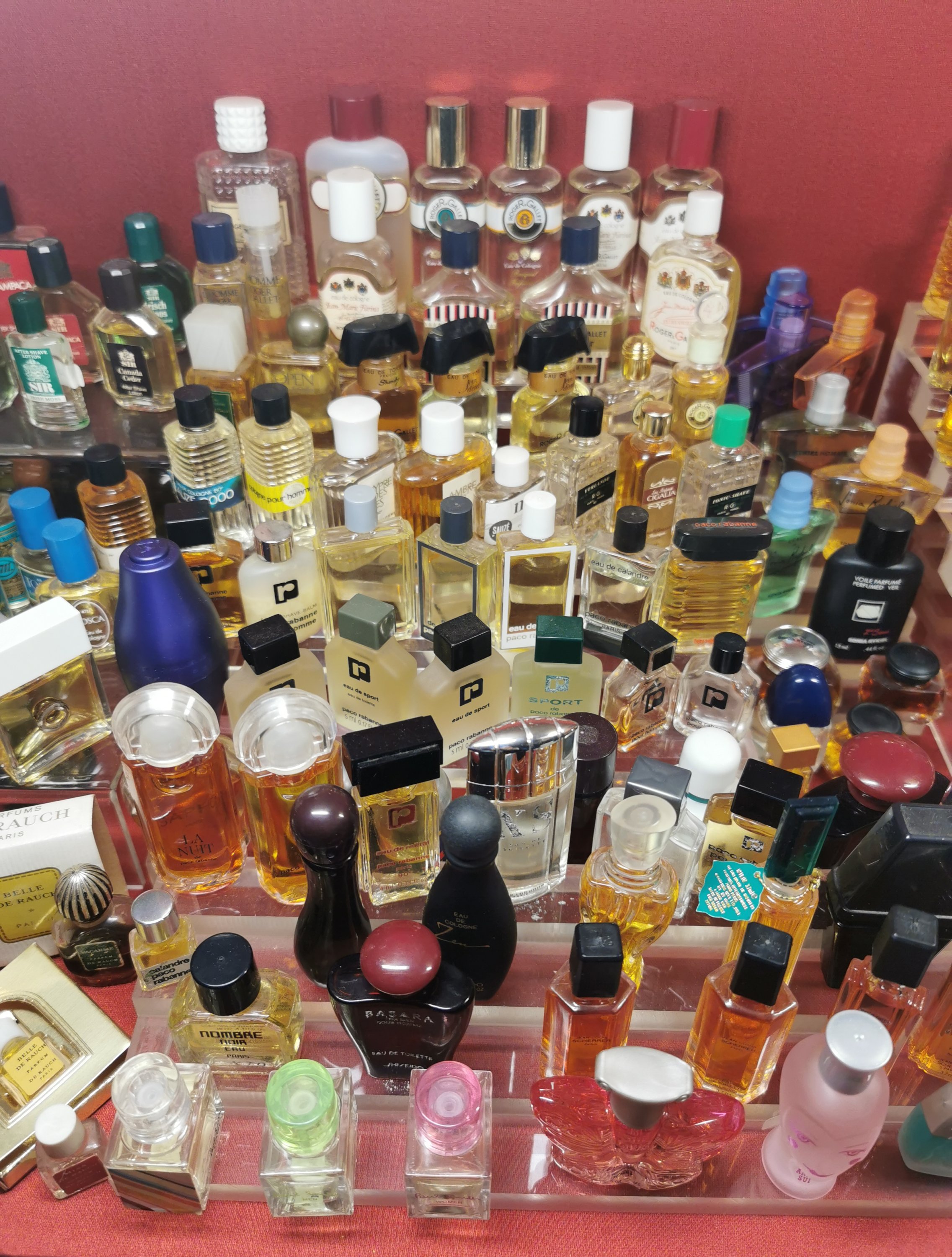 Assortiment d’environ 180 diminutifs parfums ou échantillons de parfums, la plupart avec leur étui carton titré.