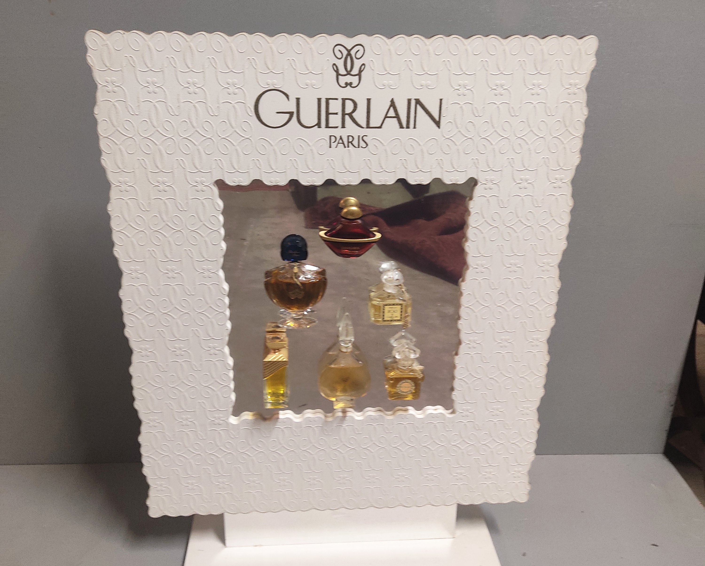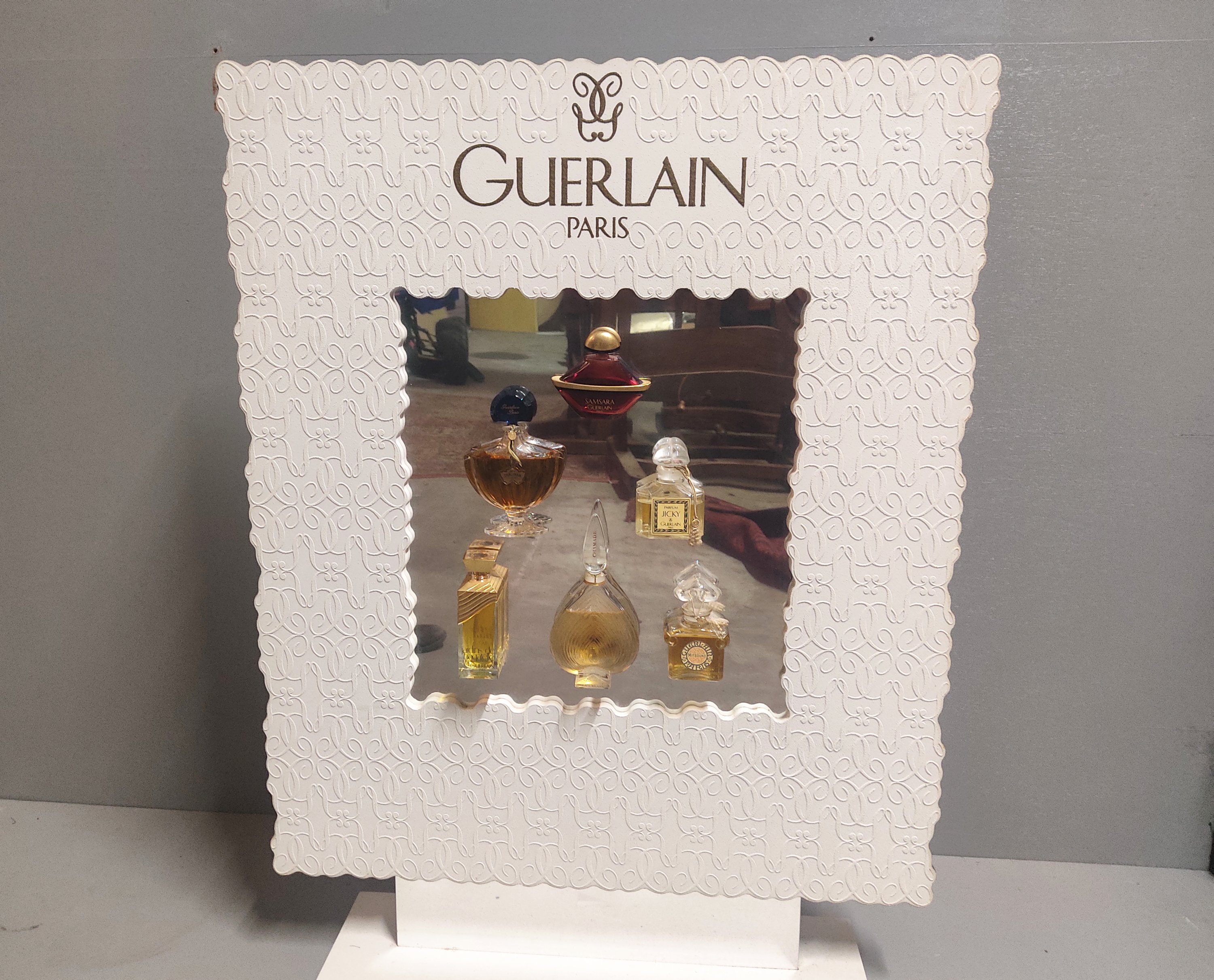 Elégant panneau publicitaire décoratif en bois gainé de plâtre, orné de six flacons emblématiques de la maison.