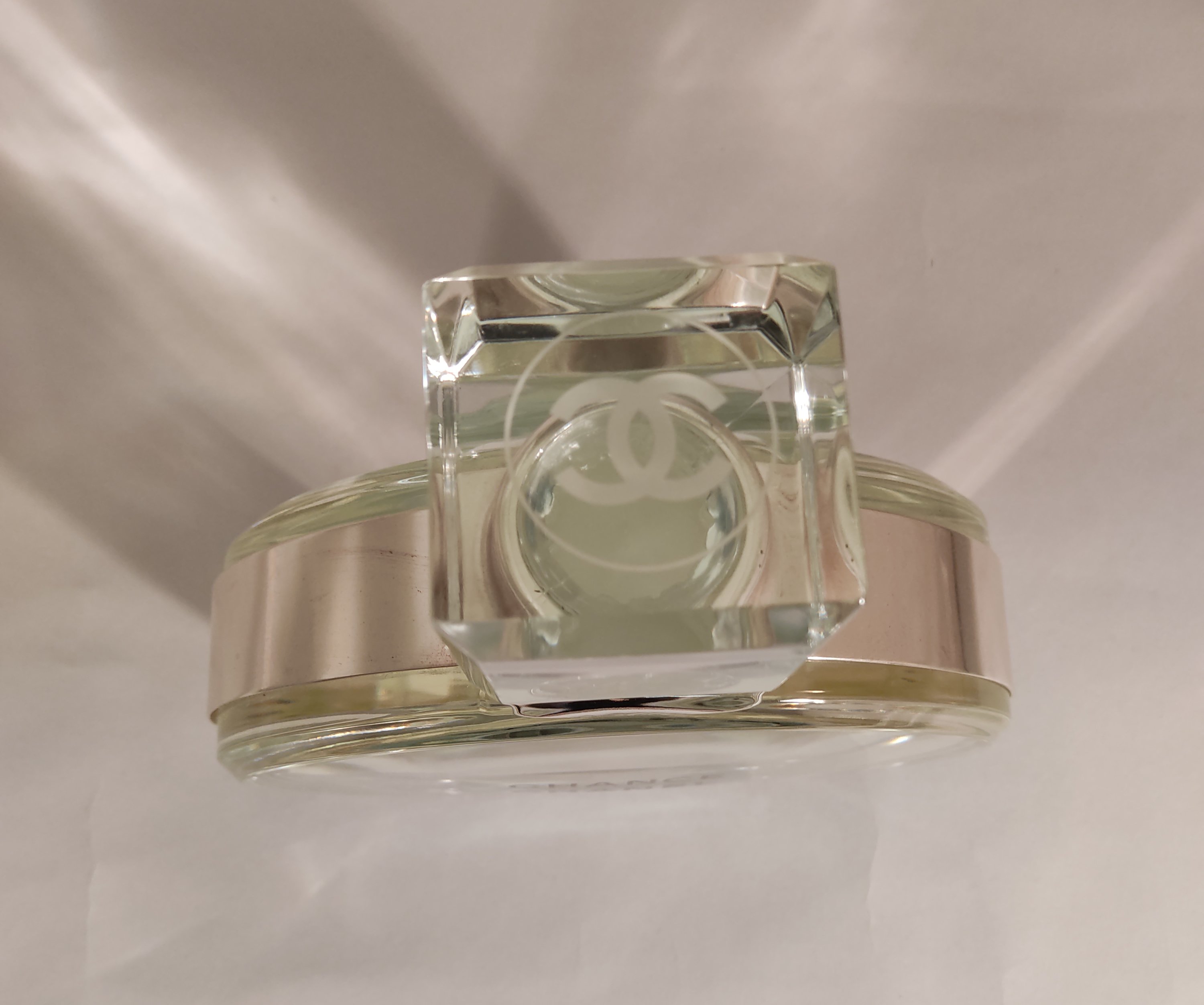 Flacon publicitaire décoratif en verre incolore pressé moulé.