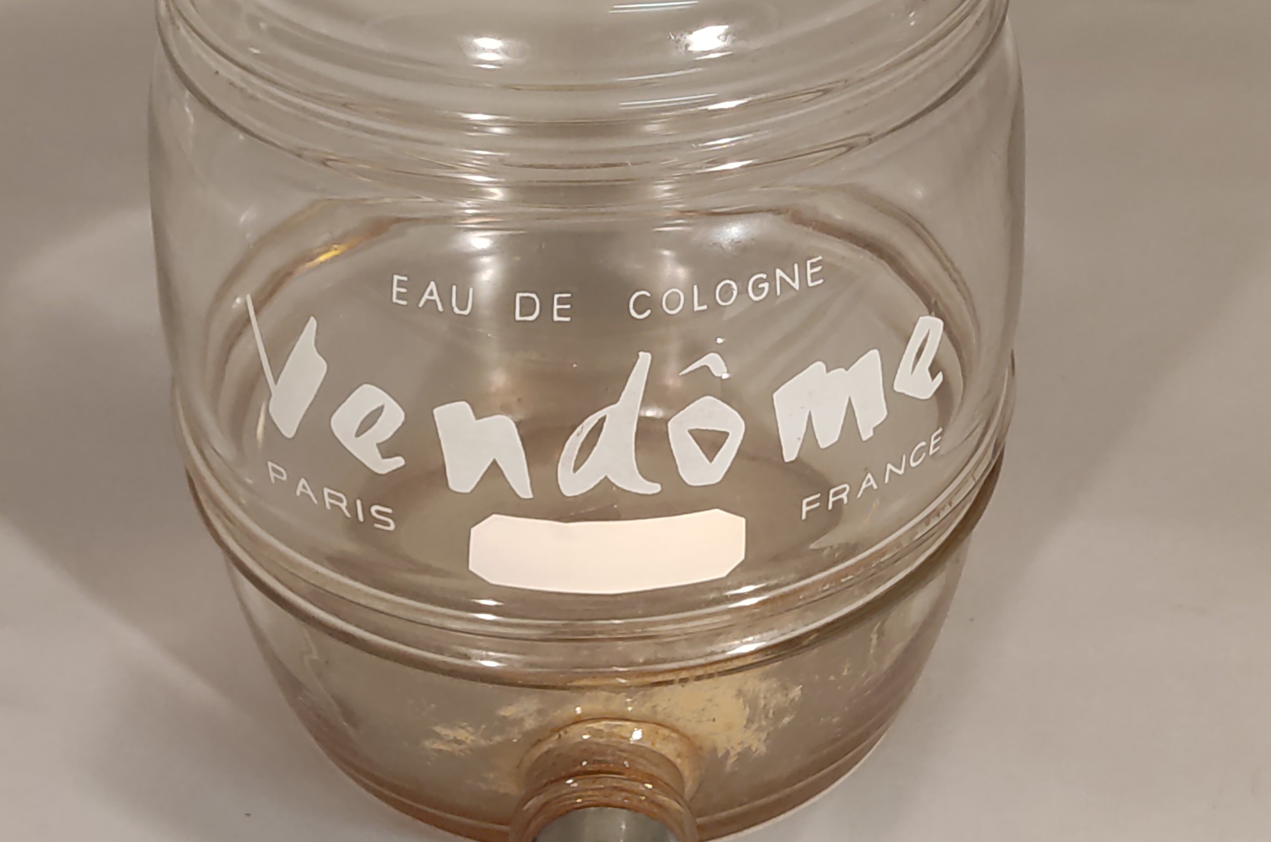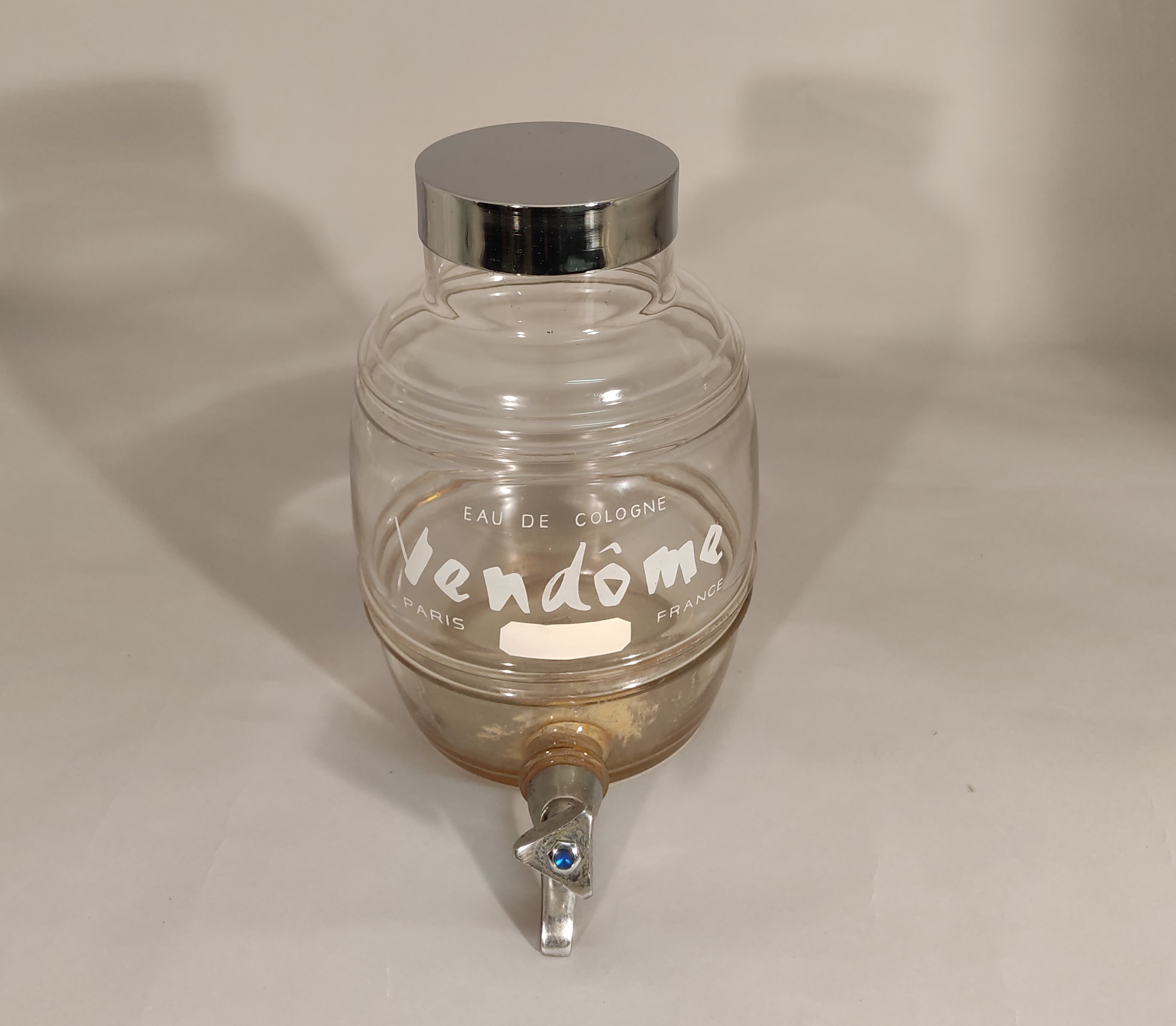 Fontaine en verre incolore pressé moulé, destinée à faire remplir son flacon à la demande chez le parfumeur.