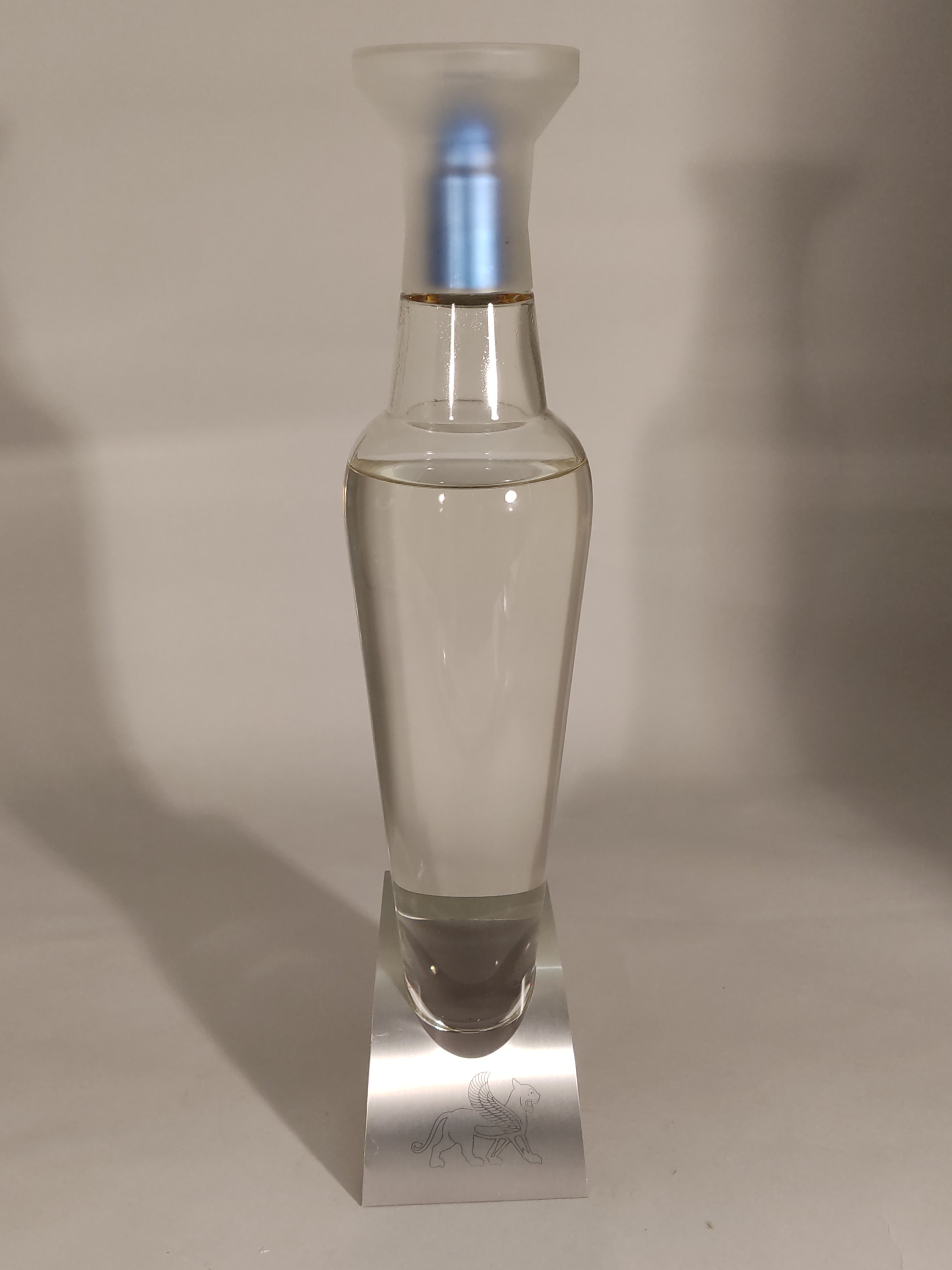 Flacon publicitaire décoratif en verre incolore pressé moulé en forme d'amphore présenté sur son socle en aluminium.